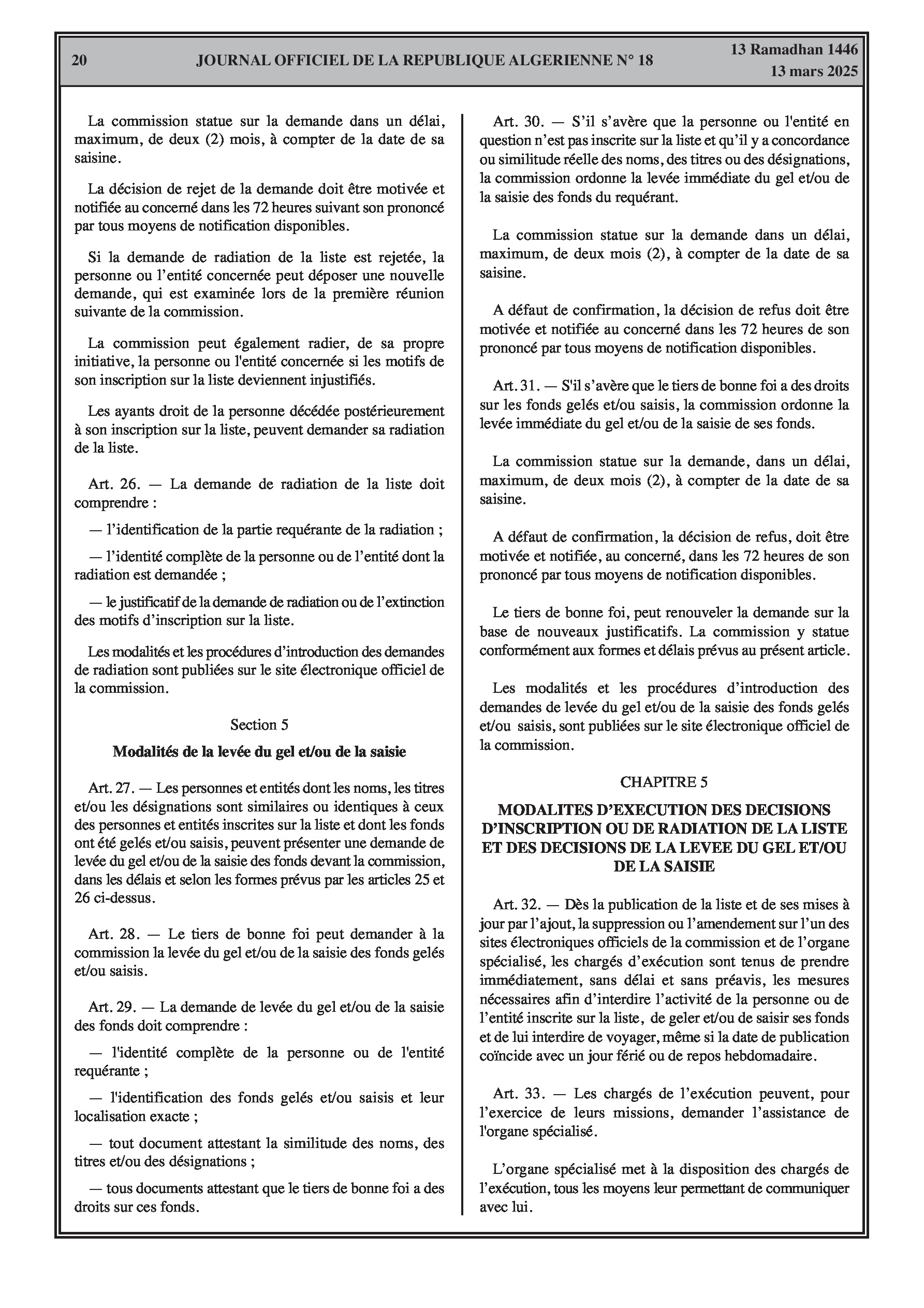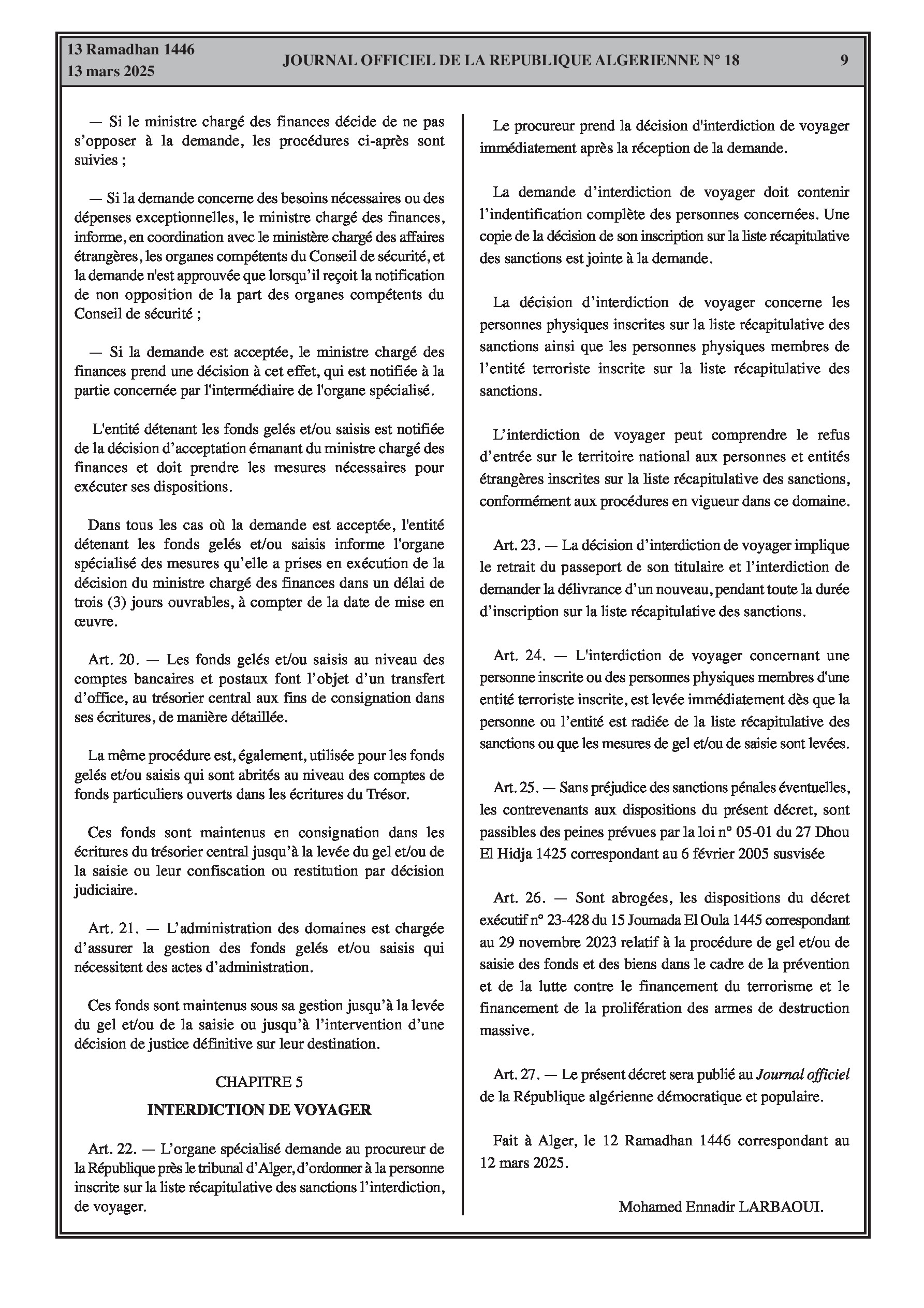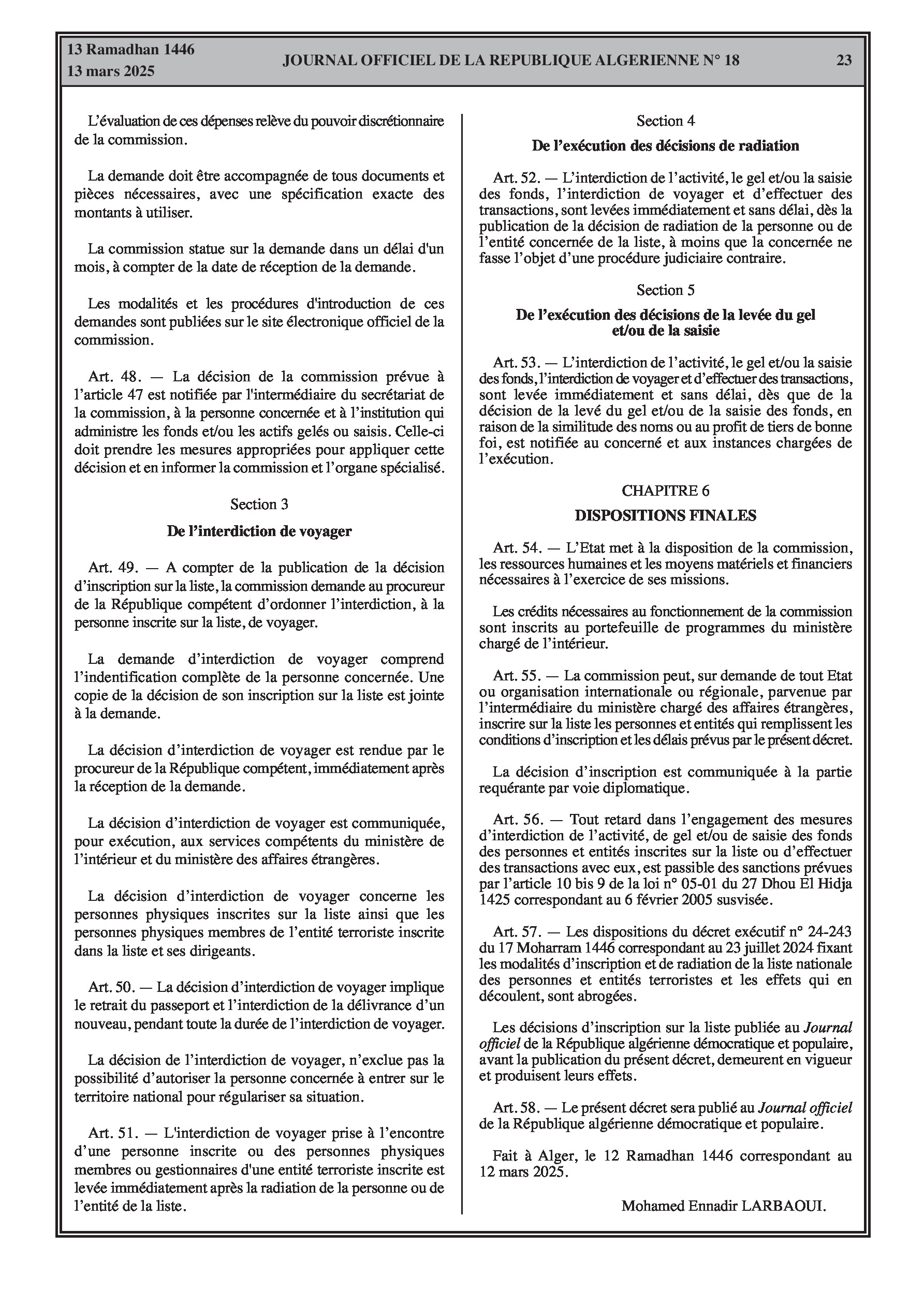 - Définit les procédures de gel ou de saisie des avoirs des personnes et entités inscrites sur les listes de sanctions de l'ONU. - Détaille les mécanismes d'application immédiate, les droits des tiers de bonne foi, et les exemptions pour besoins essentiels et dépenses exceptionnelles. - Réglemente les interdictions de voyager et les transactions financières avec les personnes/entités listées. - Abroge le décret exécutif n° 23-428.