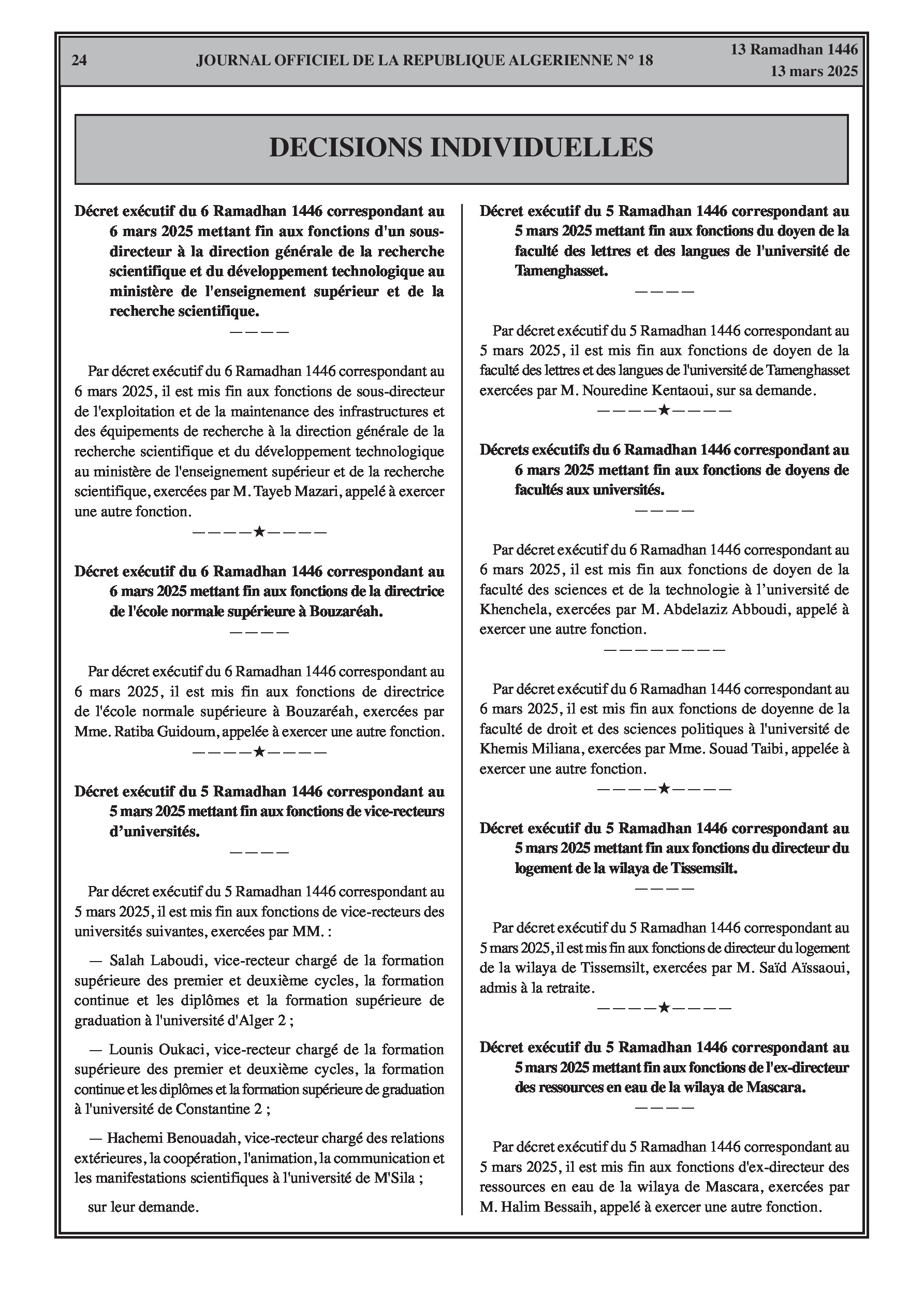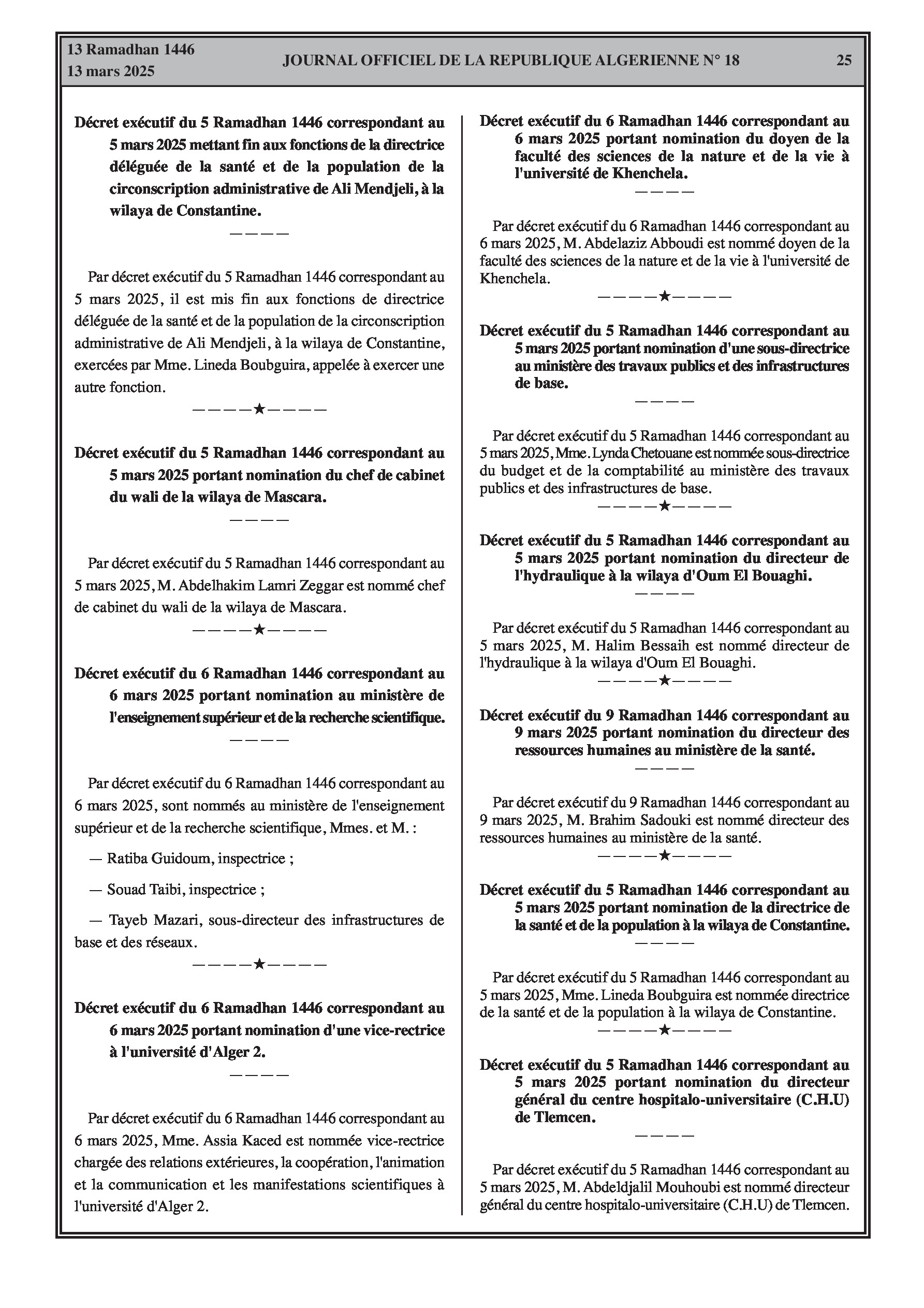 - Fins de fonctions pour des responsables au ministère de l'Enseignement Supérieur, à l'ENS de Bouzaréah, dans des universités, des directions de wilaya (logement Tissemsilt, ressources en eau Mascara), et à la circonscription administrative d'Ali Mendjeli (Constantine). - Nouvelles nominations incluant : chef de cabinet du wali de Mascara, postes au ministère de l'Enseignement Supérieur, vice-rectrice à l'Université d'Alger 2, doyen à l'Université de Khenchela, sous-directrice au ministère des Travaux Publics, directeur de l'hydraulique à Oum El Bouaghi, directeur des ressources humaines au ministère de la Santé, directrice de la santé à Constantine, directeur général du CHU de Tlemcen.