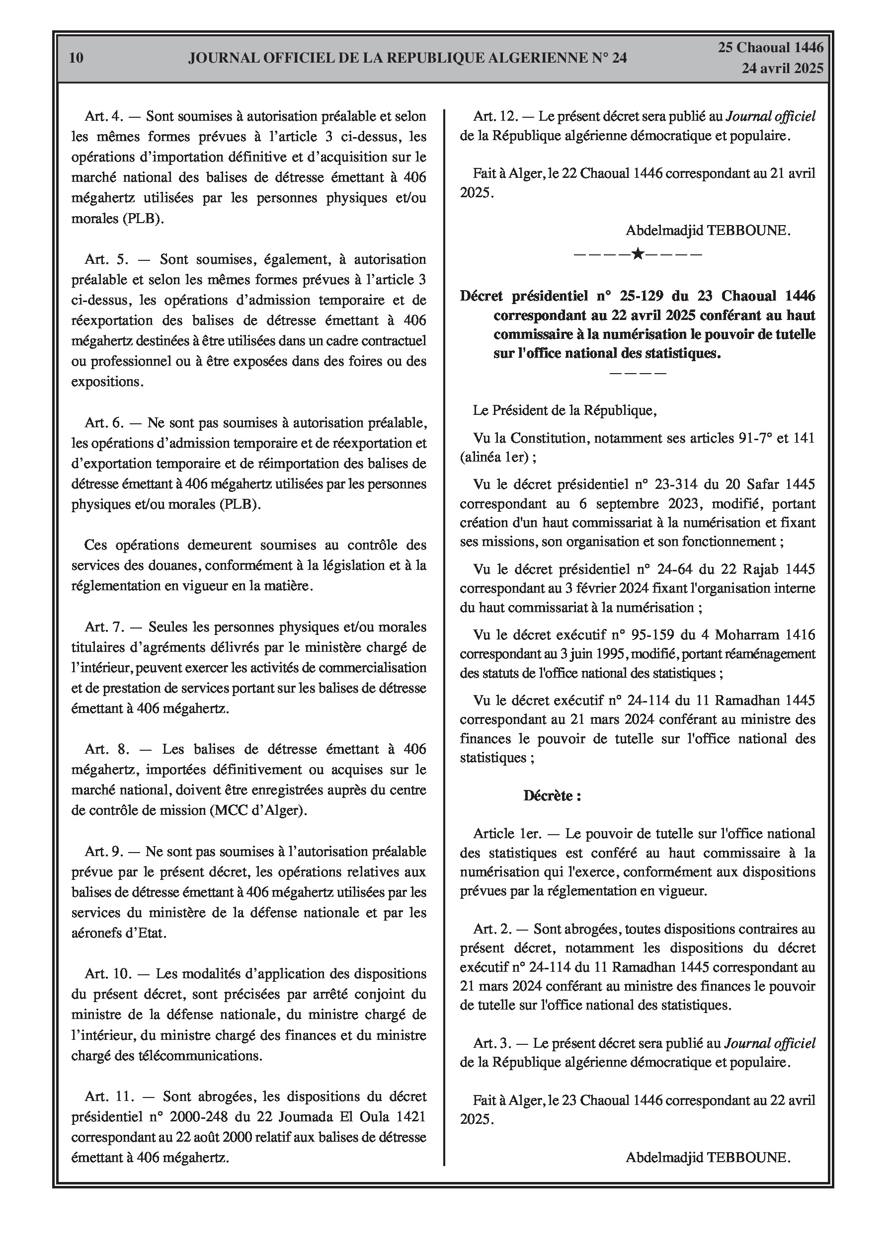 Décret présidentiel régissant les opérations relatives aux balises de détresse émettant à 406 mégahertz.