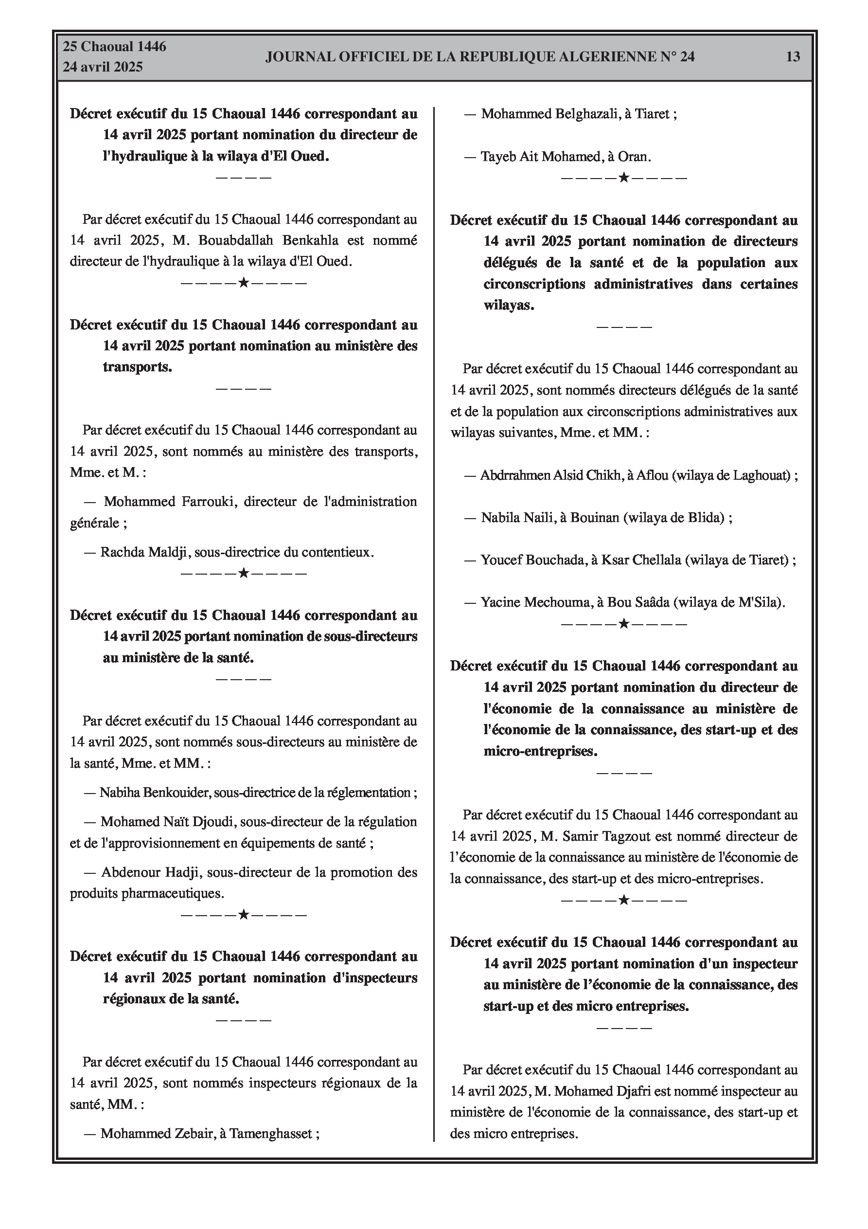Multiples décrets exécutifs couvrant des fins de fonctions et des nominations de directeurs dans les secteurs de l'énergie et des mines, du cadastre, du commerce, des travaux publics, des transports, de l'environnement, ainsi que des nominations aux ministères des Moudjahidine, de la Santé, et de l'Économie de la connaissance, des Start-up et des Micro-entreprises.
