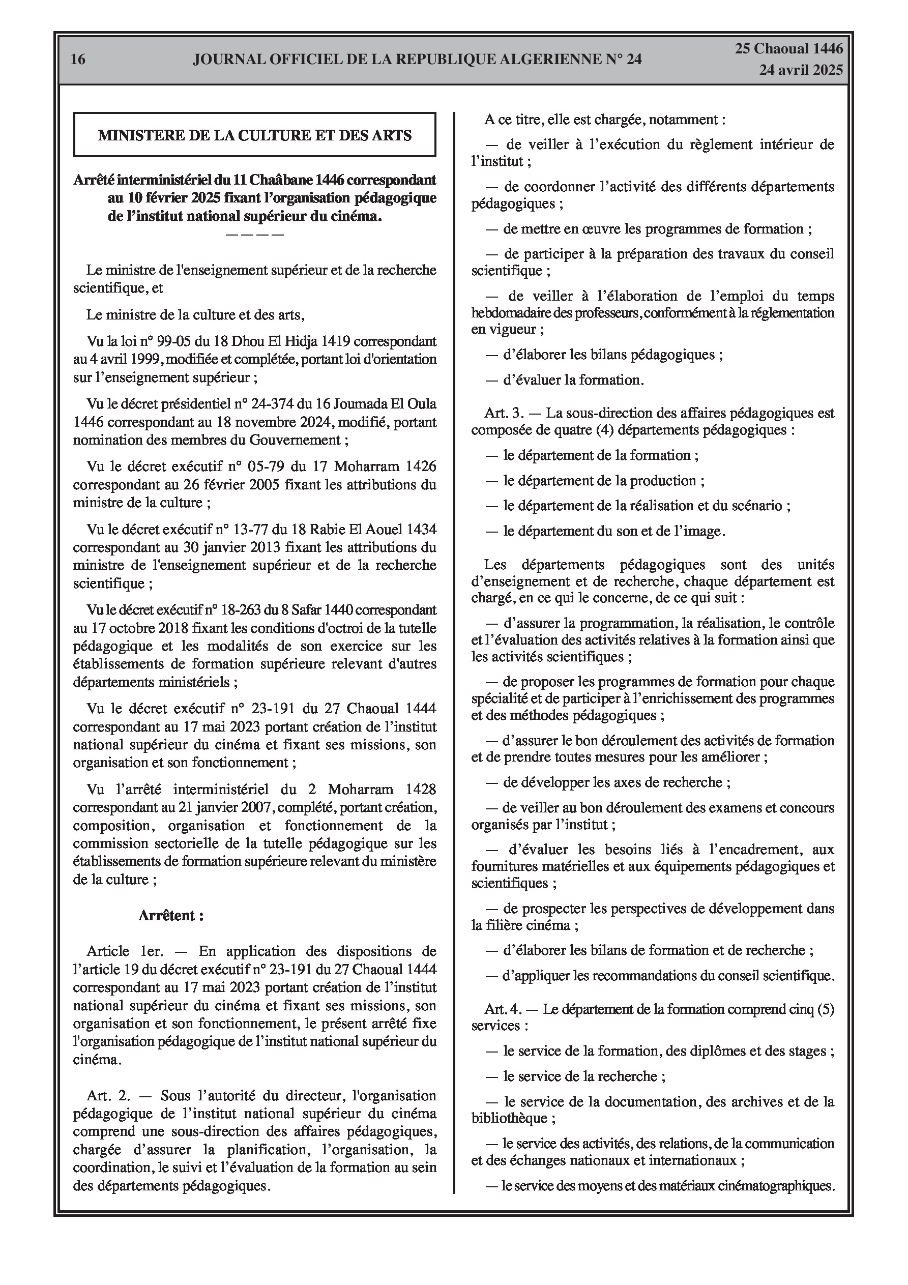 Arrêté interministériel fixant l'organisation pédagogique de l'institut national supérieur du cinéma.