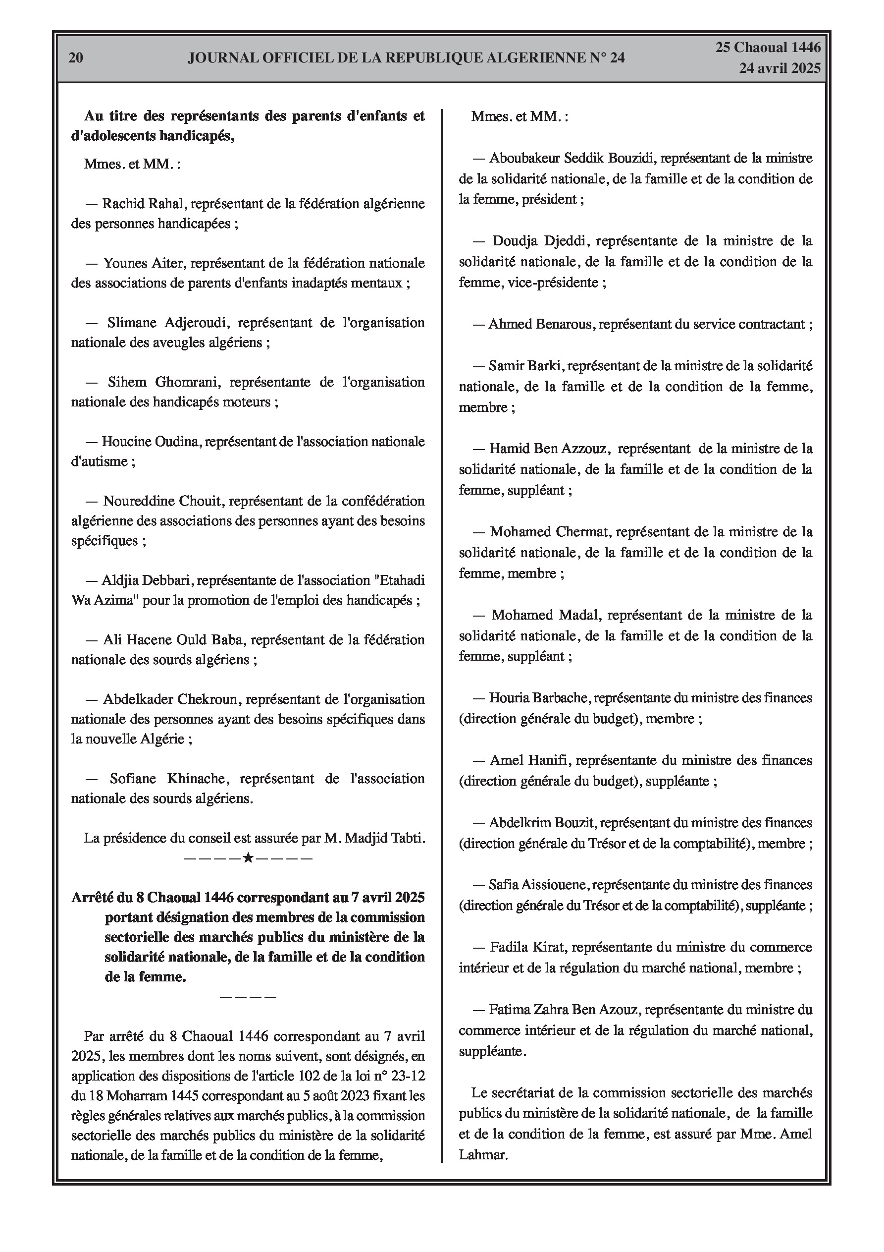 Arrêté de la ministre de la solidarité nationale, de la famille et de la condition de la femme portant nomination des membres du conseil national des personnes ayant des besoins spécifiques.
