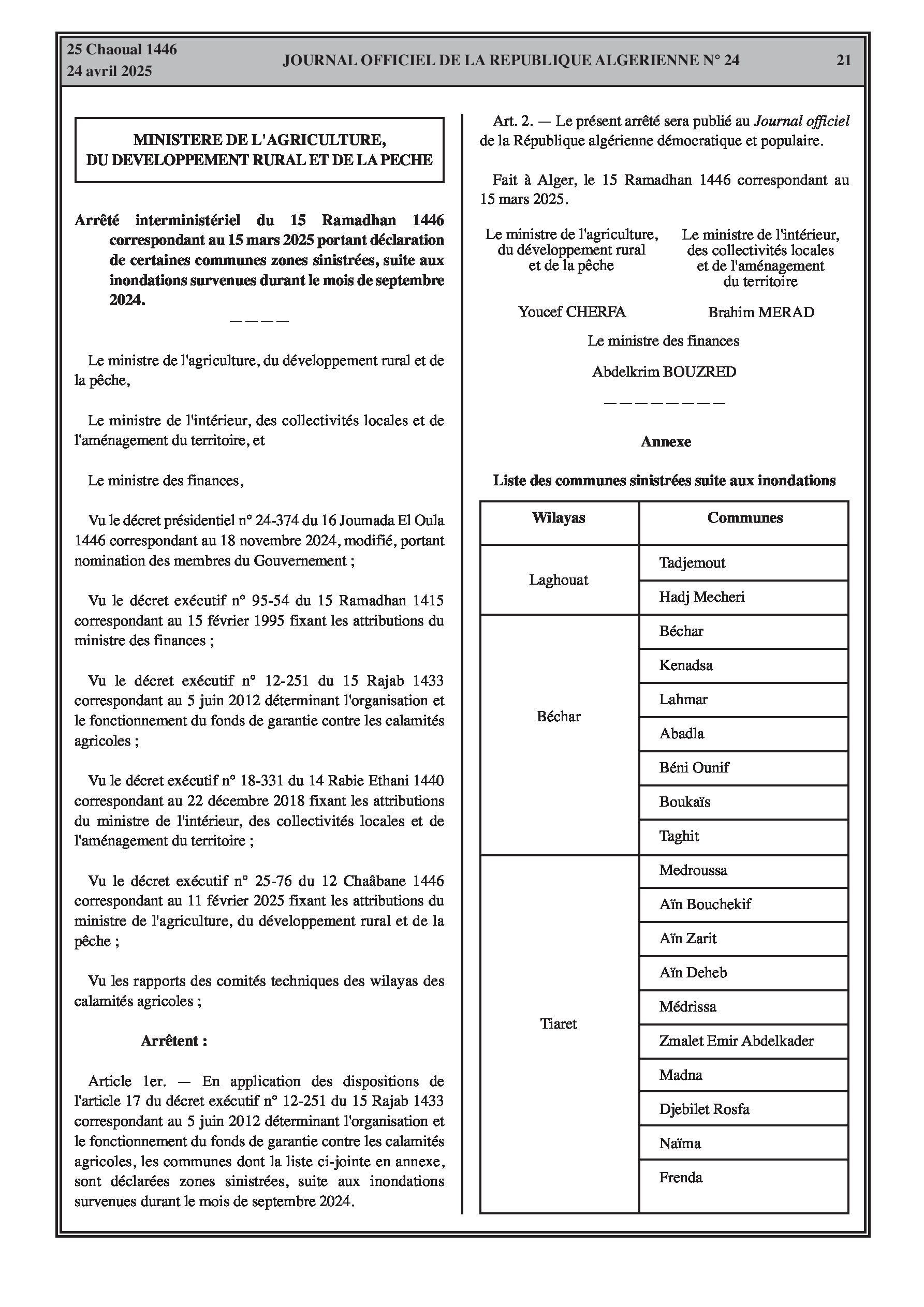 Déclare 46 communes des wilayas de Laghouat, Béchar et Tiaret comme zones sinistrées suite aux inondations survenues en septembre 2024, sur la base des rapports des comités techniques de wilaya des calamités agricoles.