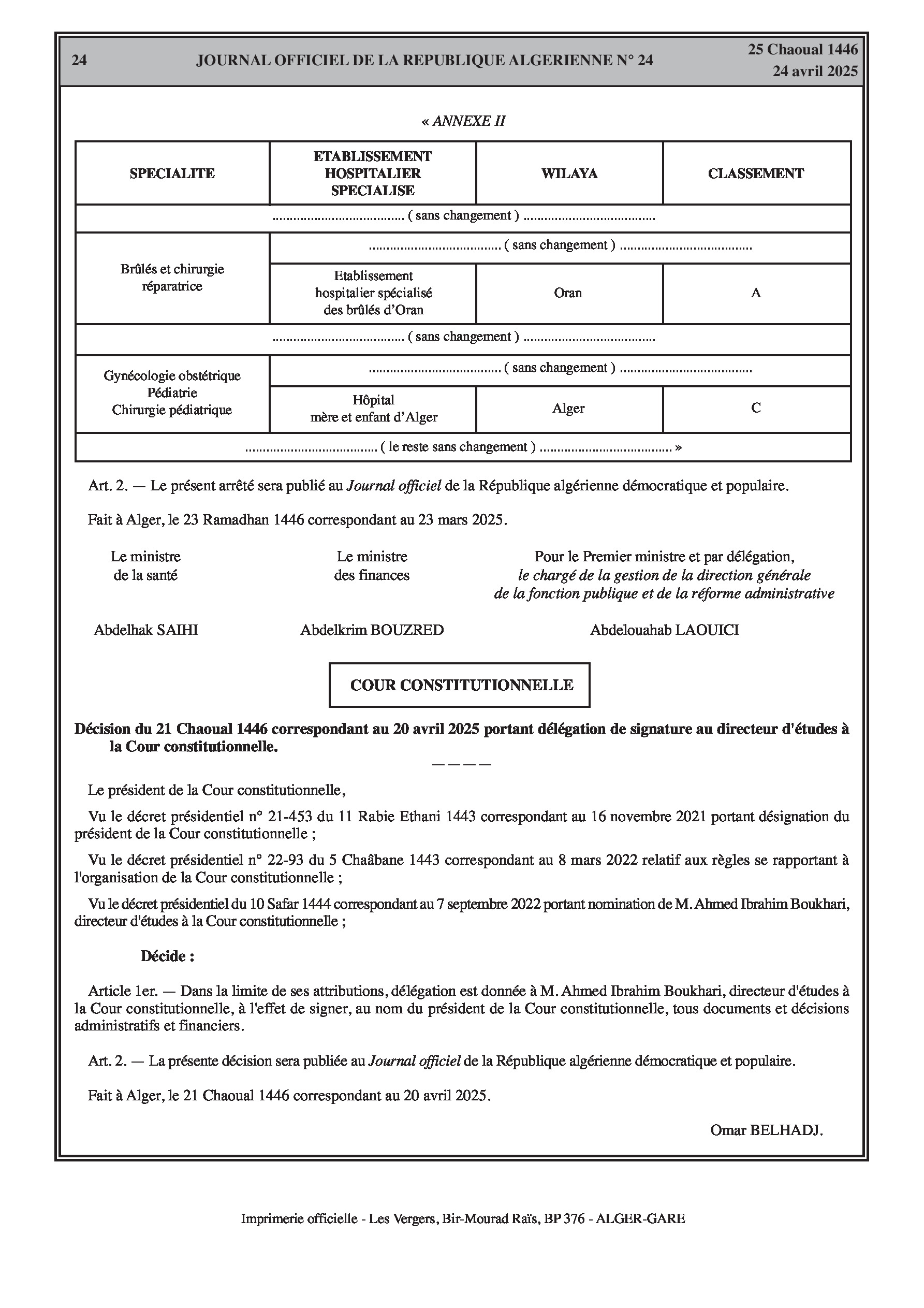 Le président de la Cour constitutionnelle délègue au directeur d'études à la Cour constitutionnelle, M. Ahmed Ibrahim Boukhari, le pouvoir de signer, en son nom, tous documents et décisions administratifs et financiers, dans la limite de ses attributions.