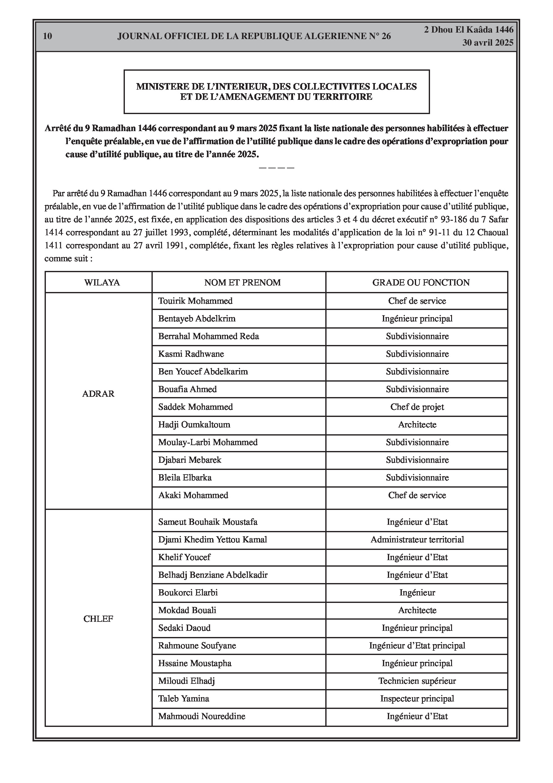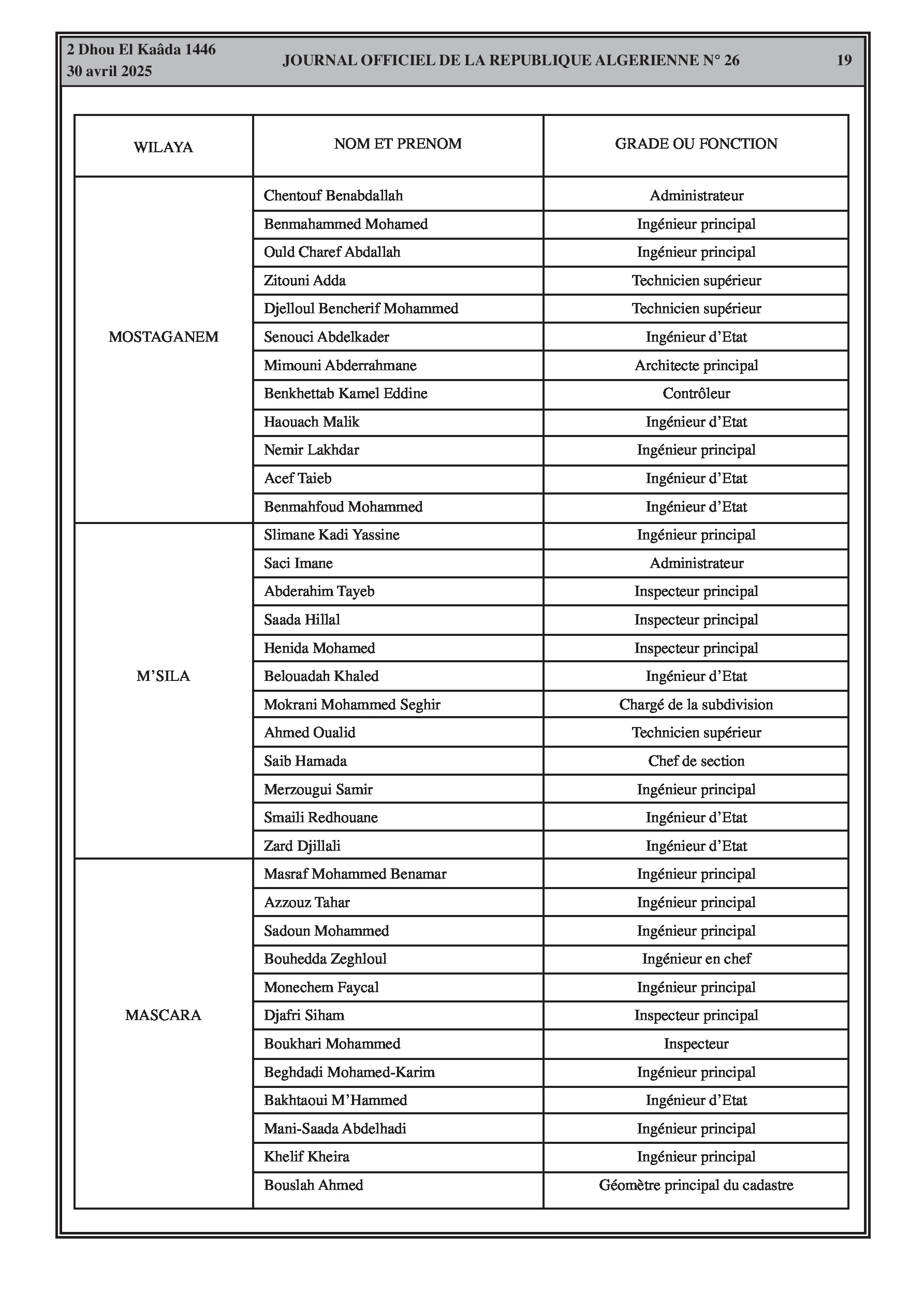 Décisions individuelles comprenant l'octroi de la nationalité algérienne à plusieurs personnes, ainsi que la fin de fonctions et la nomination de responsables à divers postes, notamment des directeurs d'équipements publics, des transports, de la santé, de la promotion des droits de l'enfant, des secrétaires généraux de communes et d'universités, et des doyens de facultés.
