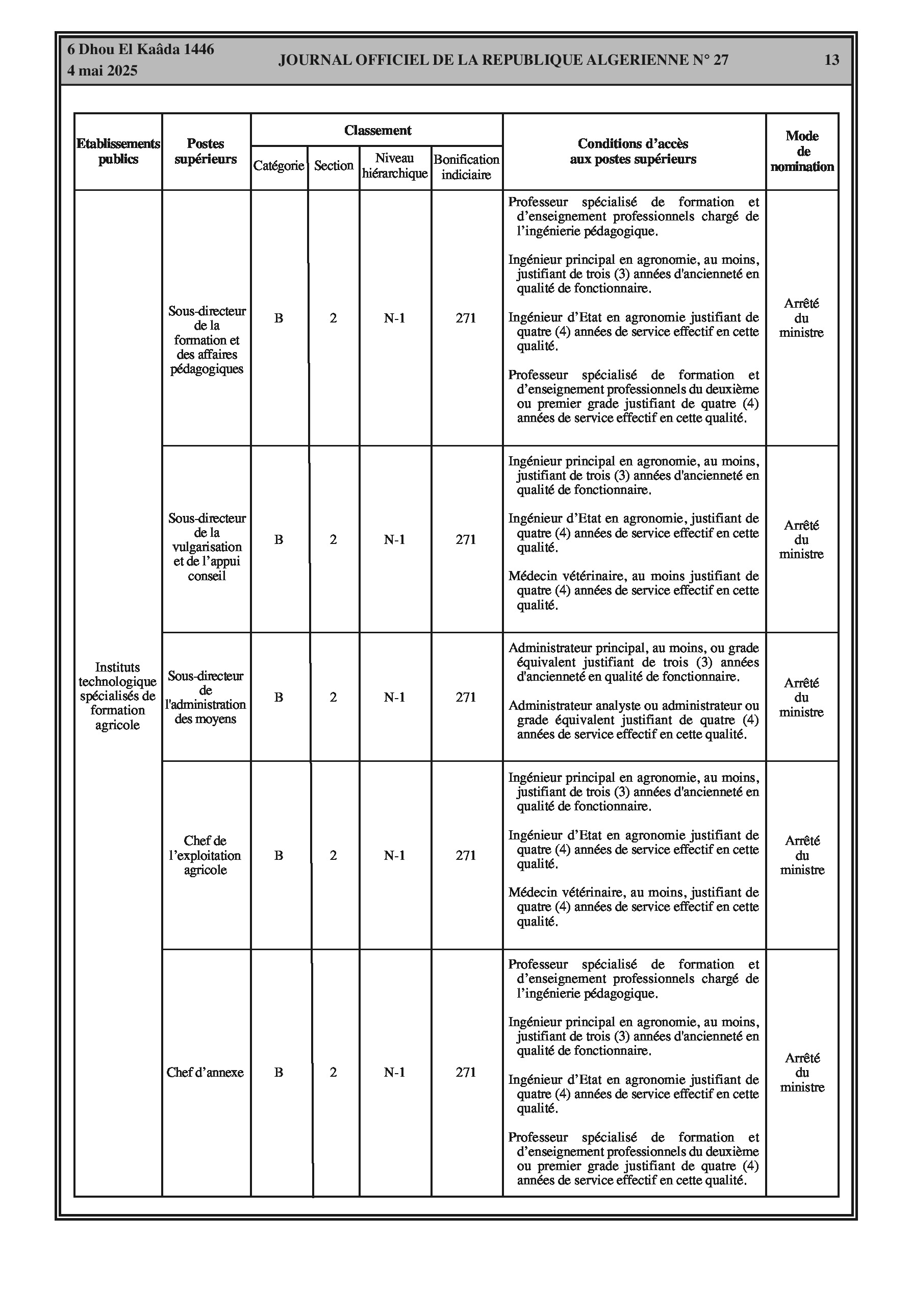 Arrêté interministériel fixant la classification des instituts technologiques spécialisés de formation agricole et les conditions d'accès aux postes supérieurs en relevant.
