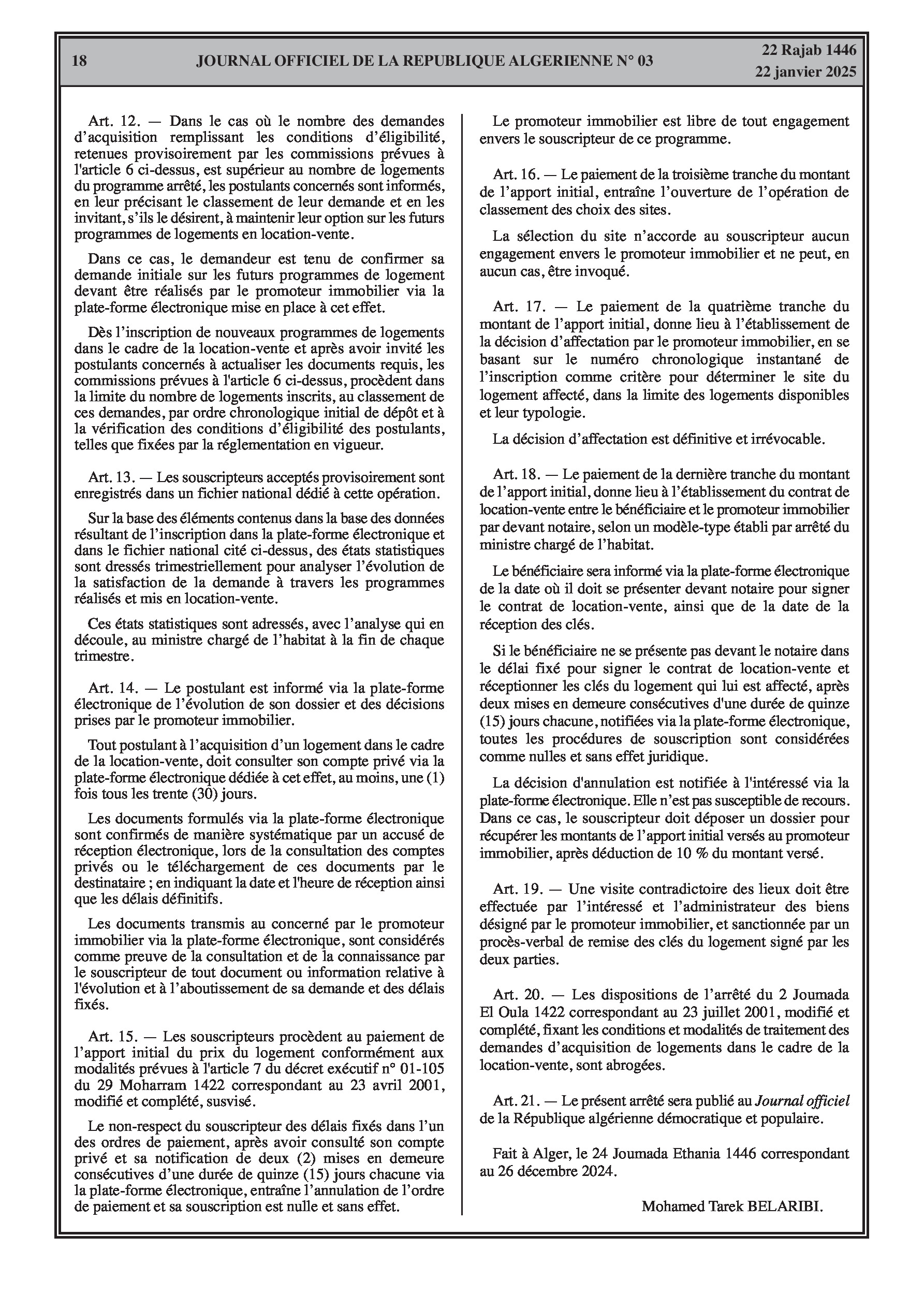L'arrêté définit les conditions et modalités de traitement de la demande d'un « KAFIL » (garant) pour le paiement des mensualités échues d'un bénéficiaire d'un logement en location-vente prouvant son incapacité ou son insolvabilité financière. Le KAFIL doit justifier d'un revenu suffisant et résider en Algérie. La demande est présentée via la plateforme électronique du promoteur immobilier.