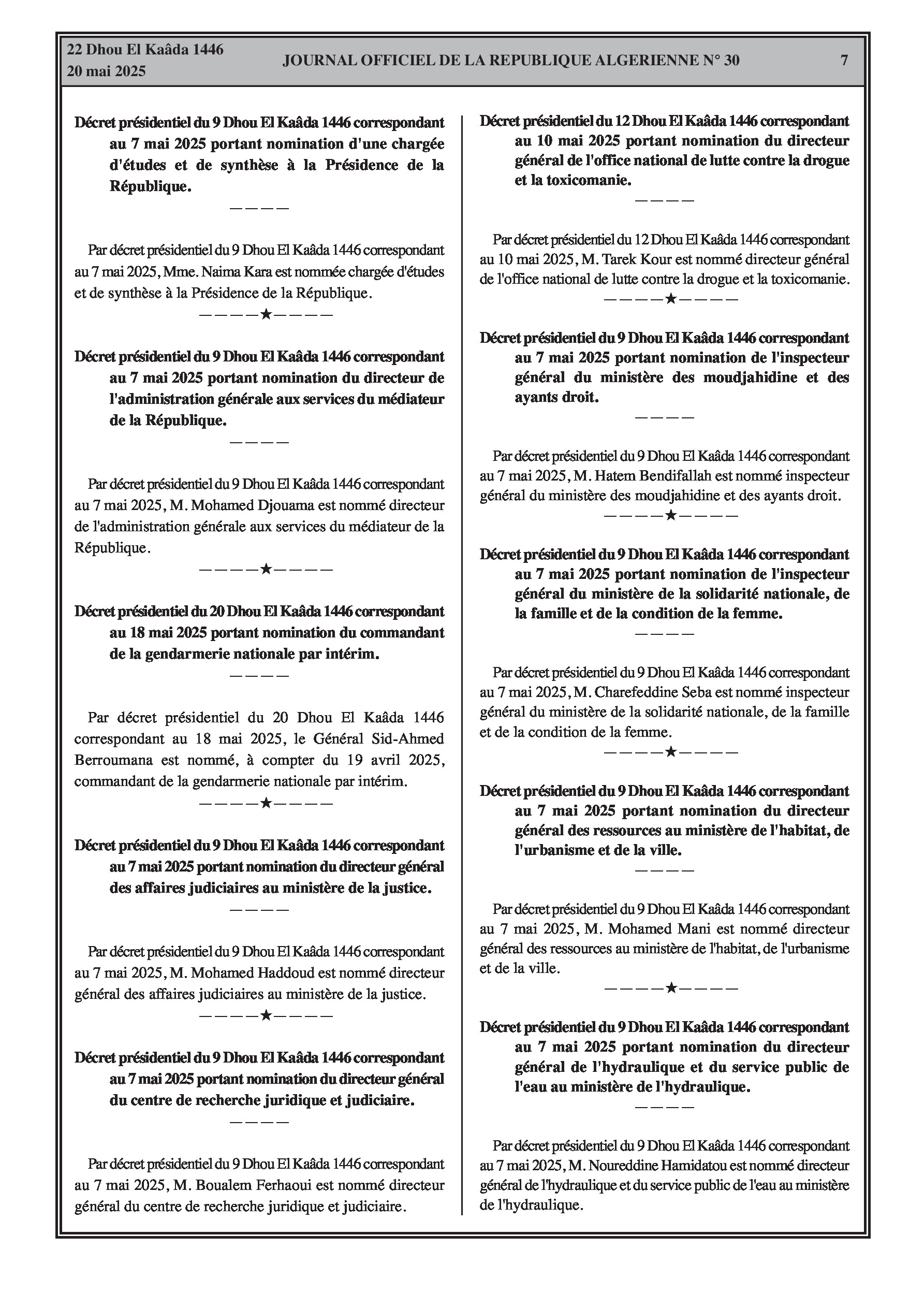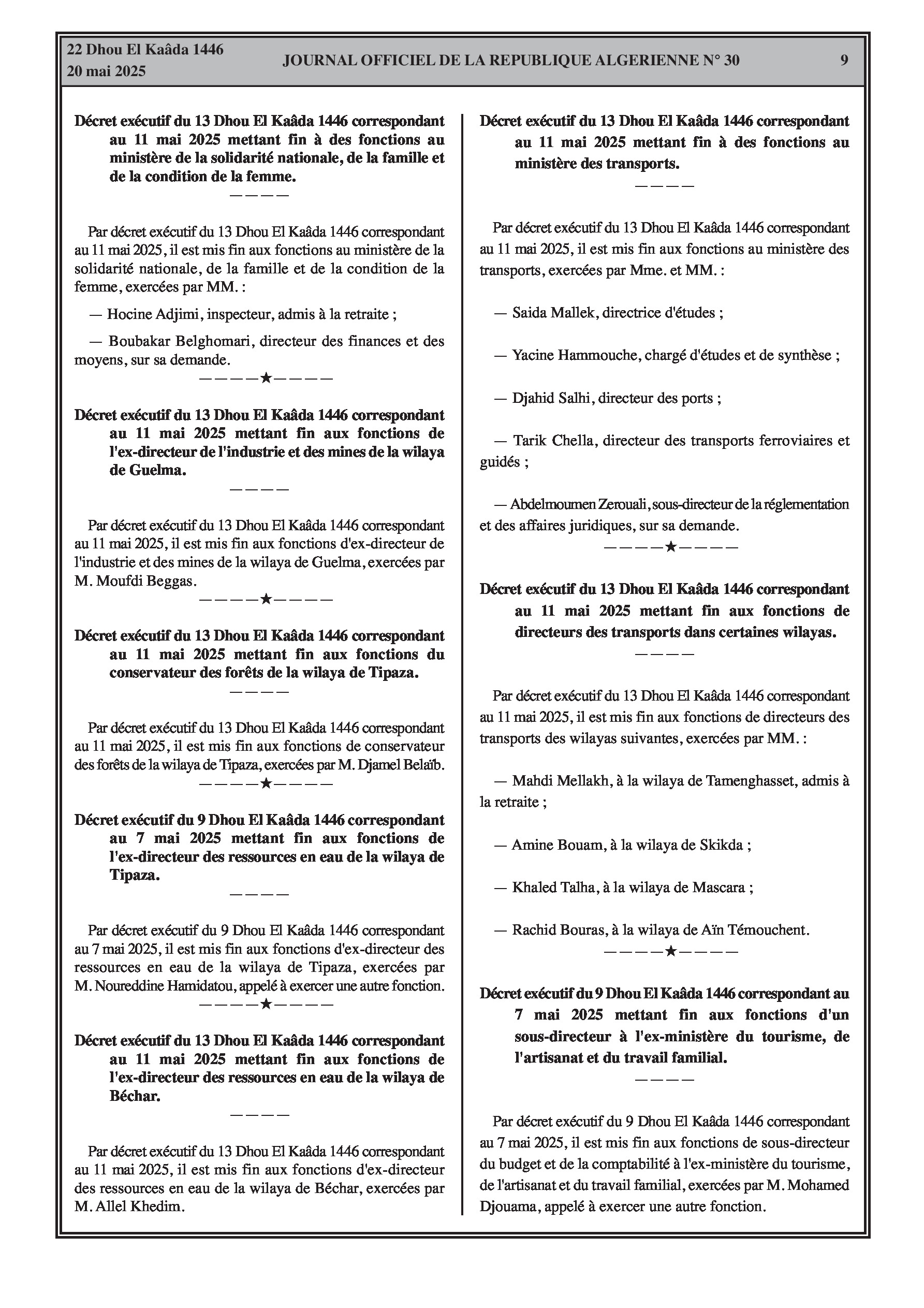 - Fins de fonctions et nominations dans les ministères (Intérieur, Justice, Moudjahidine, Solidarité, Habitat, Ressources en eau, Transports, Culture, Poste, Environnement, Investissement).