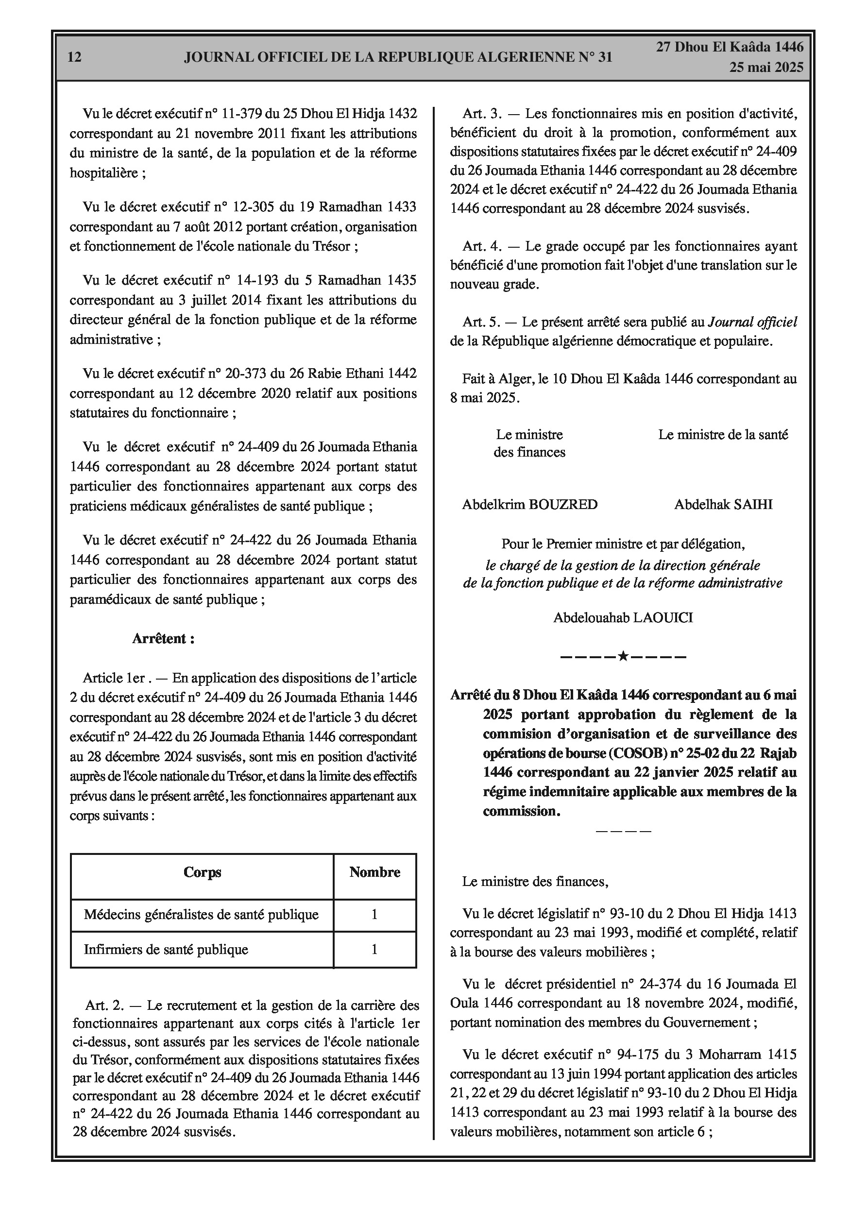 Arrêté interministériel du 10 Dhou El Kaâda 1446 correspondant au 8 mai 2025 portant placement en position d'activité auprès de l'école nationale du Trésor de certains corps spécifiques du ministère de la santé. Arrêté du 8 Dhou El Kaâda 1446 correspondant au 6 mai 2025 portant approbation du règlement de la commission d'organisation et de surveillance des opérations de bourse (COSOB) n° 25-02 relatif au régime indemnitaire applicable aux membres de la commission.
