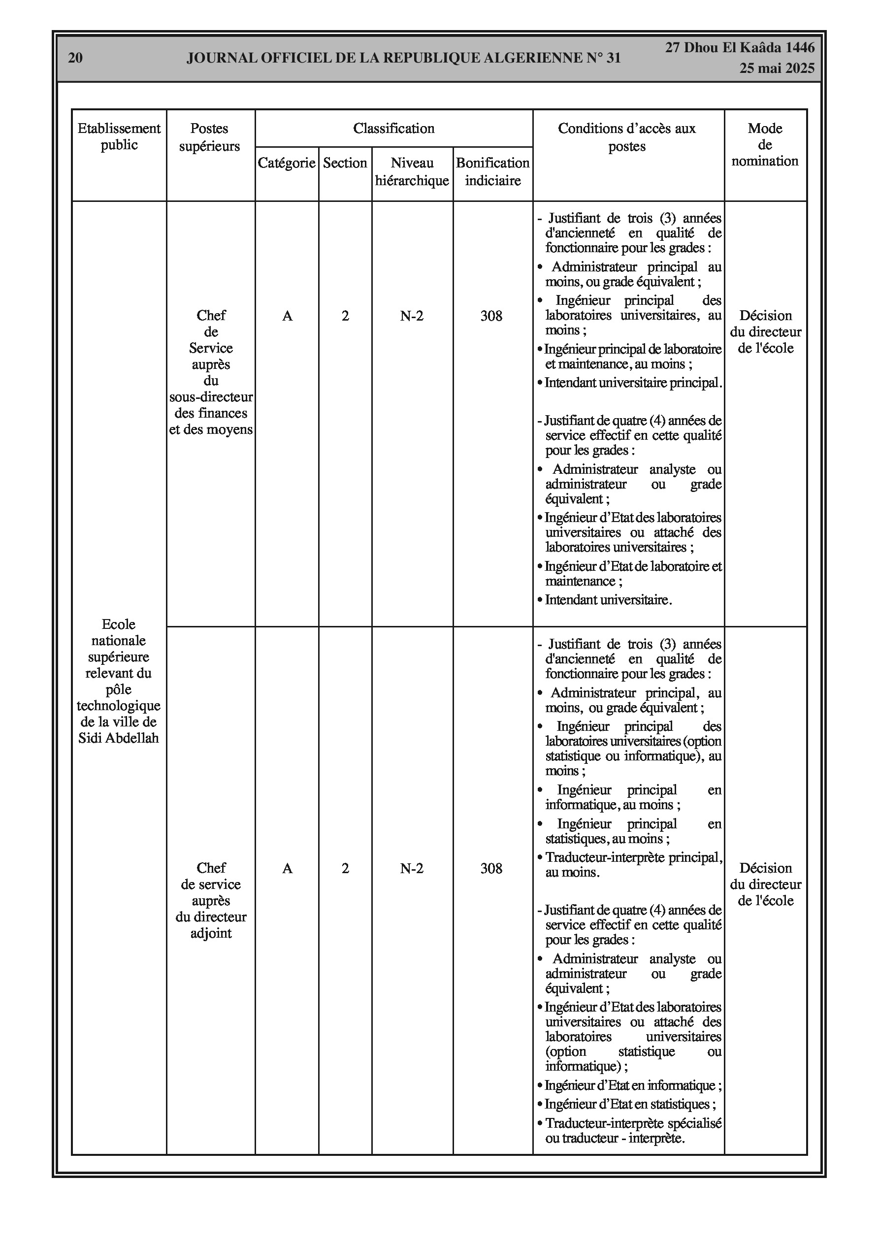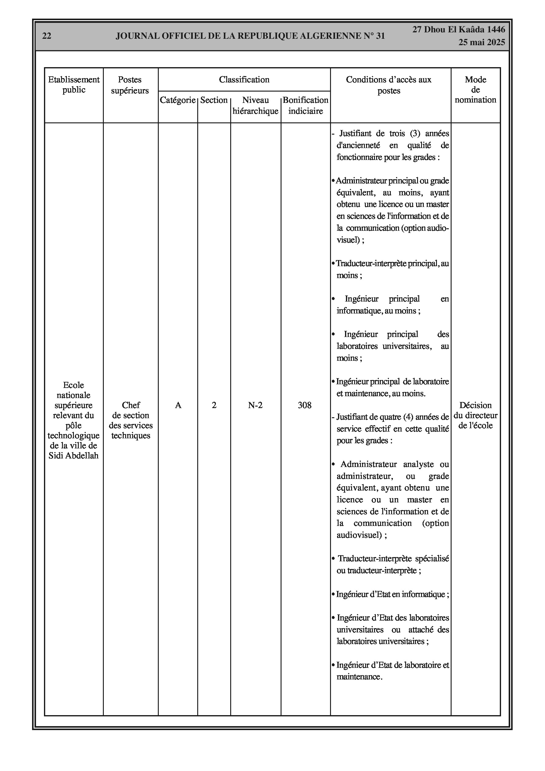 Arrêté interministériel du 7 Dhou El Kaâda 1446 correspondant au 5 mai 2025 fixant la classification de l'école nationale supérieure relevant du pôle technologique de la ville de Sidi Abdellah et les conditions d'accès aux postes supérieurs en relevant. Comprend des tableaux détaillés sur la classification, les conditions d'accès et la bonification indiciaire des postes supérieurs.