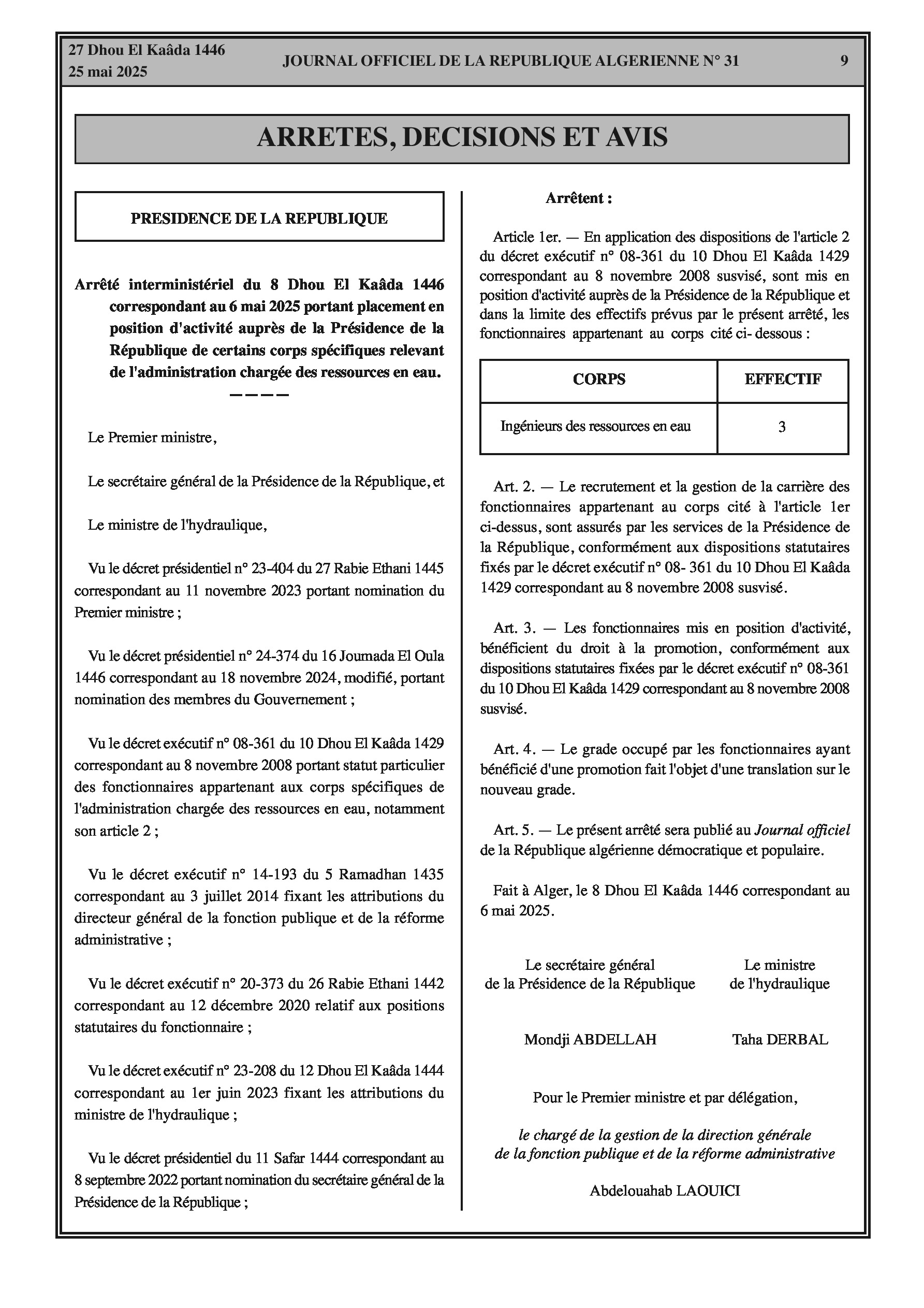 Arrêté interministériel du 8 Dhou El Kaâda 1446 correspondant au 6 mai 2025 portant placement en position d'activité auprès de la Présidence de la République de certains corps spécifiques relevant de l'administration chargée des ressources en eau.