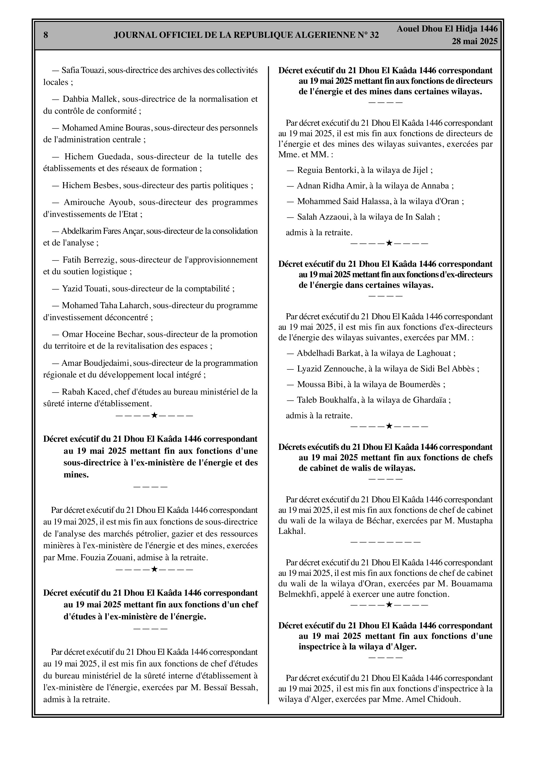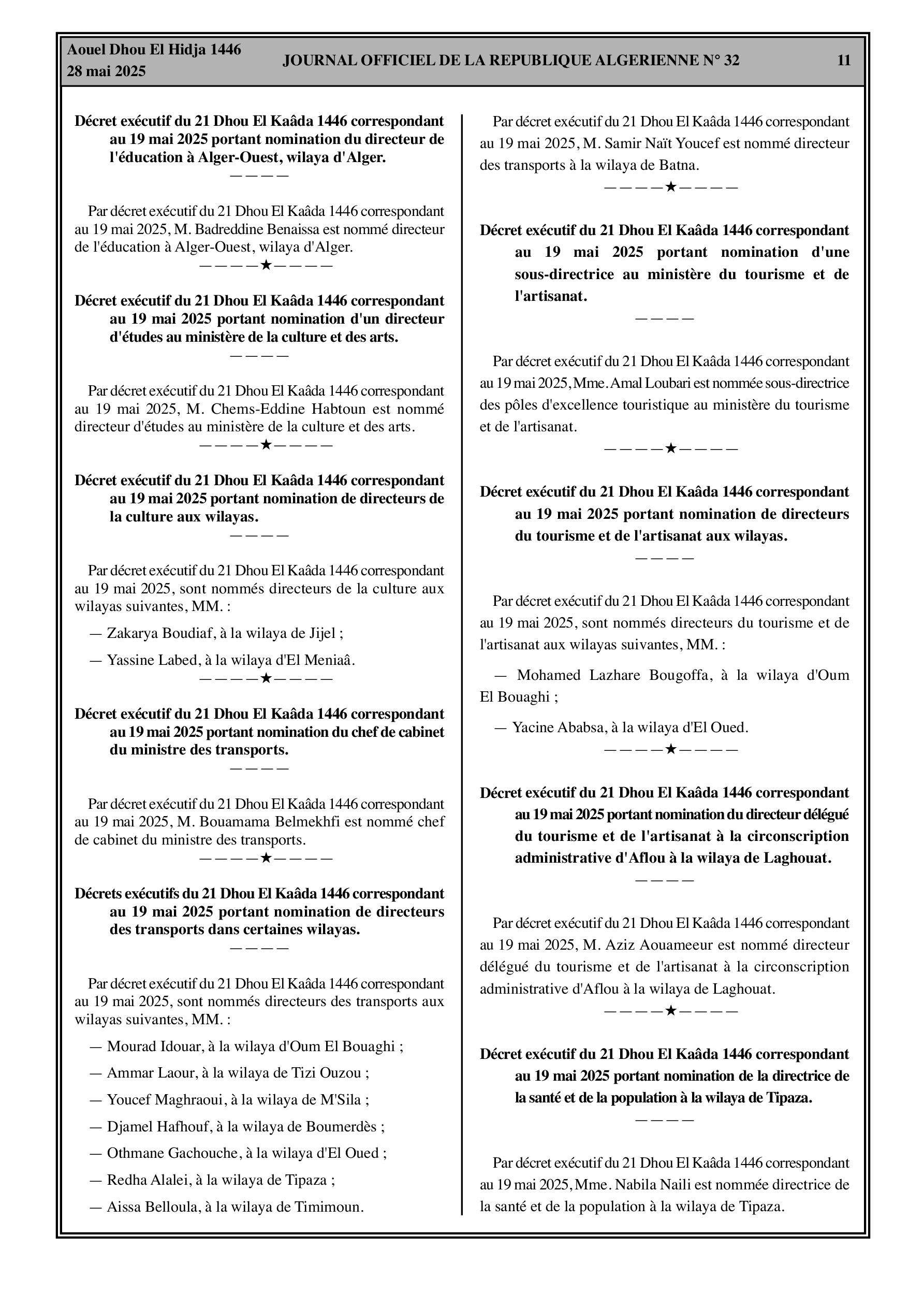 Fins de fonctions d'ambassadeurs et consuls (p 6-7), nomination d'un nouvel ambassadeur (p 7), fins de fonctions et nominations au ministère de l'Intérieur et des Collectivités locales (p 7-8), fins de fonctions à l'ex-ministère de l'Energie et des Mines (p 8), fins de fonctions de chefs de cabinet de walis et d'une inspectrice à la wilaya d'Alger (p 8), fins de fonctions de directeurs de la protection civile, d'un inspecteur au ministère des Moudjahidine et d'un ex-directeur des moudjahidine (p 9), fin de fonctions d'un directeur de l'éducation (p 9), fins de fonctions au ministère de la Formation et de l'Enseignement professionnels, de directeurs de la culture et d'un directeur d'institut national (p 9), fins de fonctions de directeurs des transports, de directeurs et chargé d'études au ministère du Tourisme, et de directeurs délégués de la santé et de la population (p 10), nominations au ministère de l'Enseignement supérieur, au ministère de la Culture, et de directeurs de la culture, des transports, du tourisme et de la santé (p 10-11).