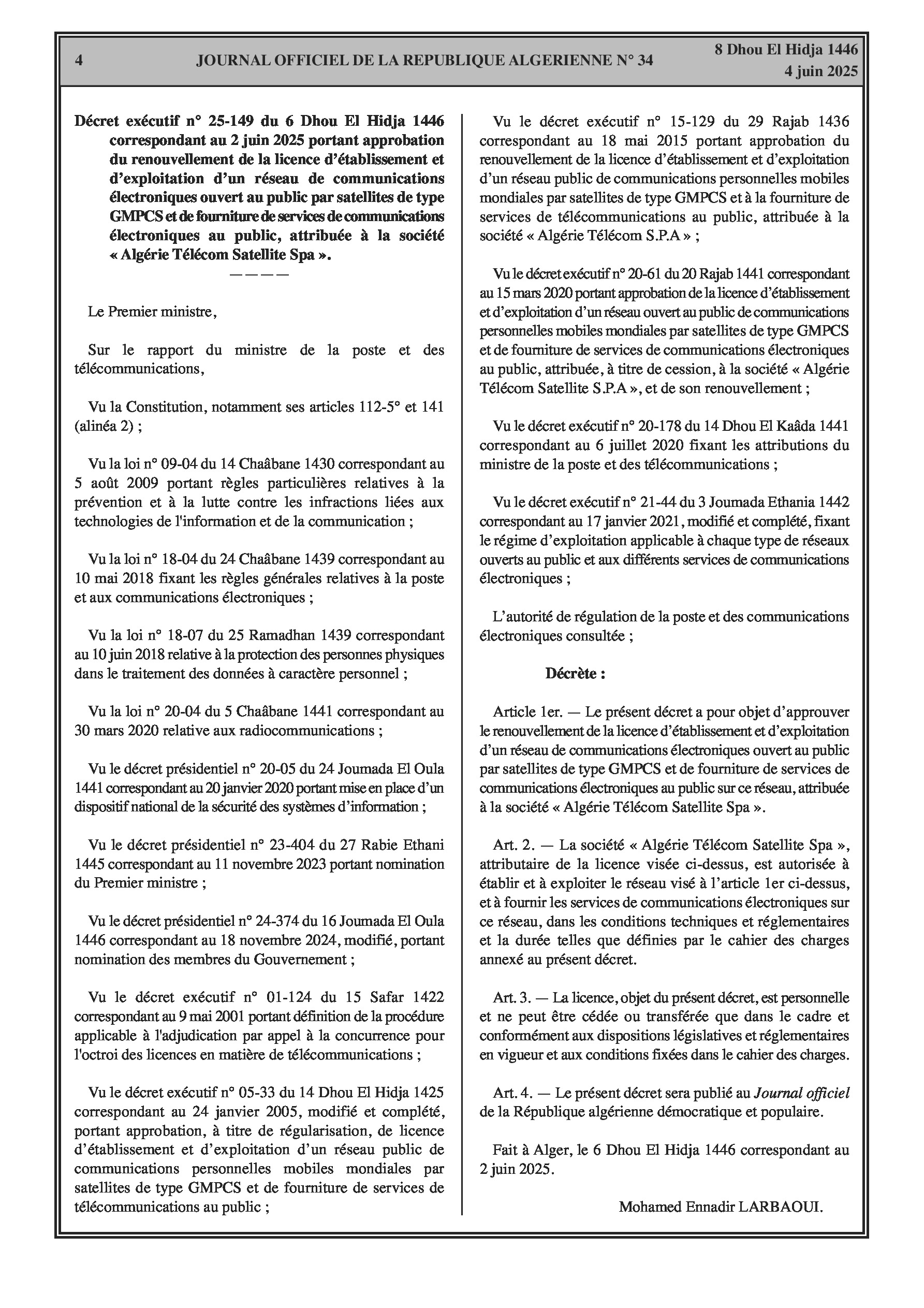 Décret exécutif approuvant le renouvellement de la licence d'Algérie Télécom Satellite Spa pour l'établissement et l'exploitation d'un réseau de communications électroniques ouvert au public par satellites de type GMPCS.