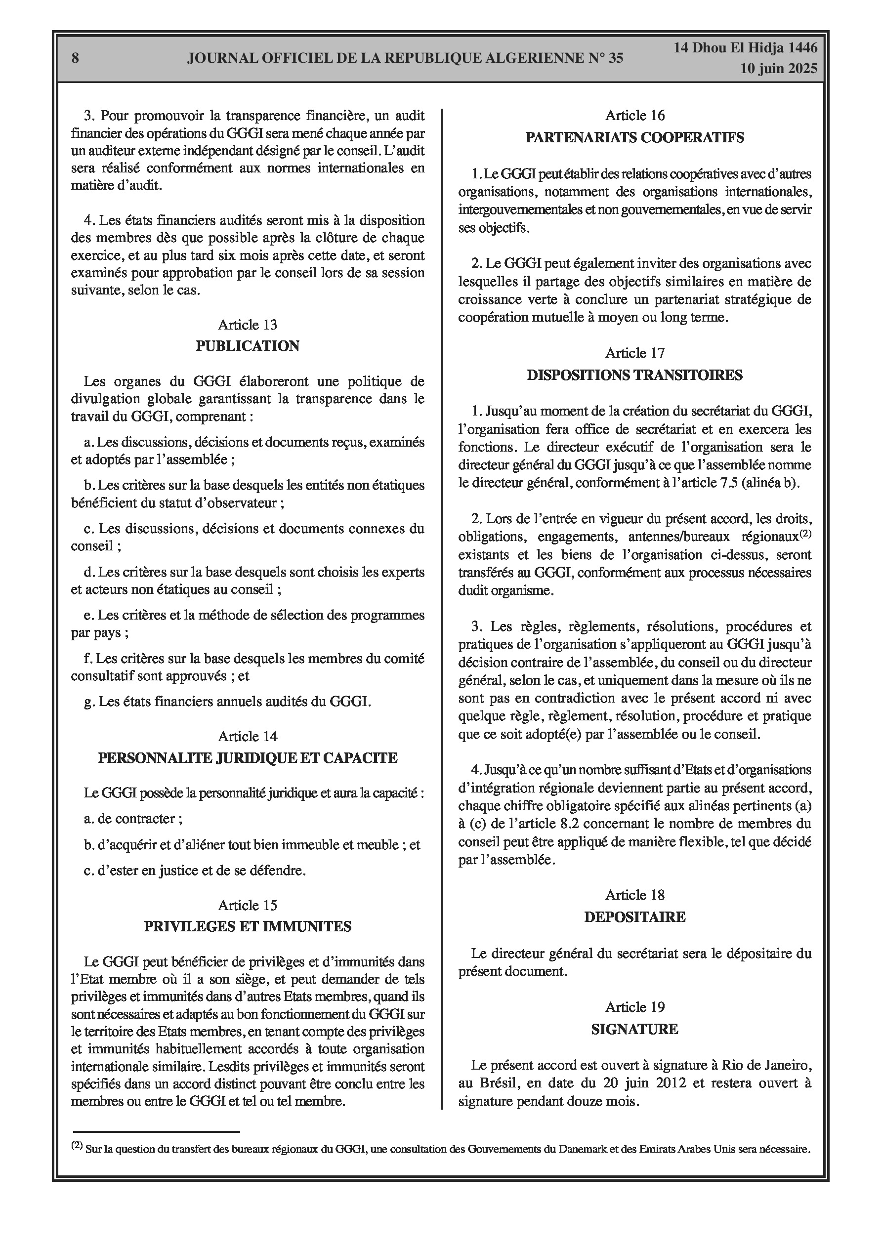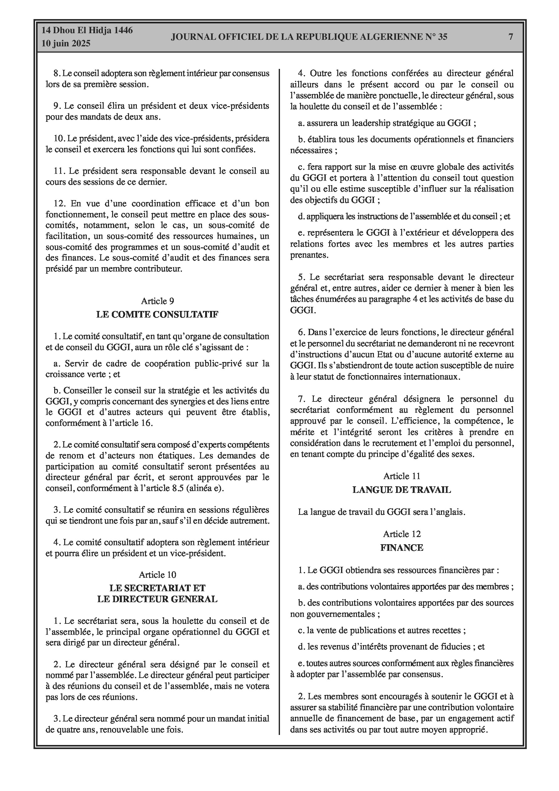 Le décret présidentiel n° 25-146 officialise l'adhésion de l'Algérie à l'accord portant création de l'Institut Mondial de la Croissance Verte, signé à Rio de Janeiro le 20 juin 2012. Le GGGI vise à soutenir les pays en développement dans leur transition vers un modèle de croissance verte, axé sur la performance économique, la réduction de la pauvreté, la création d'emplois, l'inclusion sociale et la durabilité environnementale.