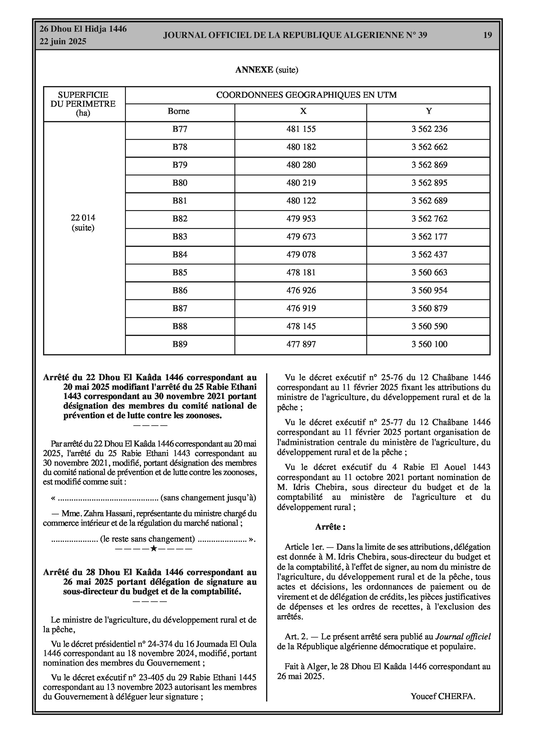 Arrêté interministériel complétant le portefeuille foncier de l'Office de développement de l'agriculture industrielle en terres sahariennes. Ajout d'un nouveau périmètre dans la wilaya d'Adrar (8.123 ha) et de sept (7) nouveaux périmètres dans la wilaya de Ghardaïa (total 36.866 ha). Coordonnées géographiques en annexe. Arrêté modifiant la désignation des membres du comité national de prévention et de lutte contre les zoonoses. Arrêté portant délégation de signature au sous-directeur du budget et de la comptabilité du ministère.