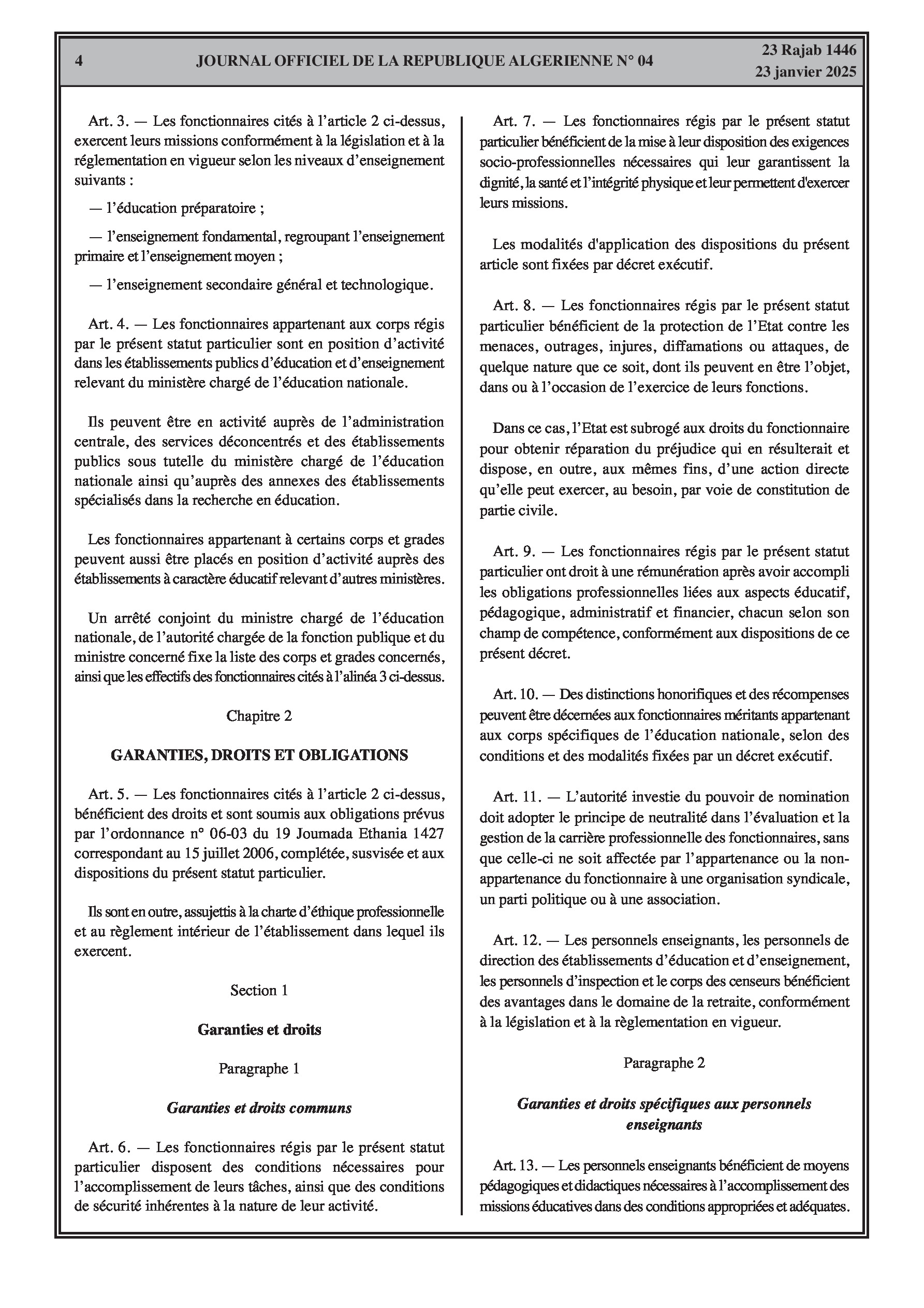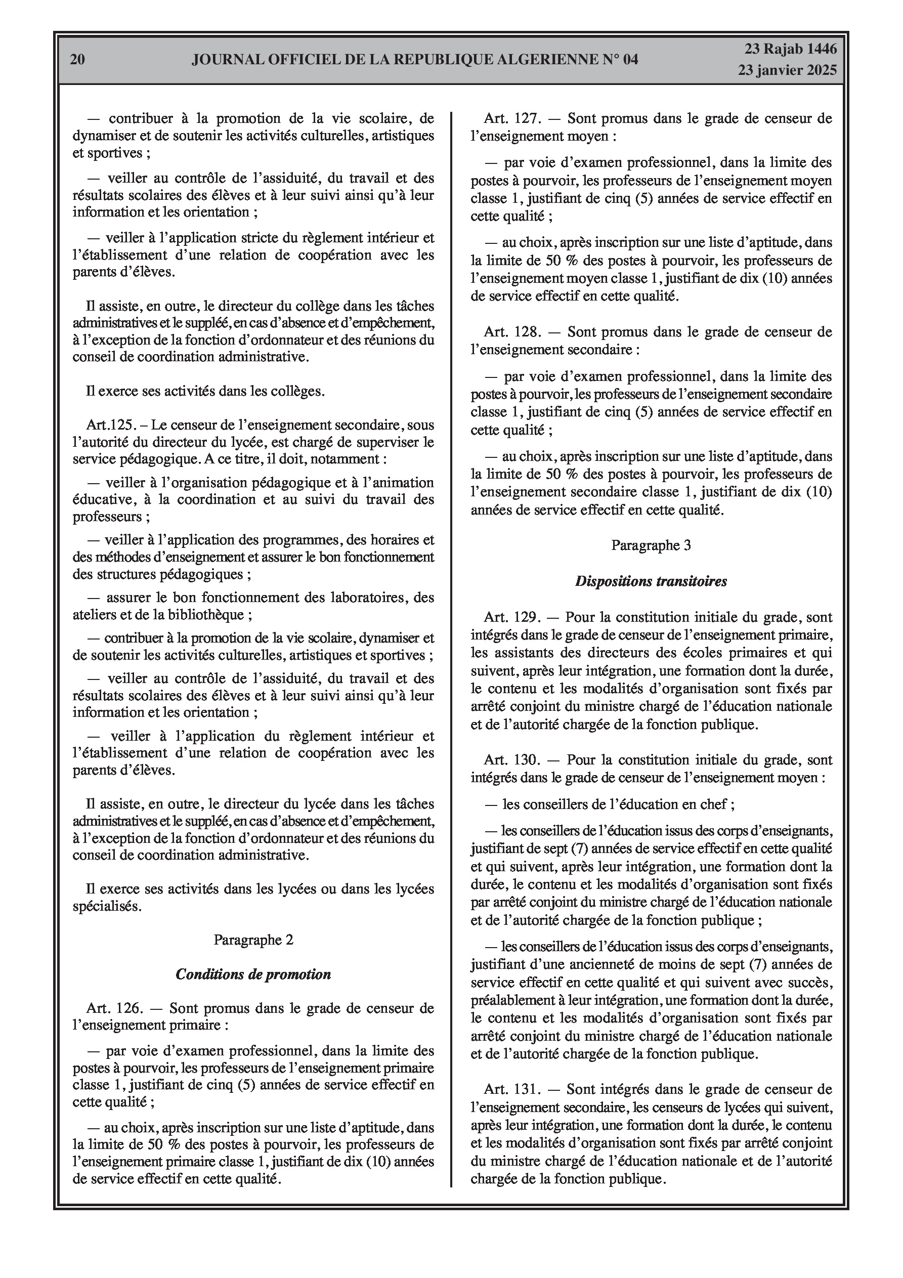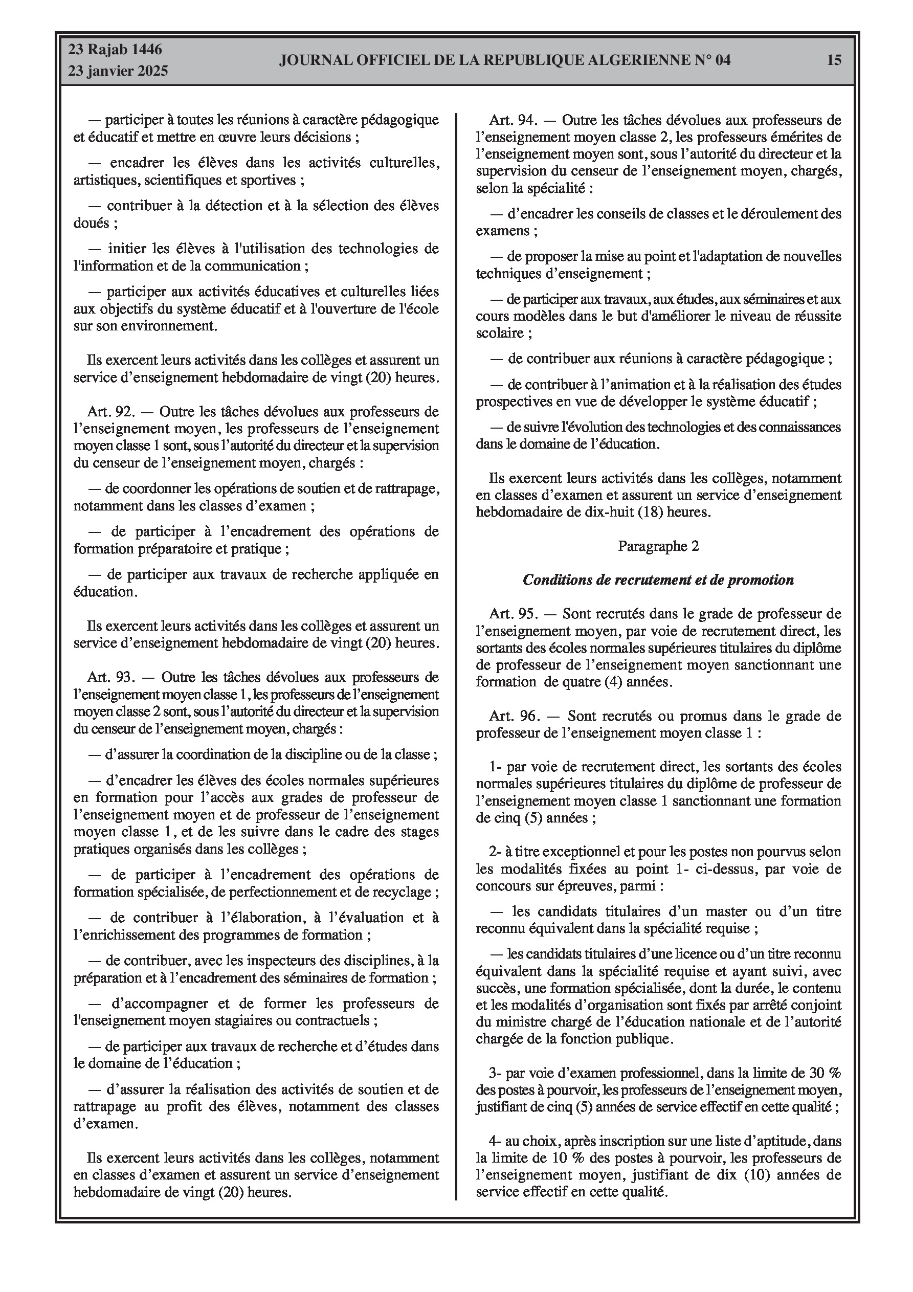 - Décret exécutif n° 25-54 : Définit le nouveau statut particulier applicable aux fonctionnaires des corps spécifiques de l'éducation nationale (enseignants, personnels d'éducation, d'orientation, de laboratoire, d'alimentation scolaire, d'intendance, de direction des établissements, et d'inspection). Détaille les droits et obligations, conditions de recrutement et de promotion, formation, évaluation, mobilité, régime disciplinaire, et procédures d'intégration des personnels actuels. Comprend également la classification de tous les grades et la bonification indiciaire des postes supérieurs (Pages 3-43).