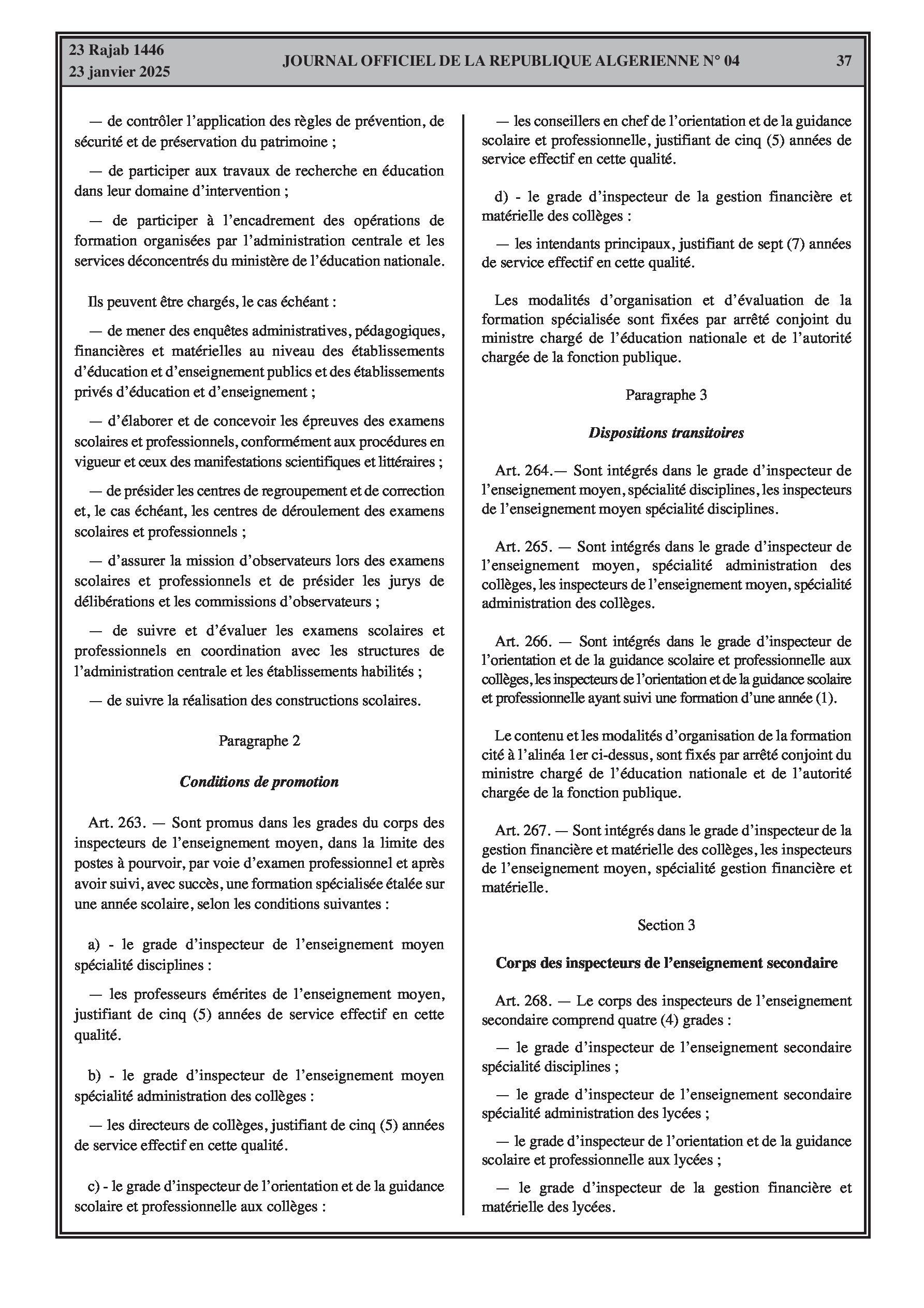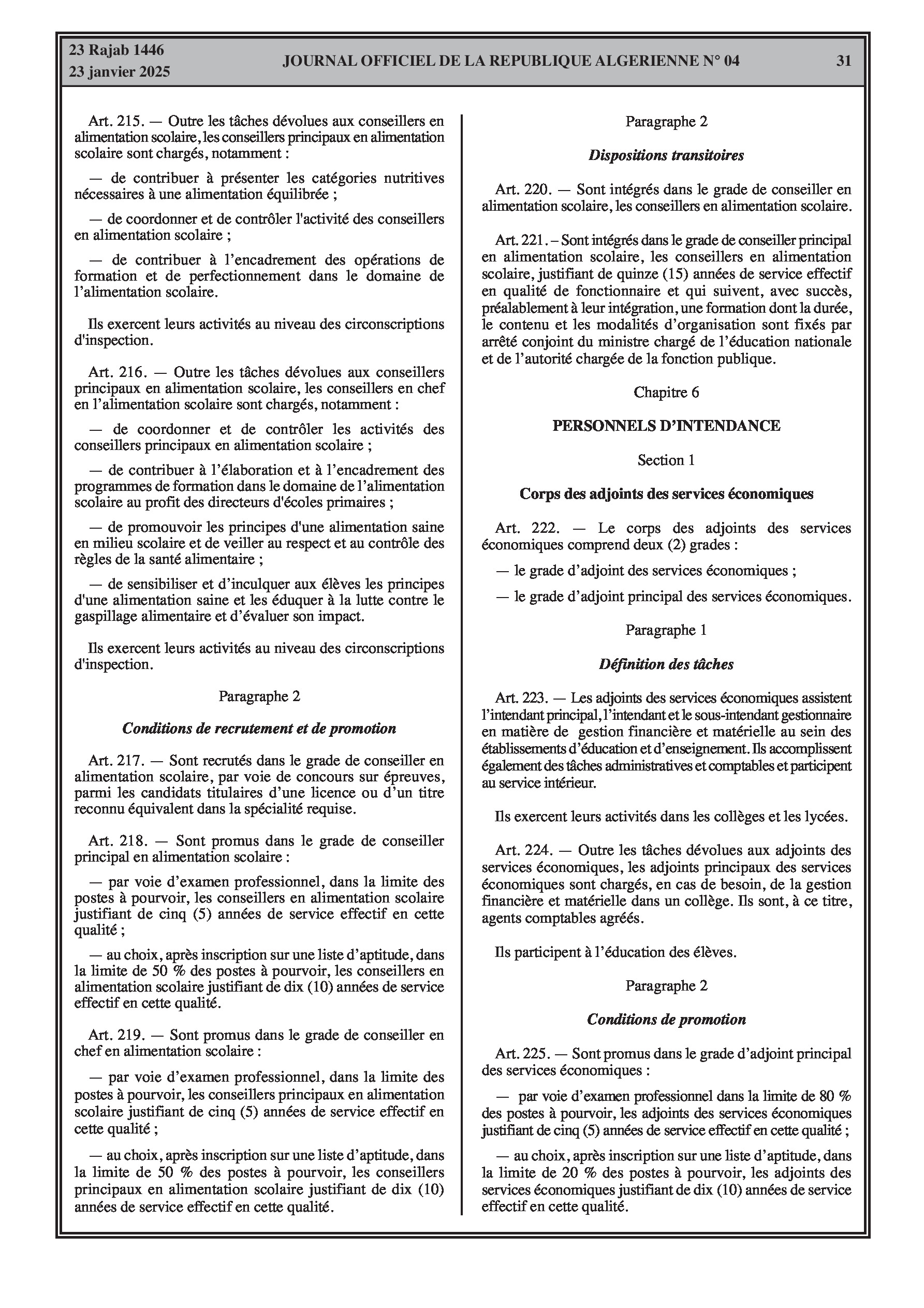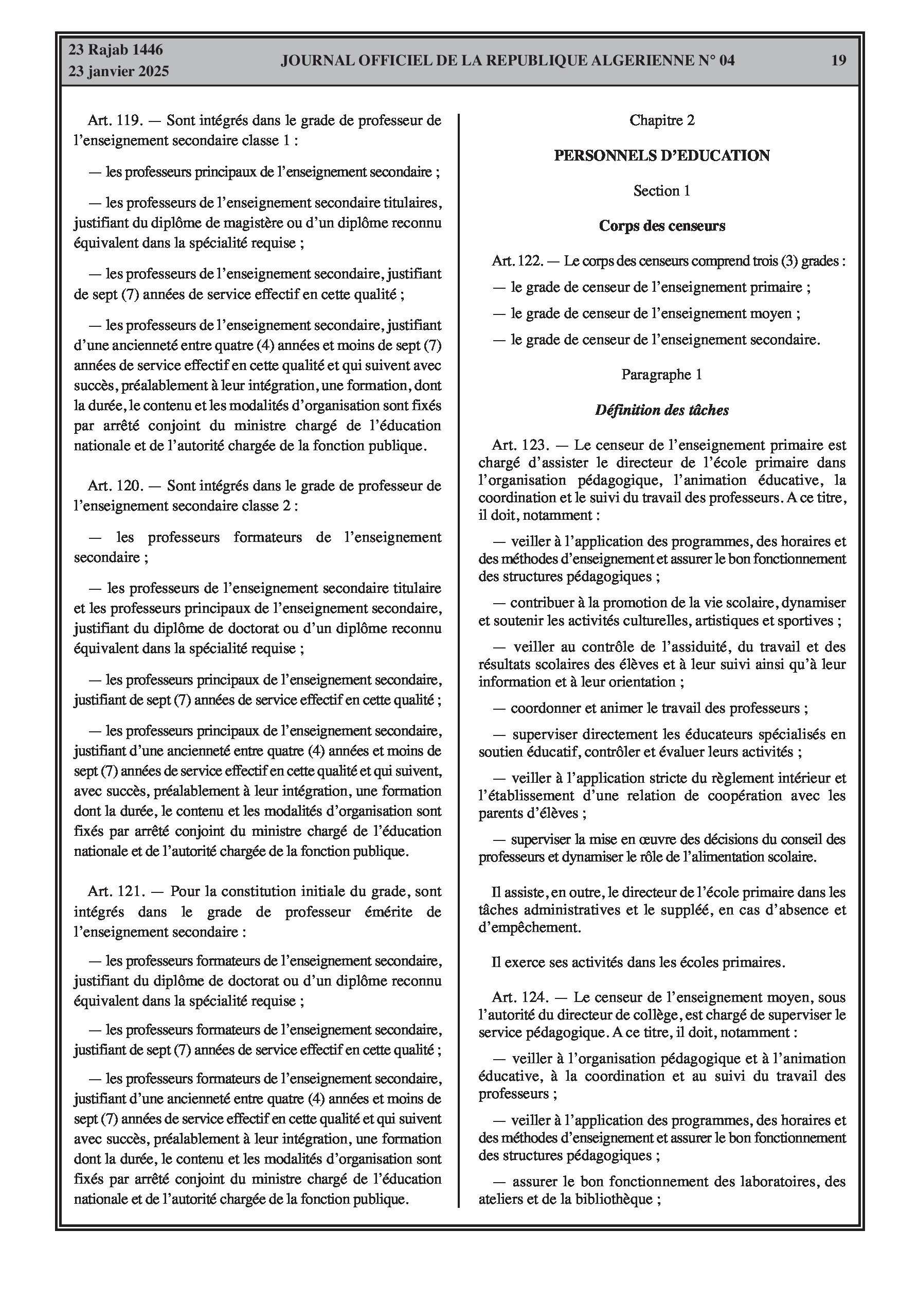 - Décret exécutif n° 25-54 : Définit le nouveau statut particulier applicable aux fonctionnaires des corps spécifiques de l'éducation nationale (enseignants, personnels d'éducation, d'orientation, de laboratoire, d'alimentation scolaire, d'intendance, de direction des établissements, et d'inspection). Détaille les droits et obligations, conditions de recrutement et de promotion, formation, évaluation, mobilité, régime disciplinaire, et procédures d'intégration des personnels actuels. Comprend également la classification de tous les grades et la bonification indiciaire des postes supérieurs (Pages 3-43).