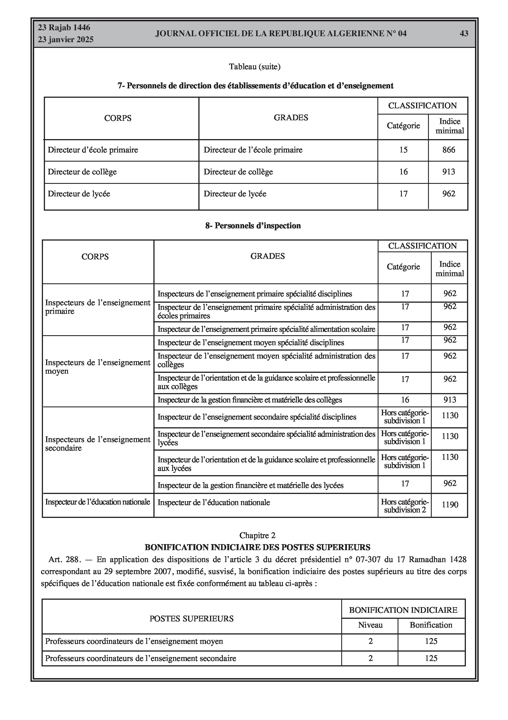 Publication de deux décrets exécutifs majeurs : le premier définit le nouveau statut particulier des fonctionnaires de l'éducation nationale pour tous les corps et grades, le second institue leur régime indemnitaire détaillé.