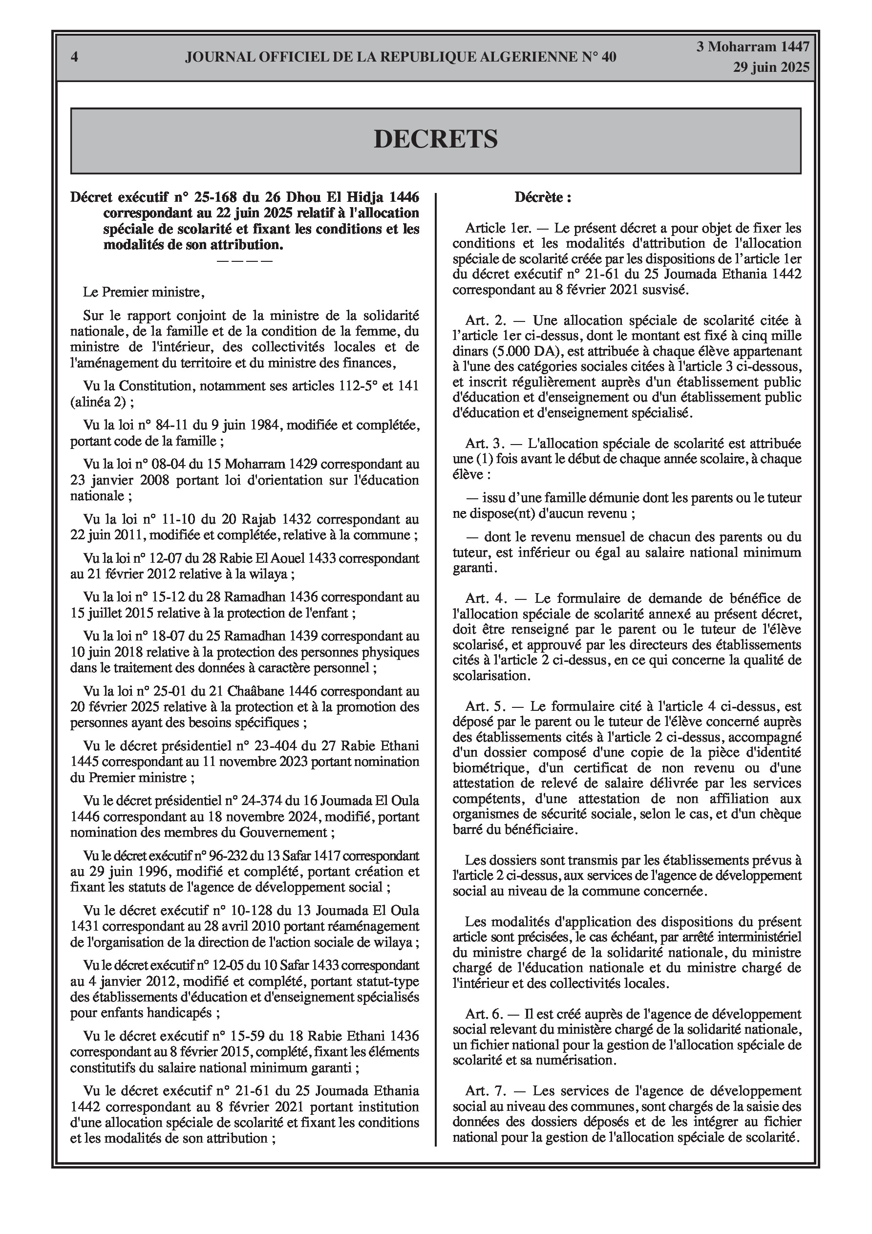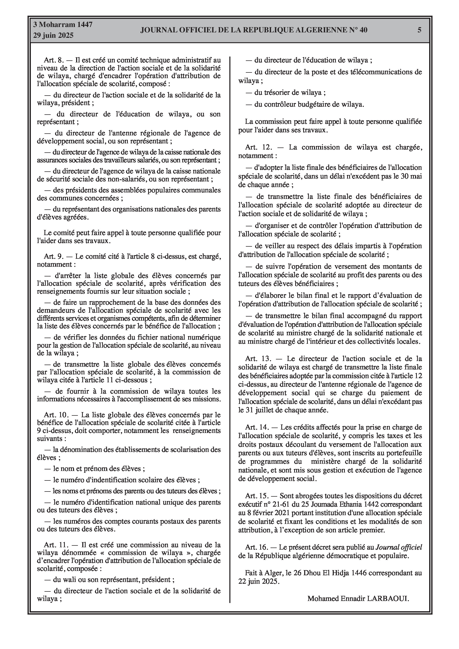 Un décret exécutif fixe les conditions et modalités de l'allocation spéciale de scolarité, visant à soutenir les familles démunies à chaque rentrée scolaire.