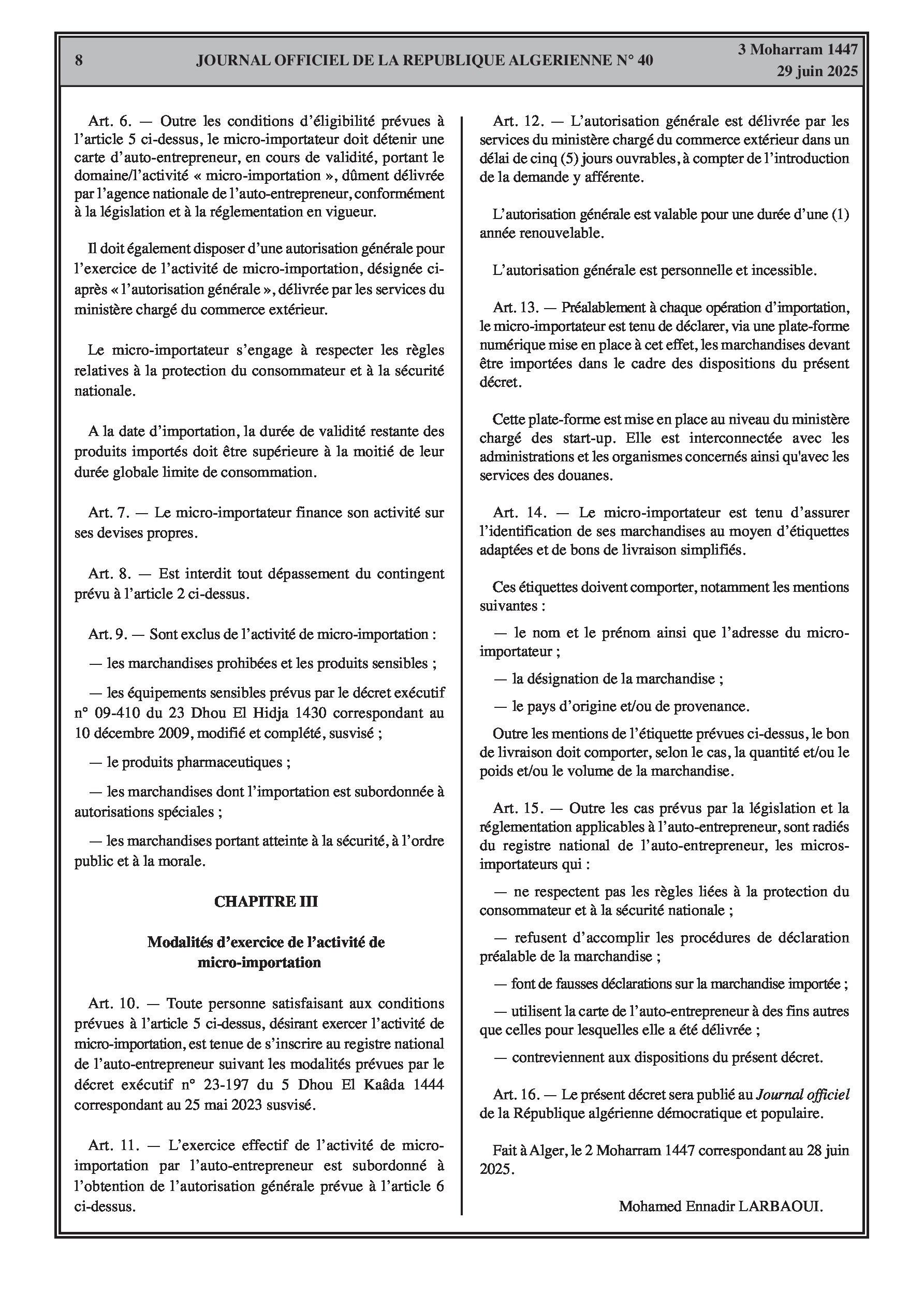Un décret exécutif établit un cadre légal pour l'activité de micro-importation exercée par les auto-entrepreneurs pour la revente en l'état, formalisant une activité auparavant non réglementée.