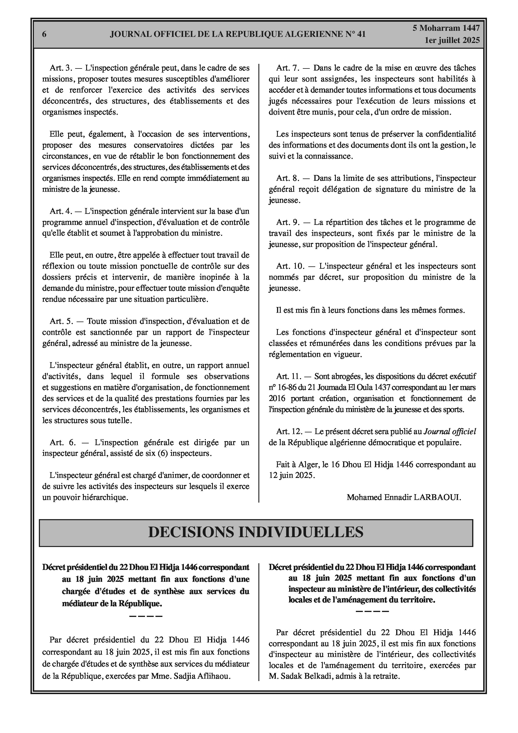 Un décret exécutif définit l'organisation et les missions de l'Inspection générale du ministère de la Jeunesse. Parallèlement, un arrêté interministériel met à jour les effectifs et la classification des agents contractuels de service et de maintenance au ministère de la Justice.