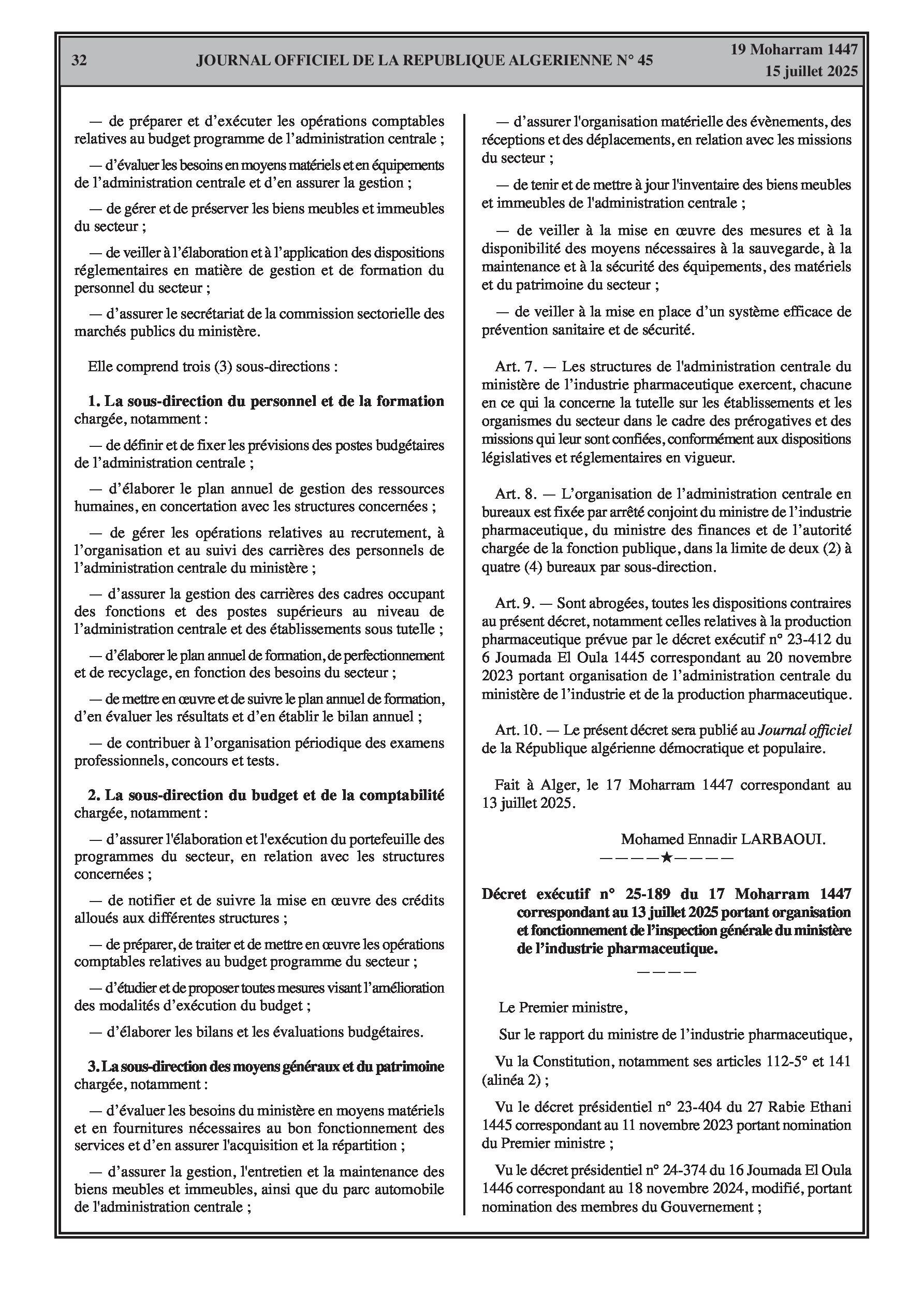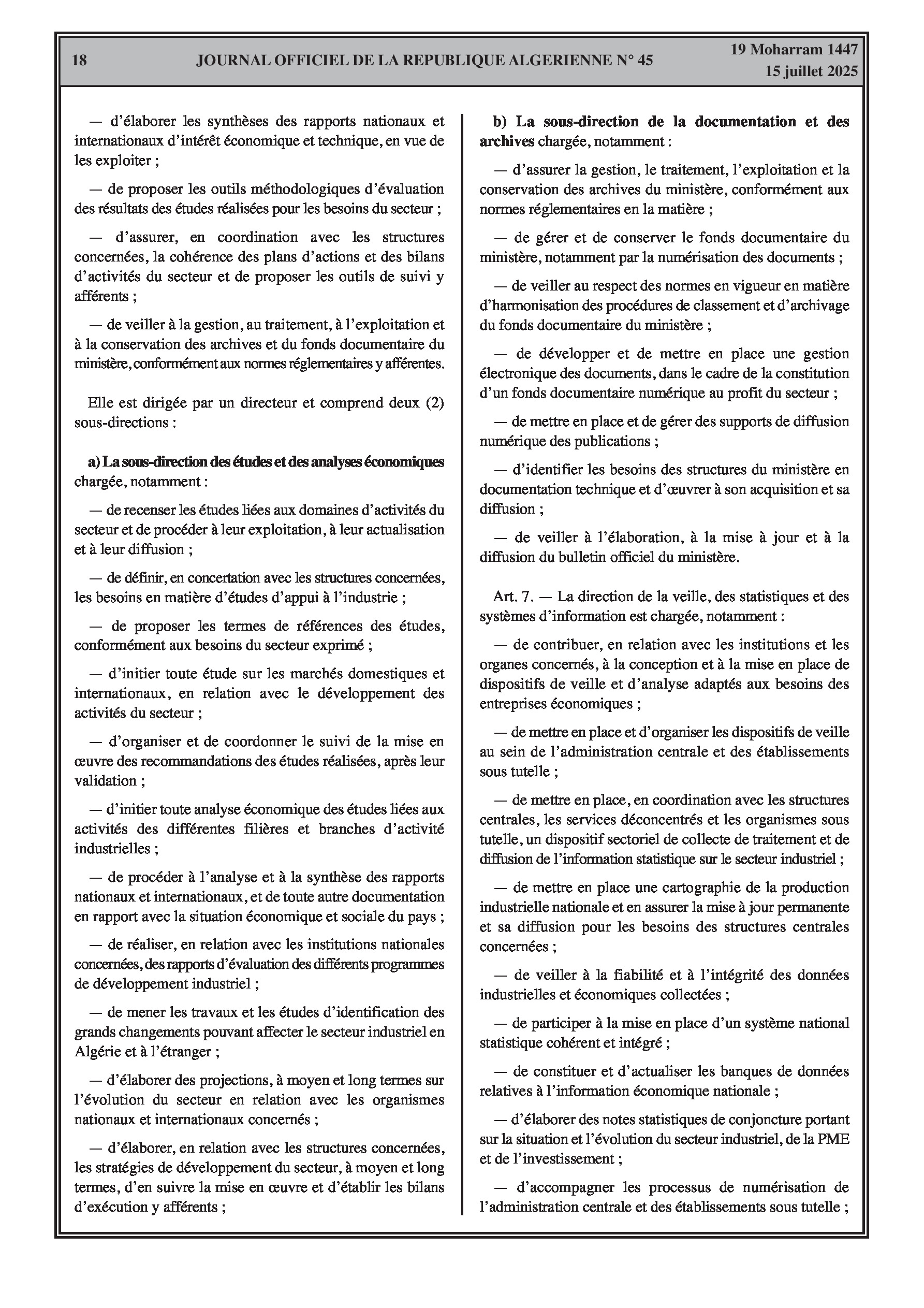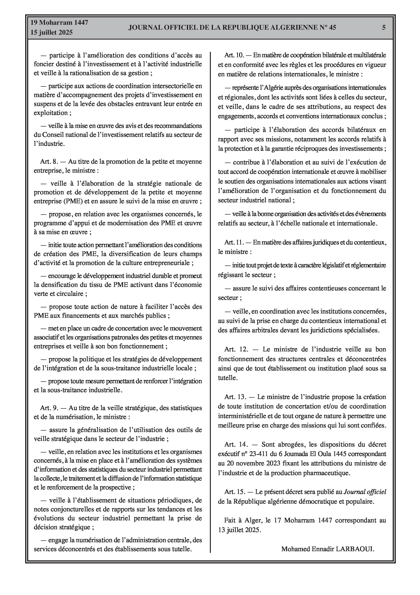 Réorganisation complète du ministère de l'Industrie suite à sa séparation du secteur de la production pharmaceutique. Les nouveaux textes définissent les missions et la structure administrative du ministère, en se concentrant sur le développement industriel, l'investissement et les PME.