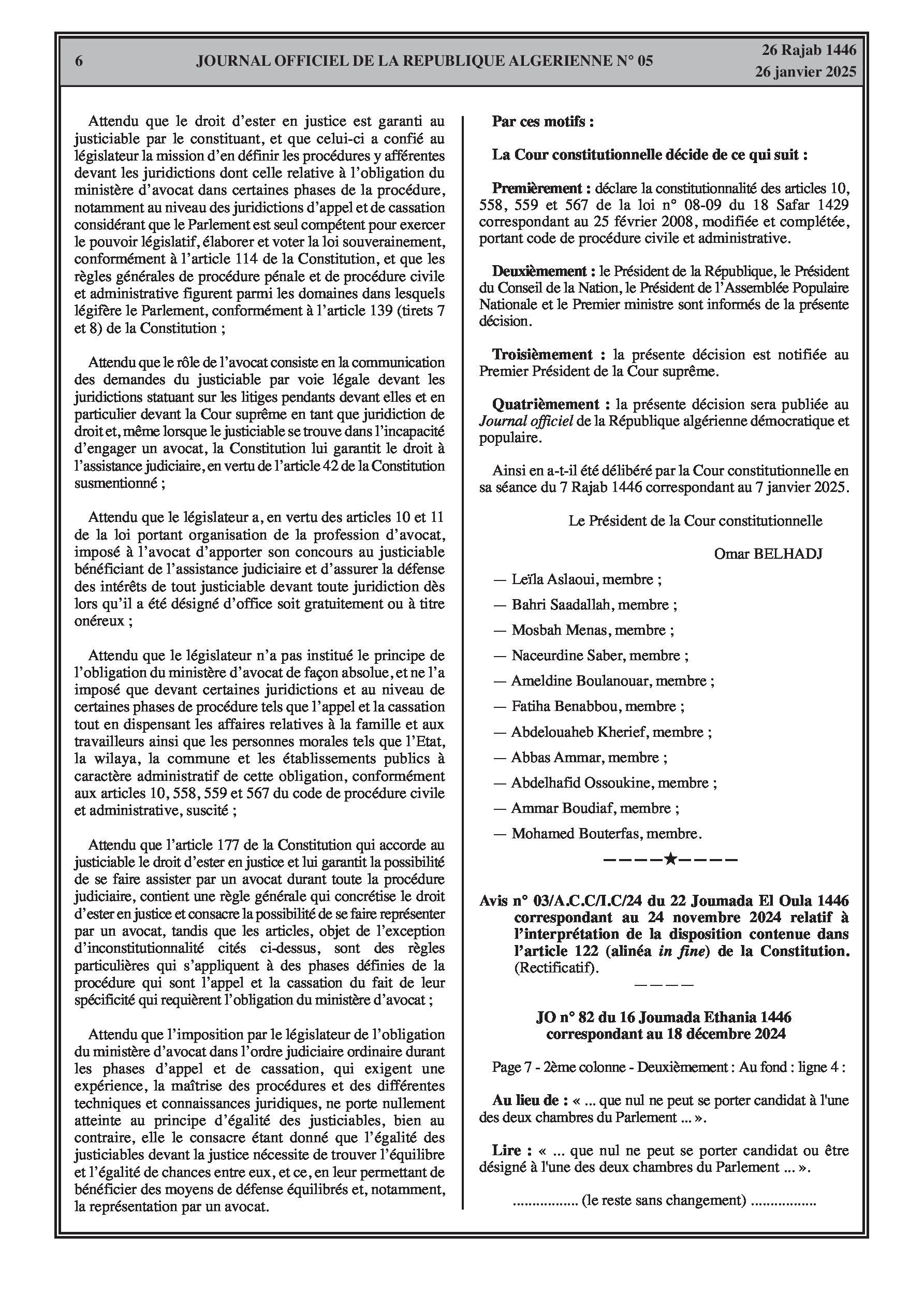 La Cour constitutionnelle s'est prononcée sur la constitutionnalité des articles 10, 558, 559 et 567 du code de procédure civile et administrative relatifs à l'obligation de représentation par avocat devant les cours d'appel et de cassation, confirmant leur constitutionnalité. Un rectificatif à un avis antérieur a également été publié, clarifiant les conditions de candidature ou de désignation aux deux chambres du Parlement en vertu de l'article 122 de la Constitution, modifiant le texte en "nul ne peut se porter candidat ou être désigné à l'une des deux chambres du Parlement...".