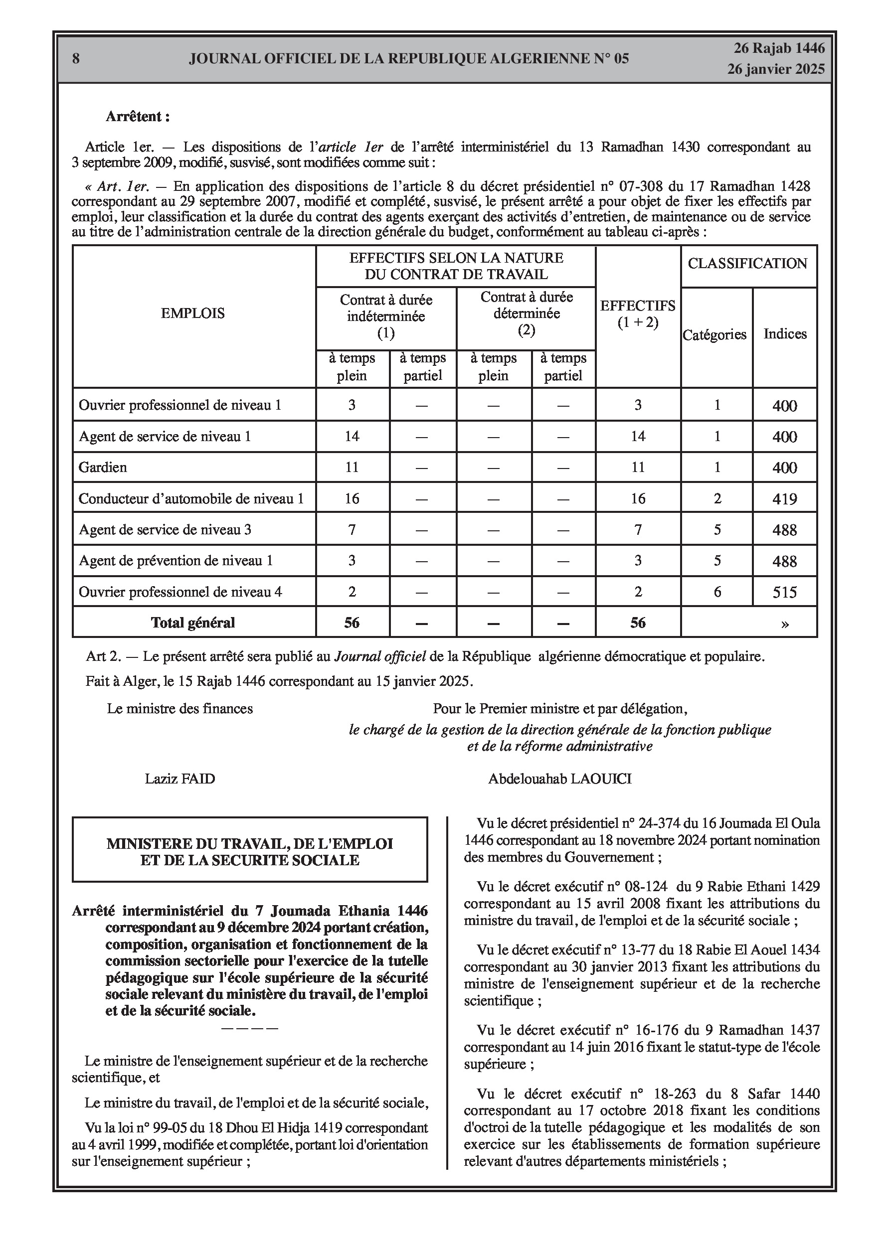 Un arrêté interministériel du 9 décembre 2024 porte création de la commission sectorielle pour l'exercice de la tutelle pédagogique sur l'école supérieure de la sécurité sociale et définit sa composition, son fonctionnement et ses réunions. Un autre arrêté du 23 décembre 2024 fixe la classification de l'école (catégorie A, section 2) et les conditions d'accès à ses différents postes supérieurs (Directeur, Directeur adjoint, Chef de département, Secrétaire général, Directeur de bibliothèque, Chefs de service, etc.) en précisant les bonifications indiciaires associées et les conditions d'ancienneté et de diplômes requis. Ces arrêtés abrogent les dispositions antérieures y afférentes.
