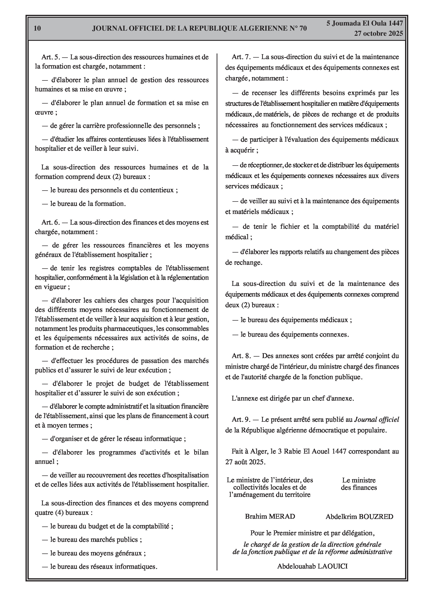 Fin de fonctions du chef de cabinet du ministre du Travail et de directeurs de l'action sociale, ainsi que de nouvelles nominations de vice-recteurs et de doyens d'université. Un arrêté conjoint détaille l'organisation interne des hôpitaux de la sûreté nationale. La composition des commissions paritaires des fonctionnaires du ministère de la justice est également définie.