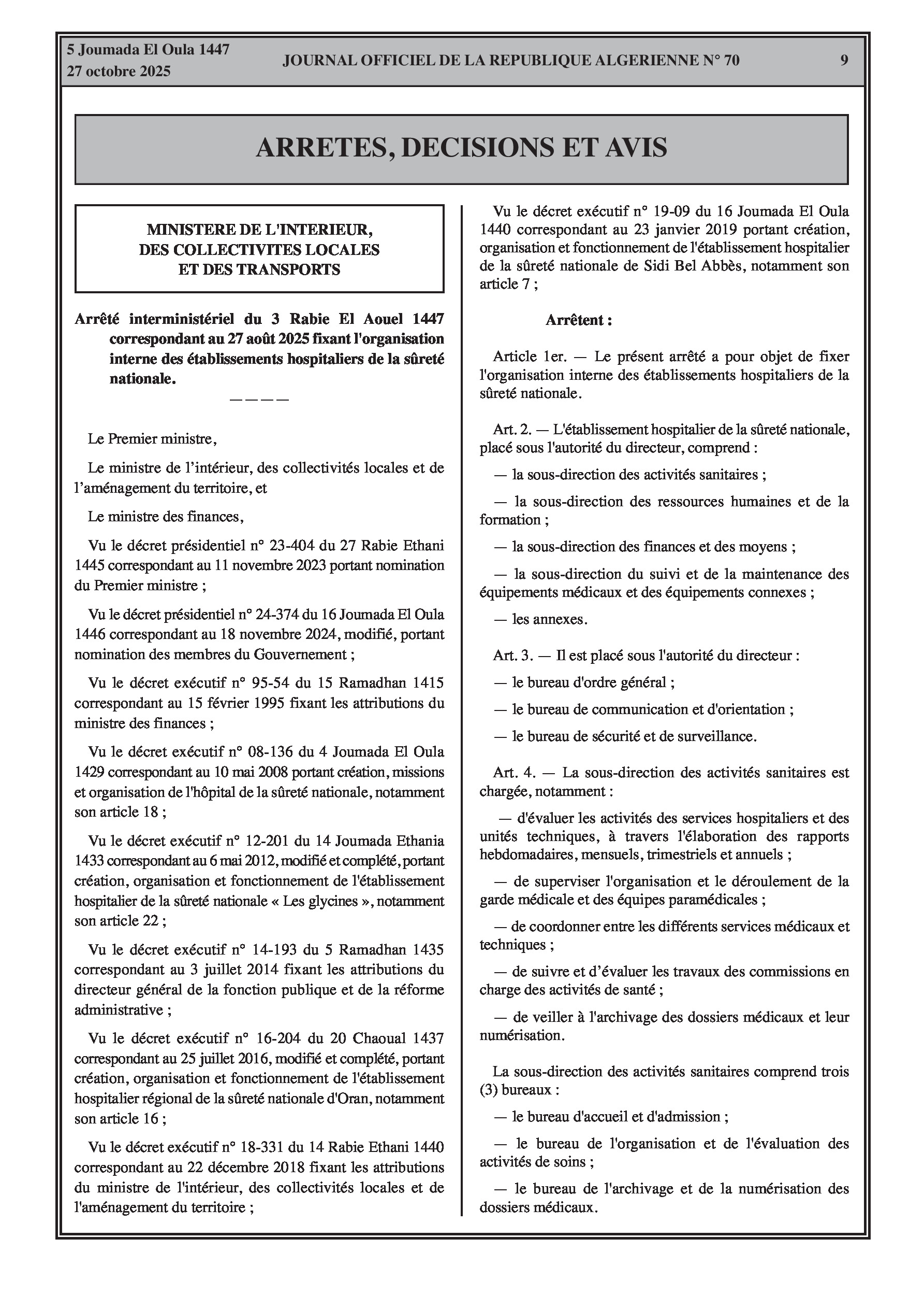 Cette section couvre diverses nominations et fins de fonctions de hauts responsables dans plusieurs ministères. Elle inclut également de nouveaux textes organisationnels pour les établissements hospitaliers de la sûreté nationale et les commissions du ministère de la justice.