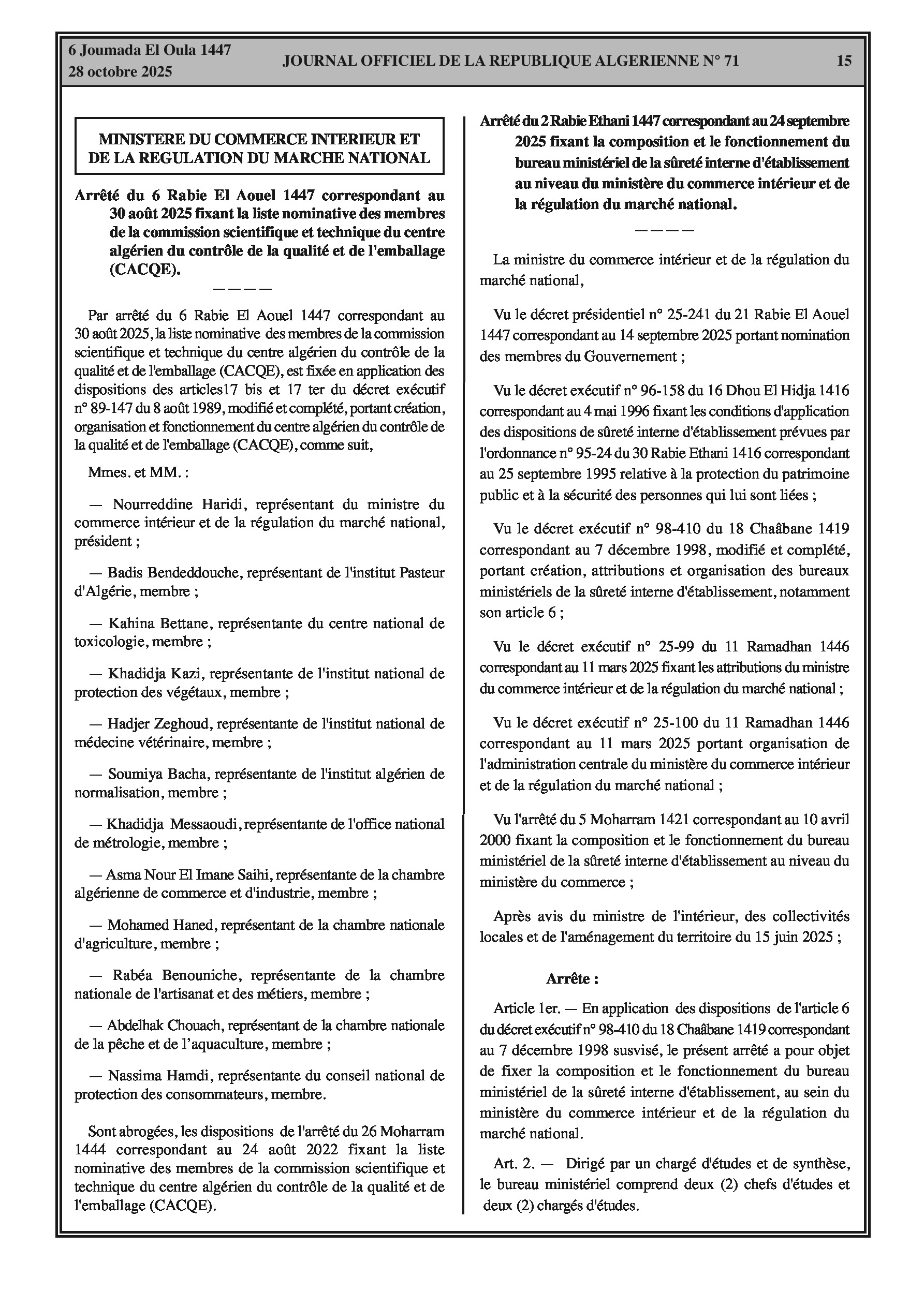Un arrêté ministériel fixe le taux maximal des crédits financiers pour le recrutement de personnels sur le budget décentralisé de la wilaya pour l'exercice 2025, avec un tableau détaillé pour chaque wilaya.