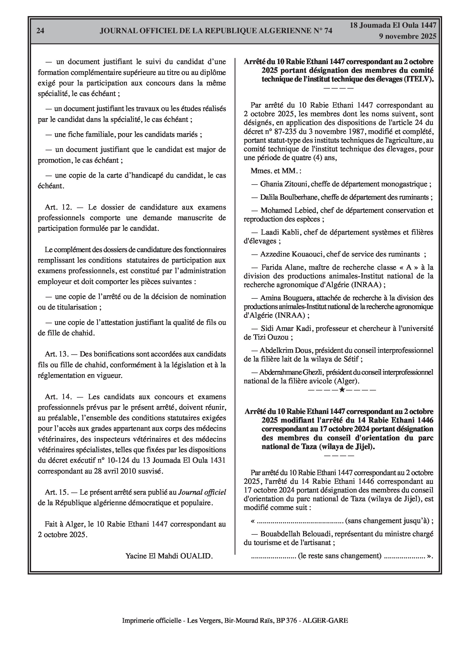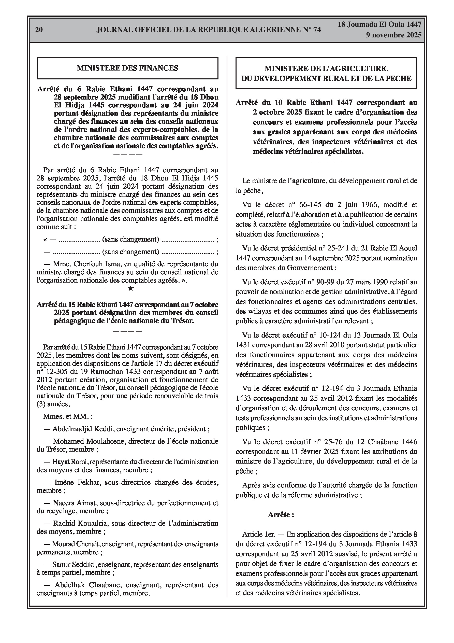 De nouveaux arrêtés ministériels établissent l'organisation des examens professionnels pour les vétérinaires et nomment des membres à des comités clés dans les secteurs des finances et de l'agriculture.