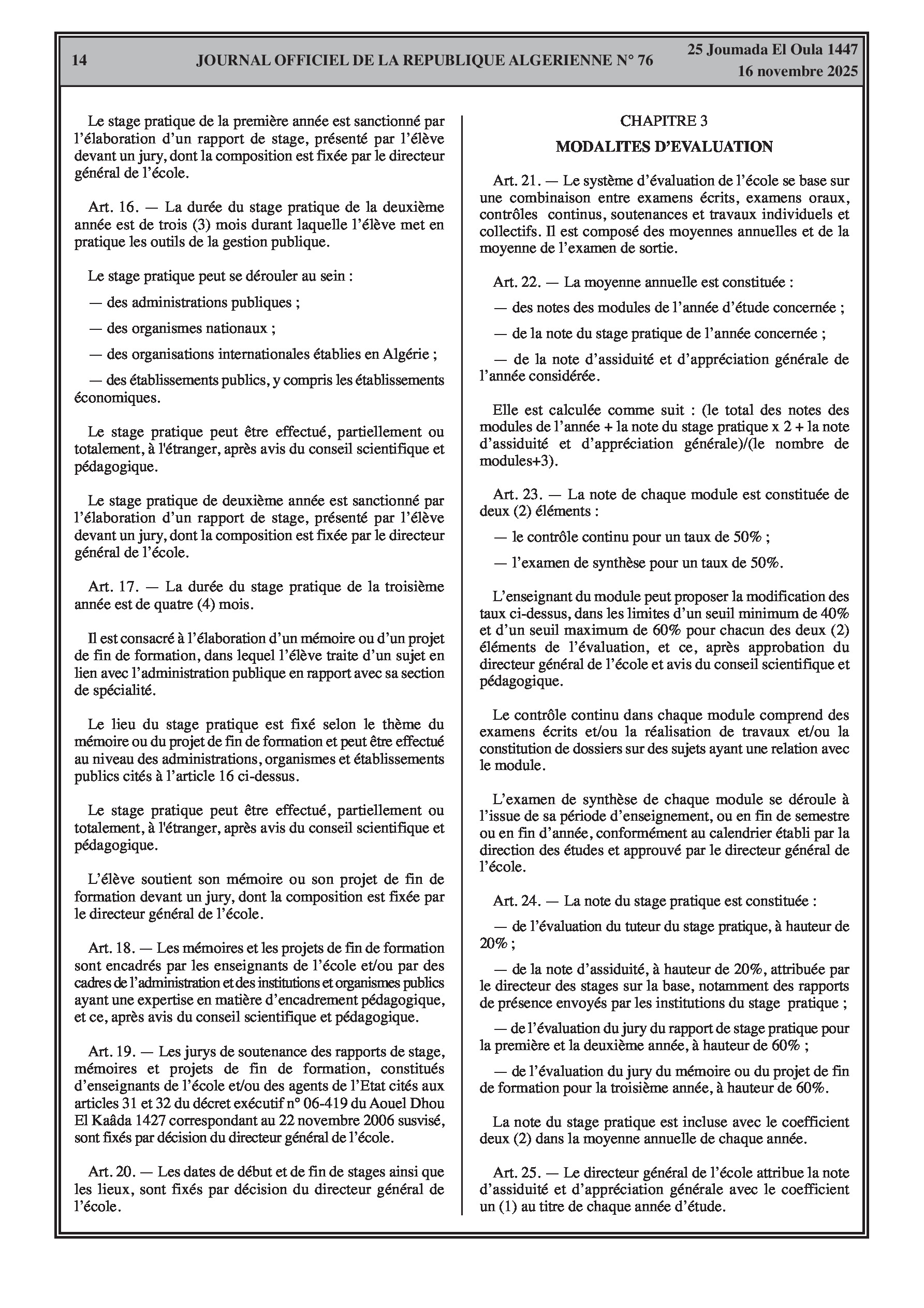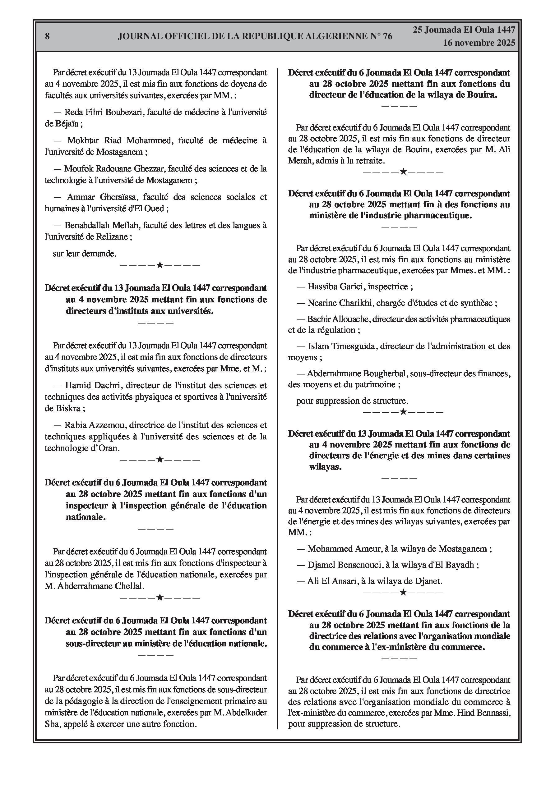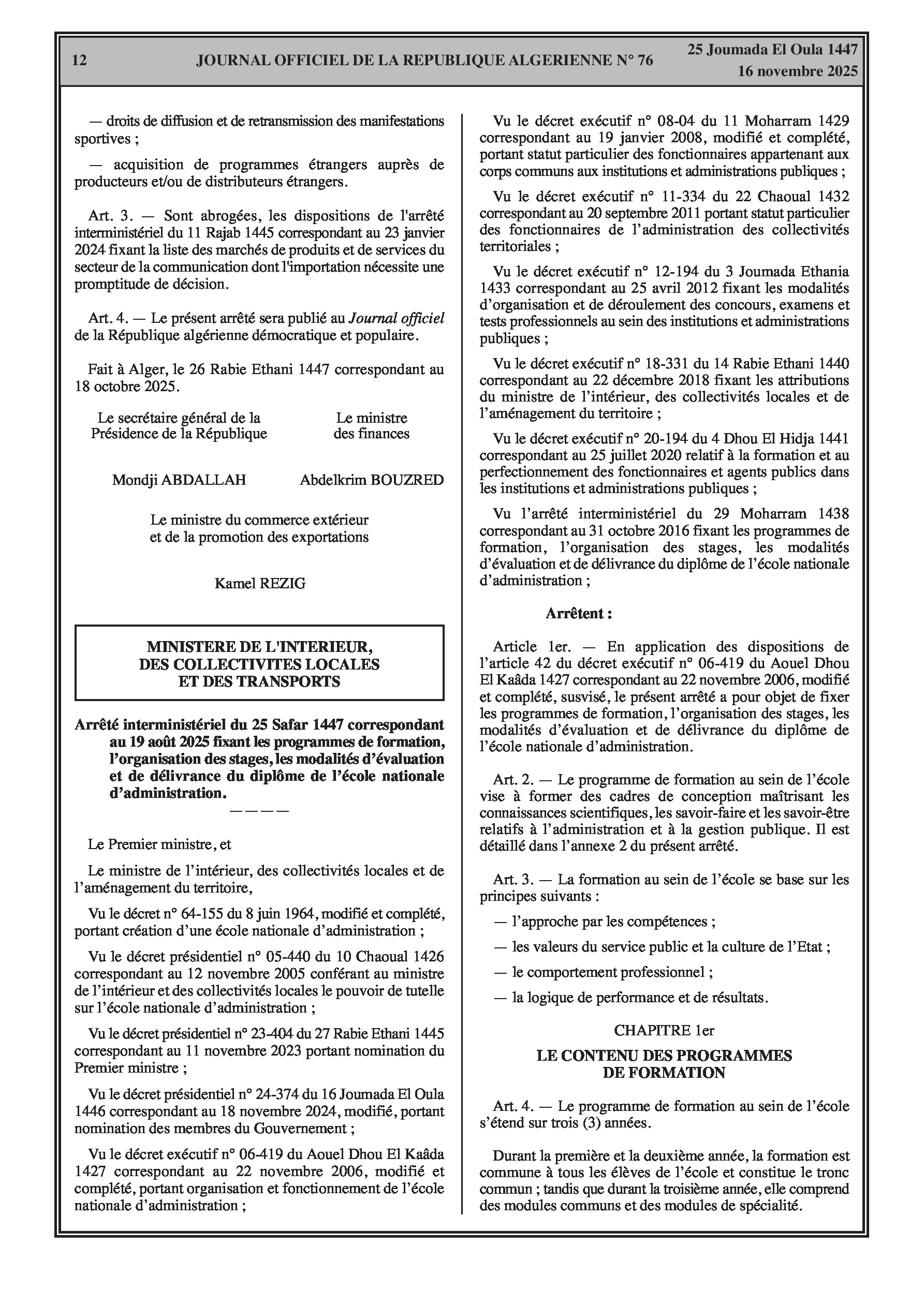 Publication d'un nouveau programme de formation de trois ans pour l'Ecole Nationale d'Administration, parallèlement à une vaste série de décrets de fin de fonctions et de nominations dans divers secteurs ministériels.