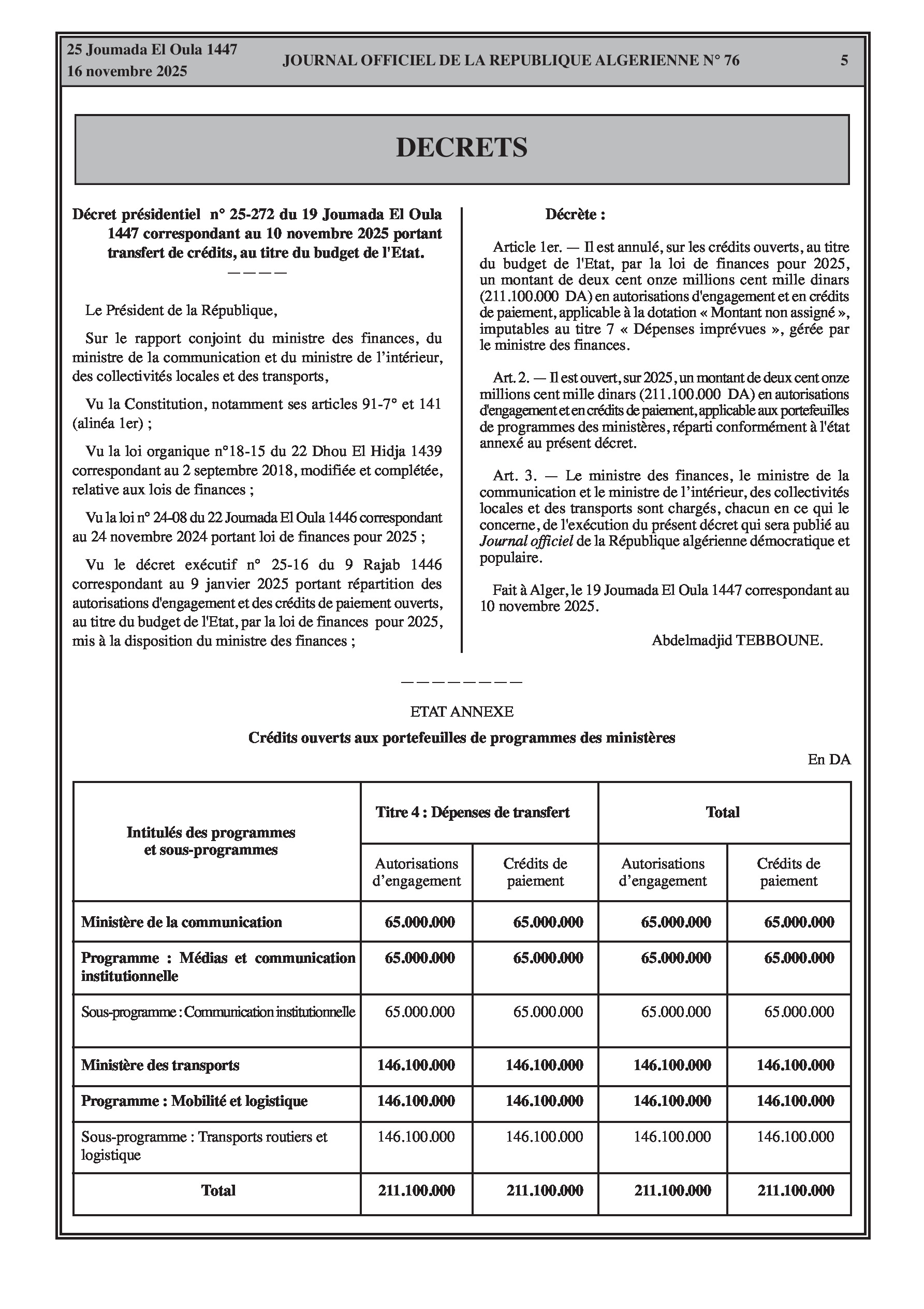 Transferts de crédits dans le budget de l'État, fixation des dates d'inscription pour l'allocation de solidarité Ramadan 2026, et publication de nouvelles règles pour le logement promotionnel public et l'importation de services médias.
