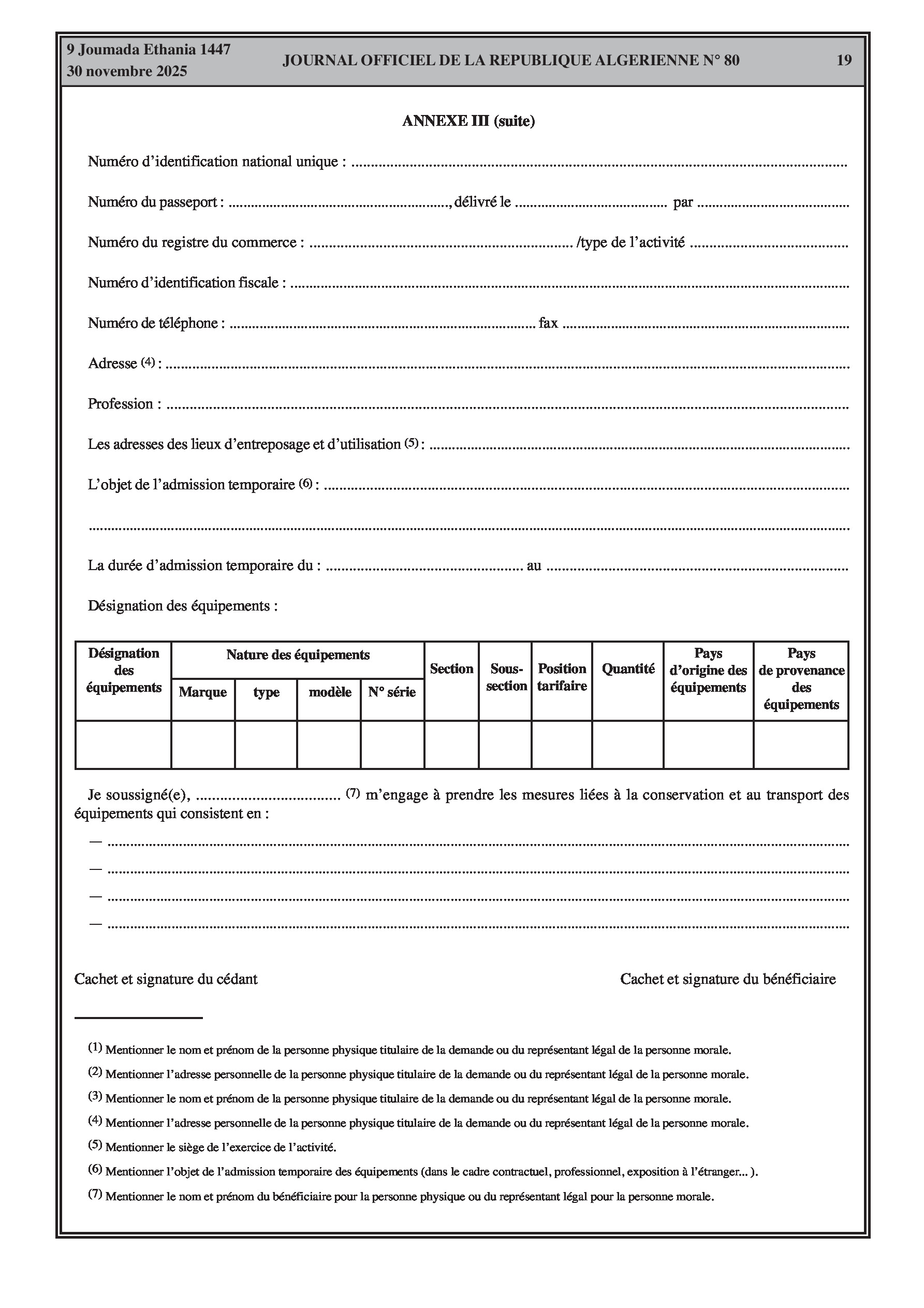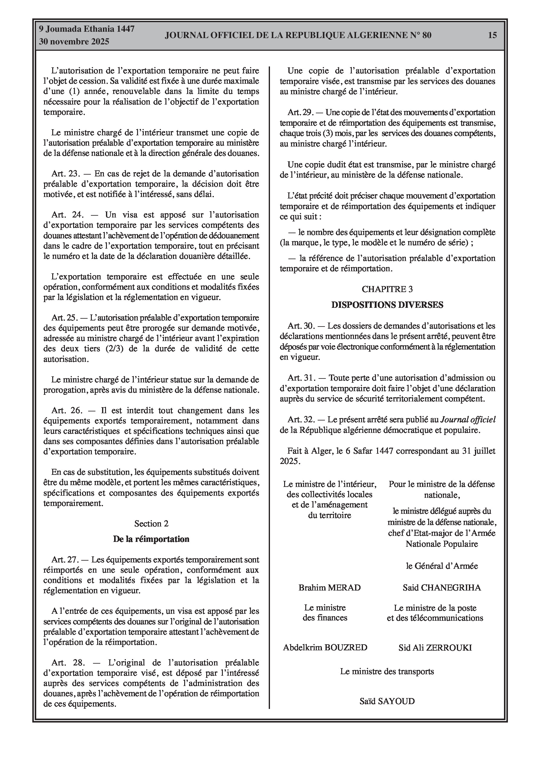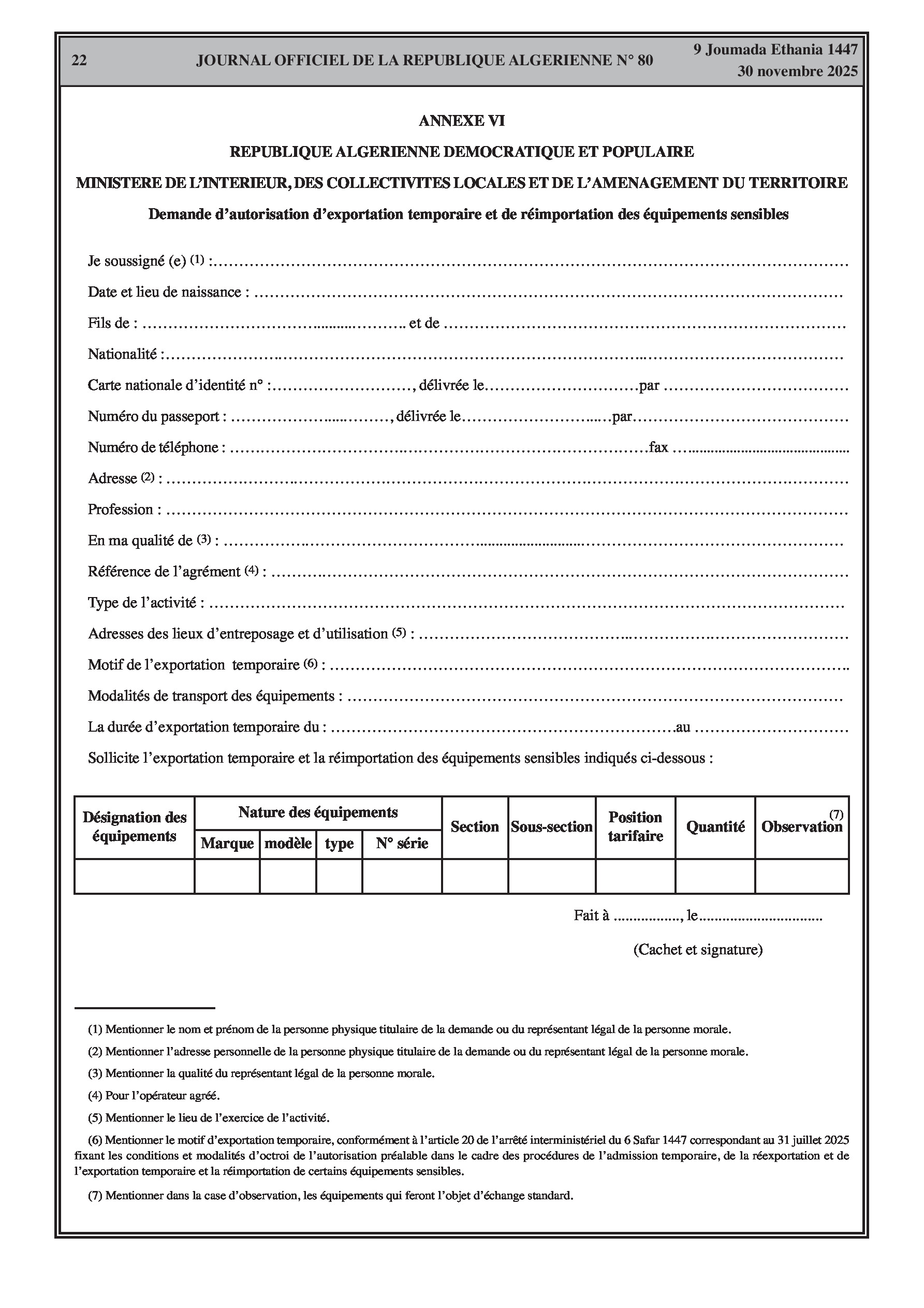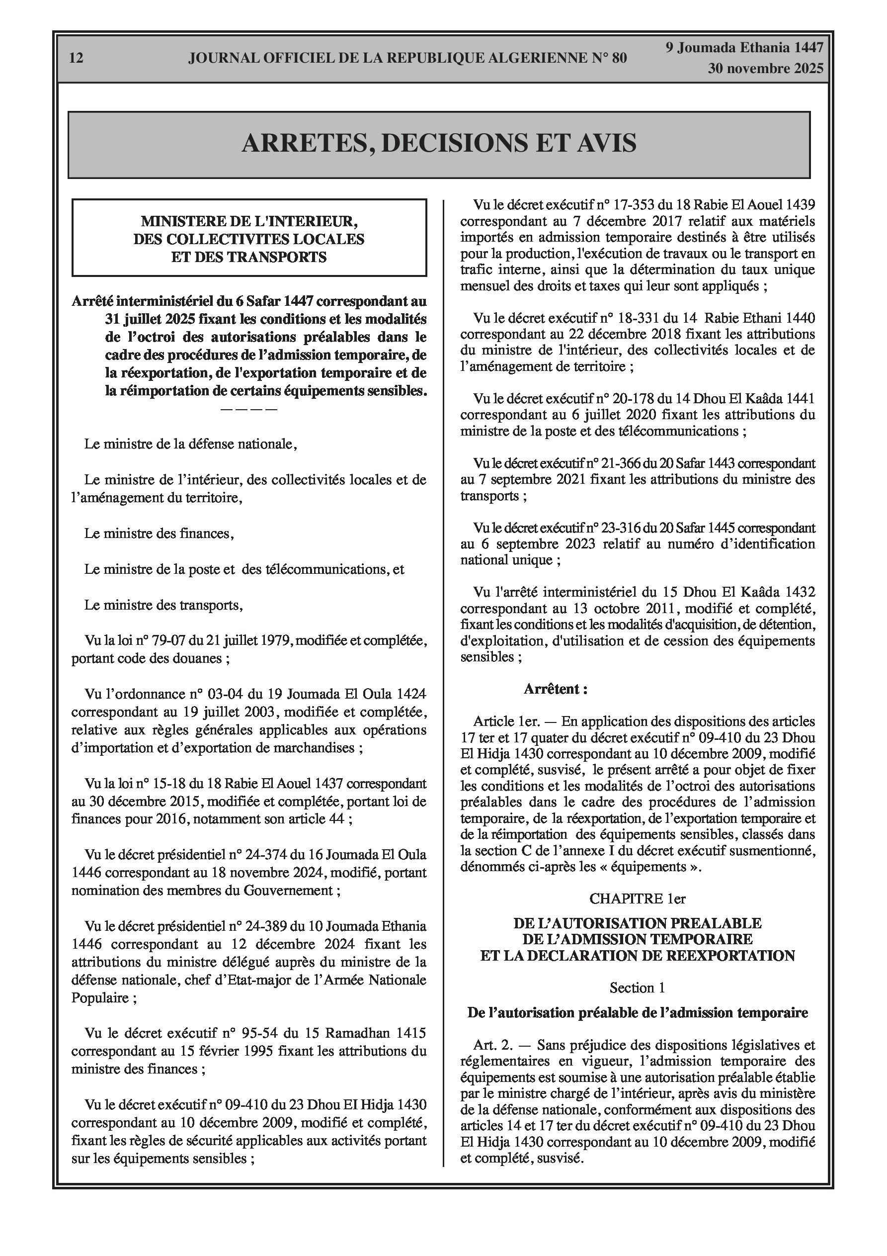Fixation des conditions d'octroi des autorisations pour l'admission temporaire, la réexportation et l'exportation temporaire des équipements sensibles.