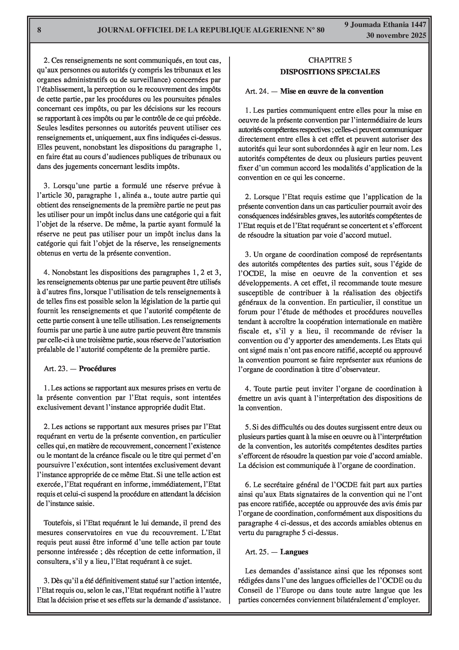 L'Algérie ratifie la convention concernant l'assistance administrative mutuelle en matière fiscale (Conseil de l'Europe/OCDE) pour renforcer la transparence.
