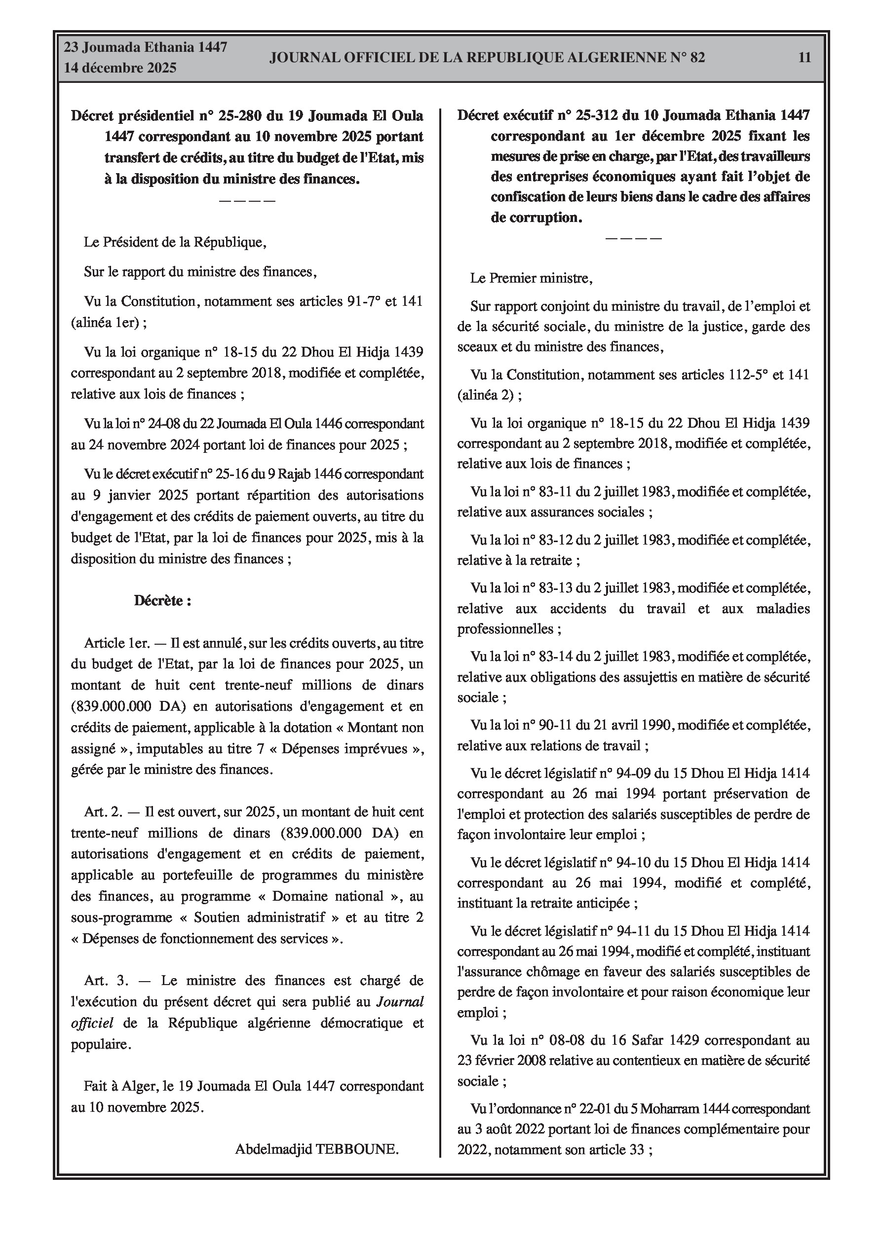 Décret exécutif fixant les mesures de prise en charge par l'État des travailleurs des entreprises dont les biens ont été définitivement confisqués, assurant leur stabilité sociale et professionnelle.