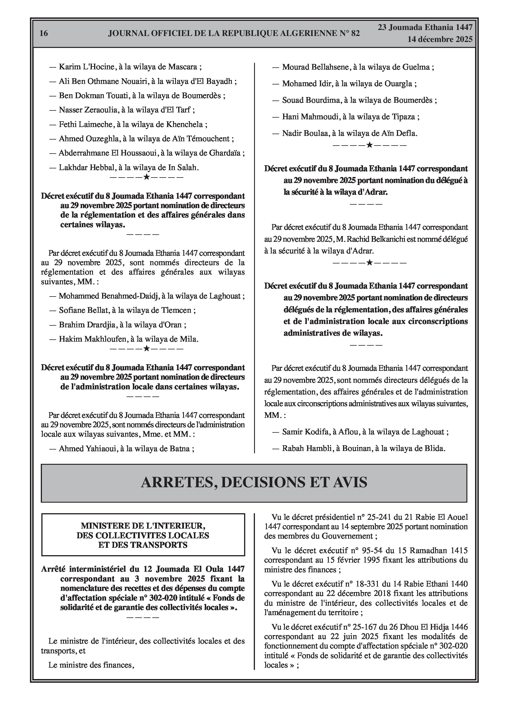 Décrets portant mouvement parmi les chefs de cabinet, inspecteurs généraux, et directeurs de la réglementation et de l'administration locale dans plusieurs wilayas.