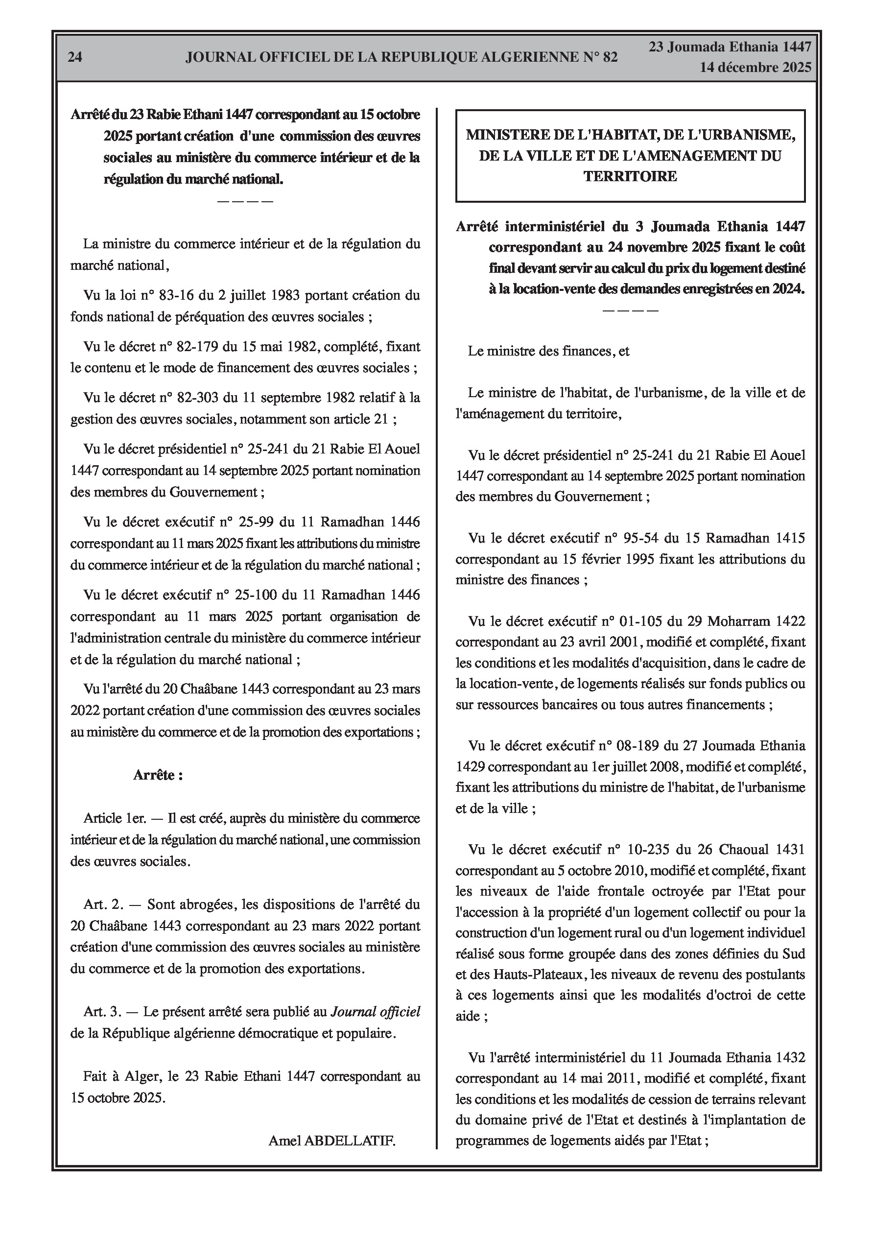 2. Fixation du coût final des logements location-vente (AADL) pour les inscrits de 2024