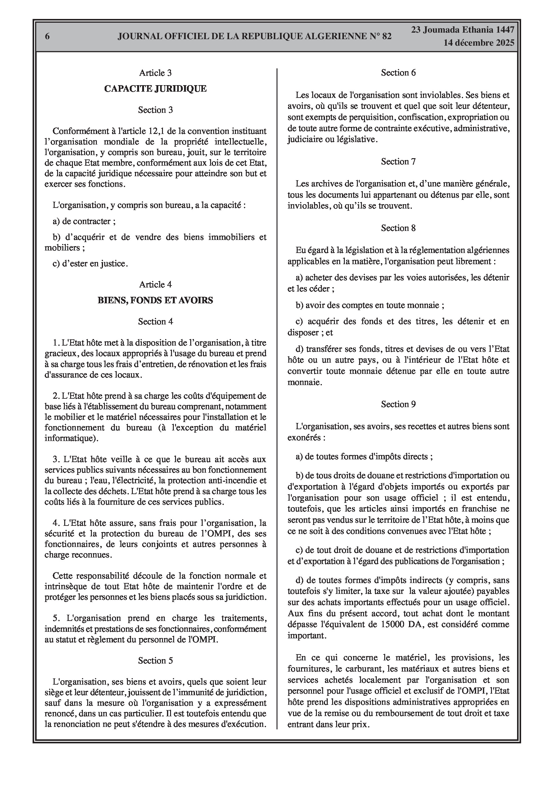 Ratification de l'accord de siège entre l'Algérie et l'Organisation Mondiale de la Propriété Intellectuelle pour l'établissement d'un bureau extérieur en Algérie.