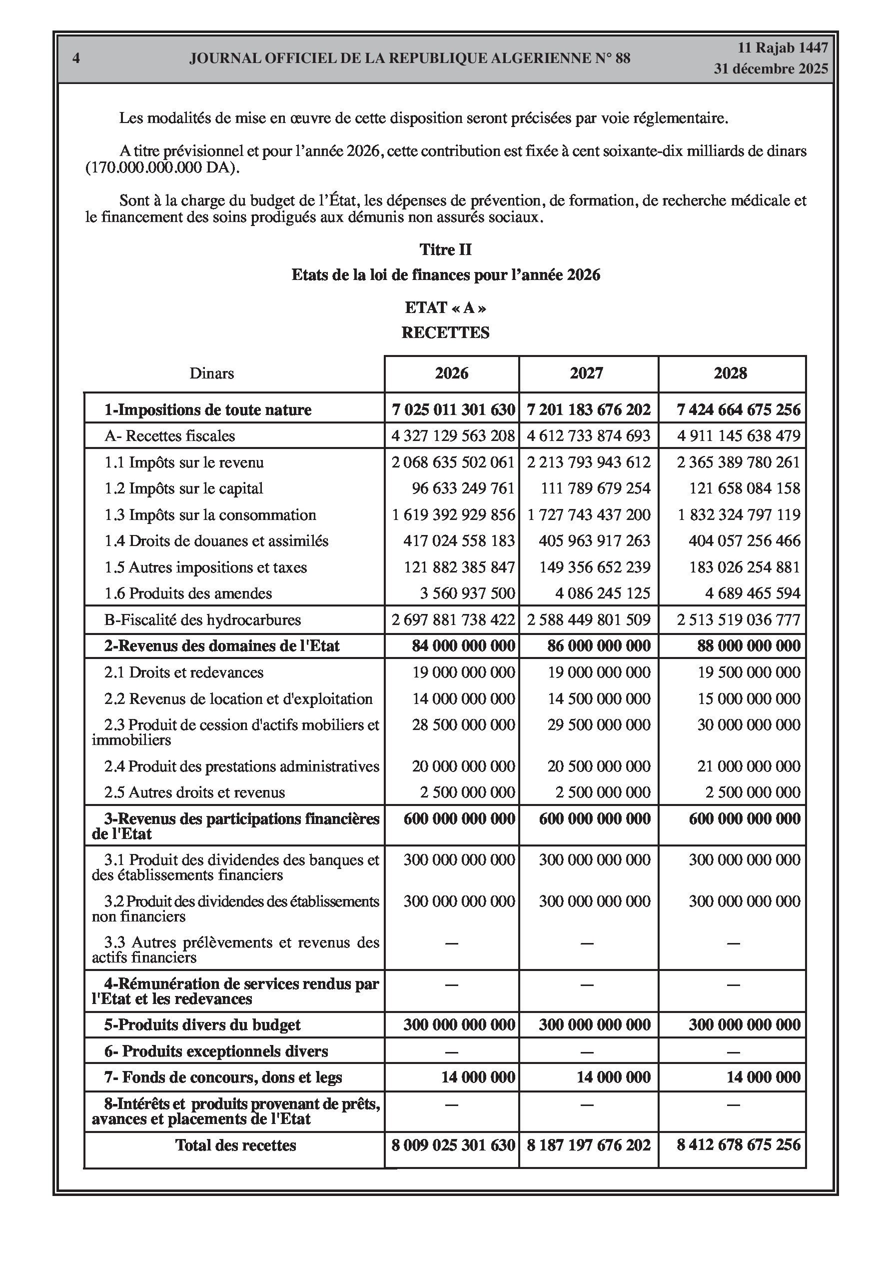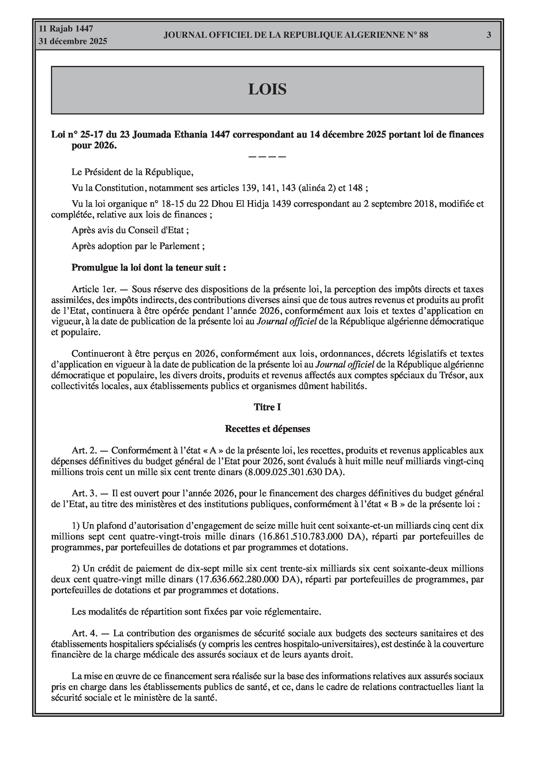 Fixation des recettes et dépenses du budget de l'État pour 2026 et prévisions de croissance.