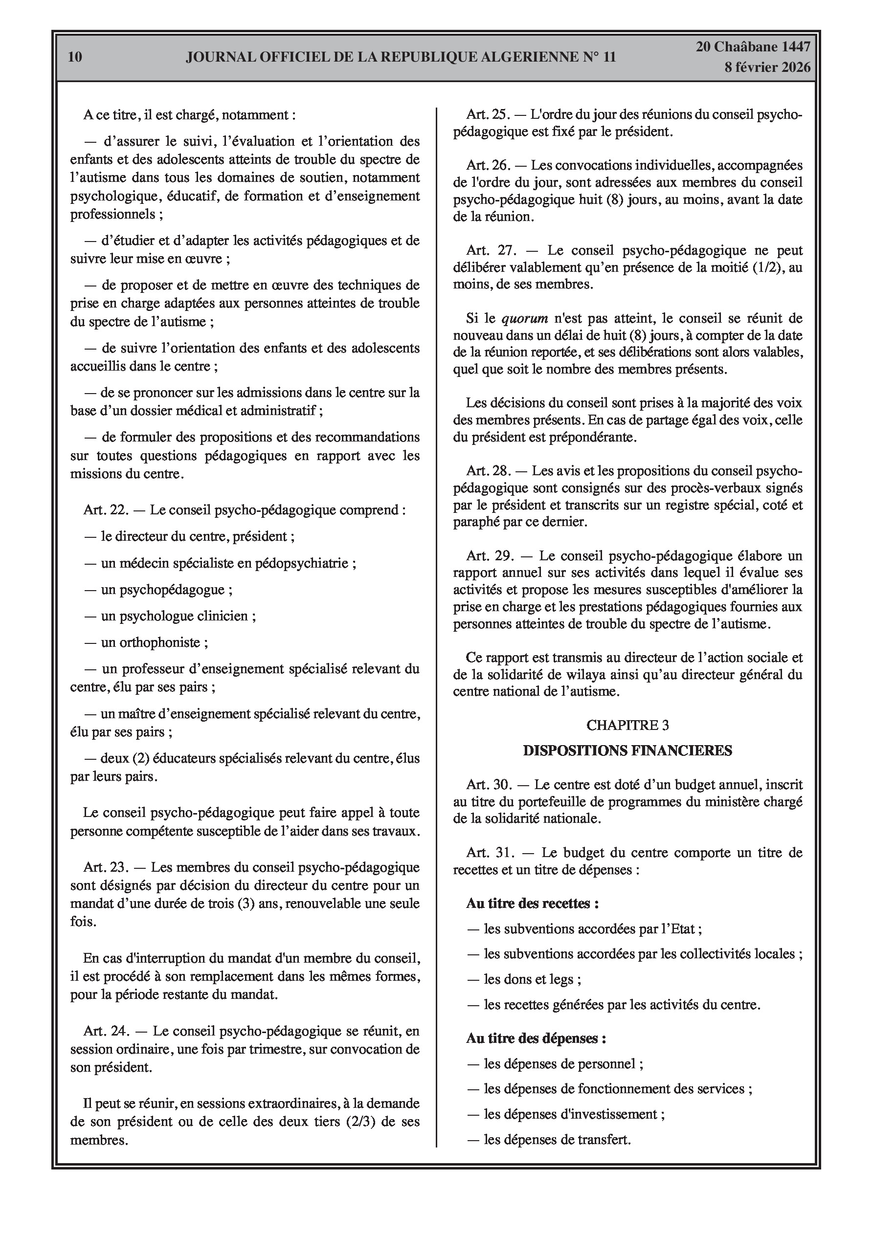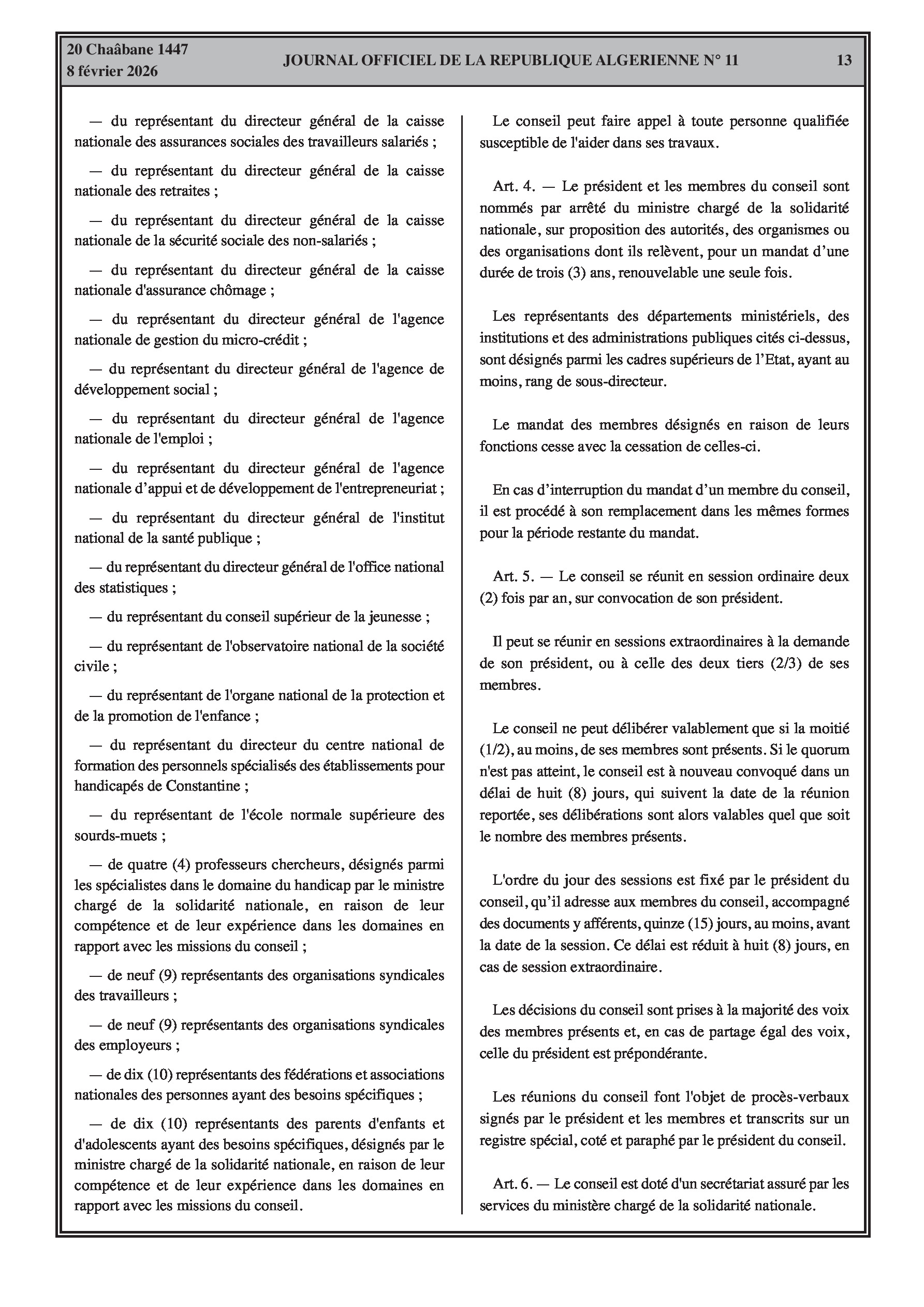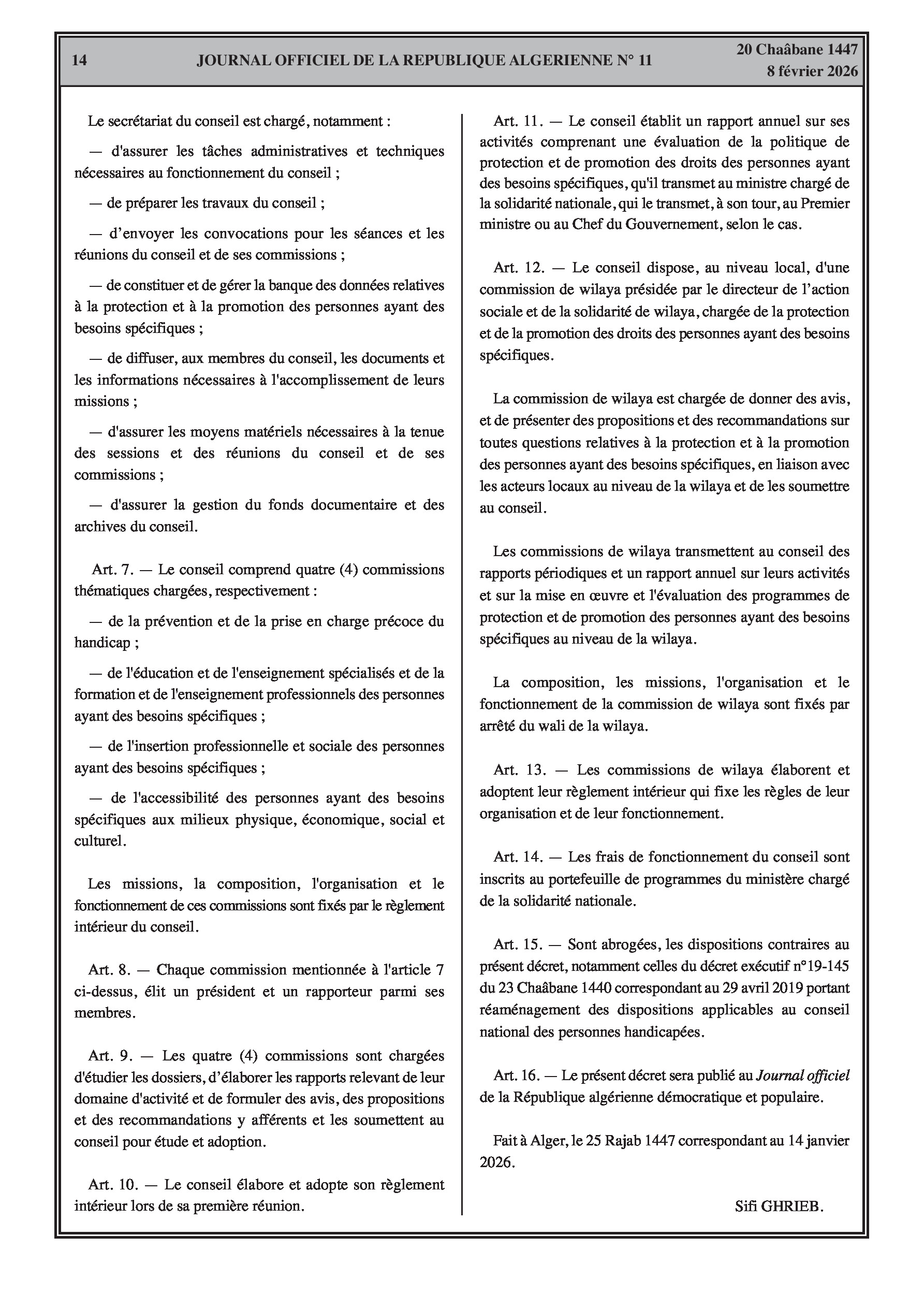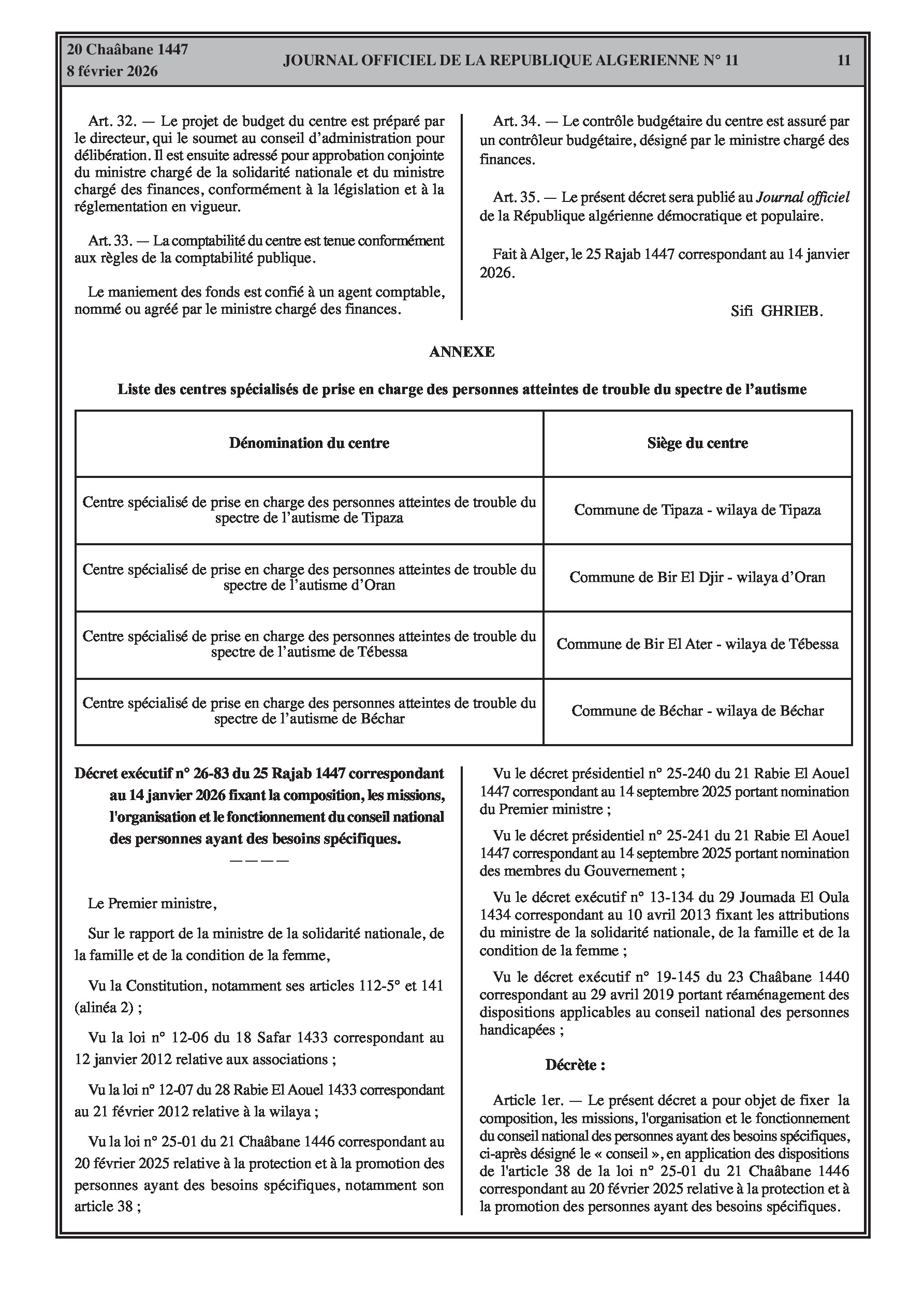 Décret exécutif n° 26-83 : Création du Conseil national des personnes aux besoins spécifiques, organe consultatif pour les politiques de protection et d'insertion.