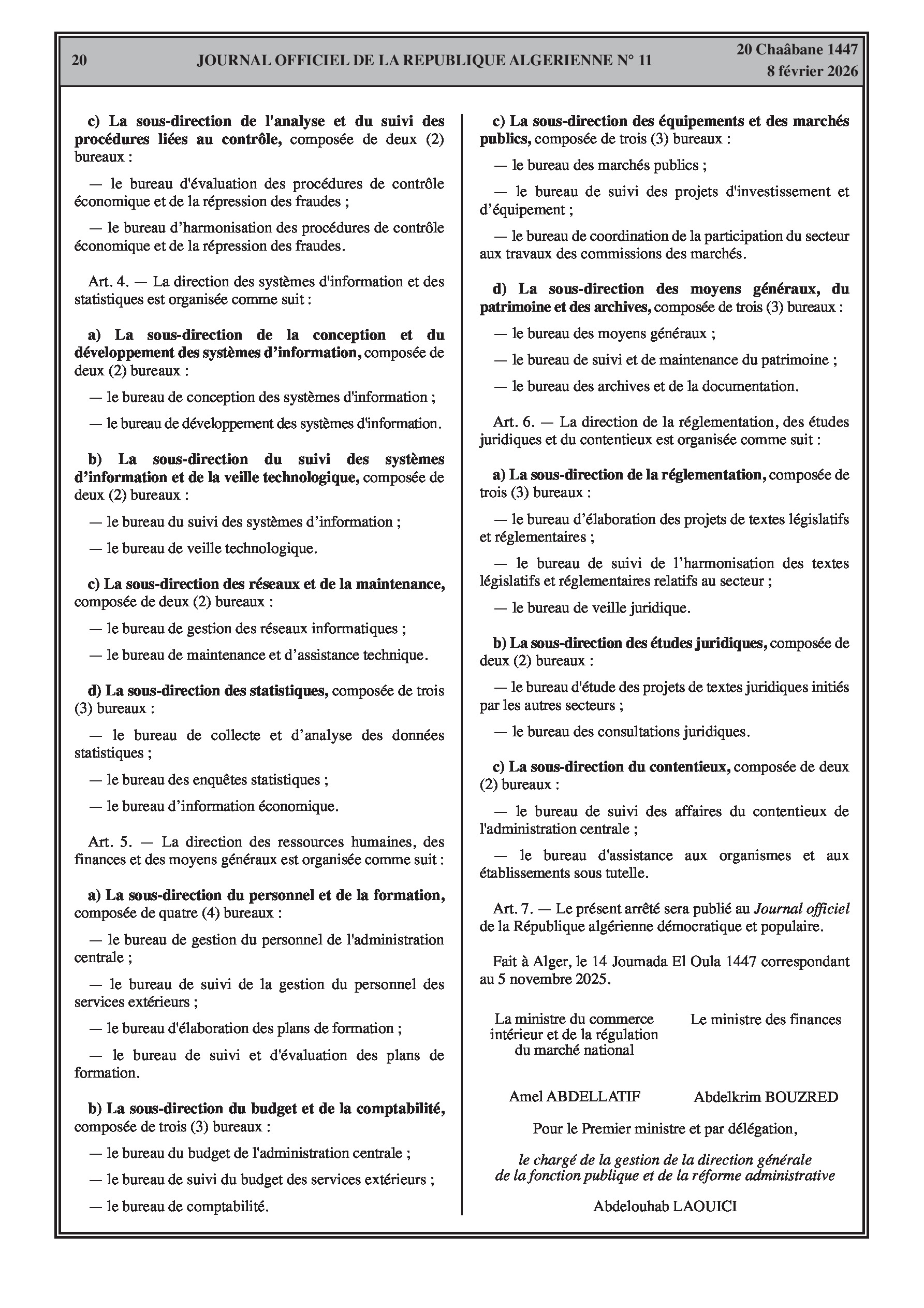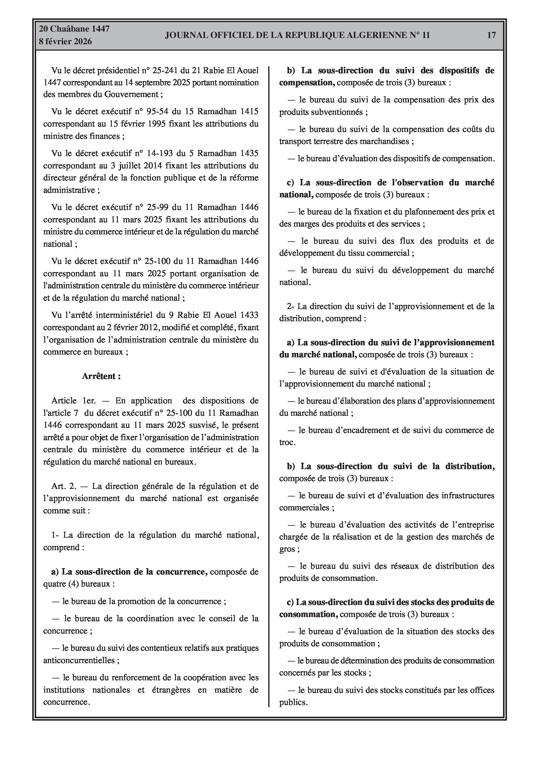 Fixation de l'organisation de l'administration centrale du ministère du Commerce intérieur et de la régulation du marché national.