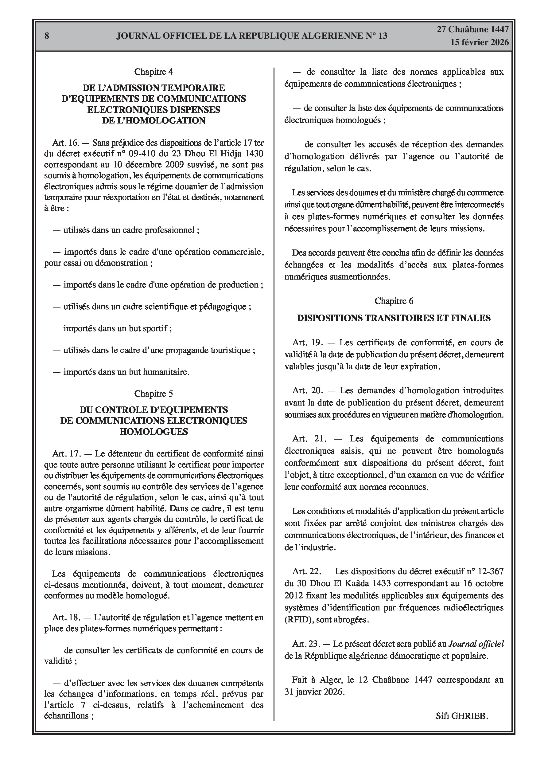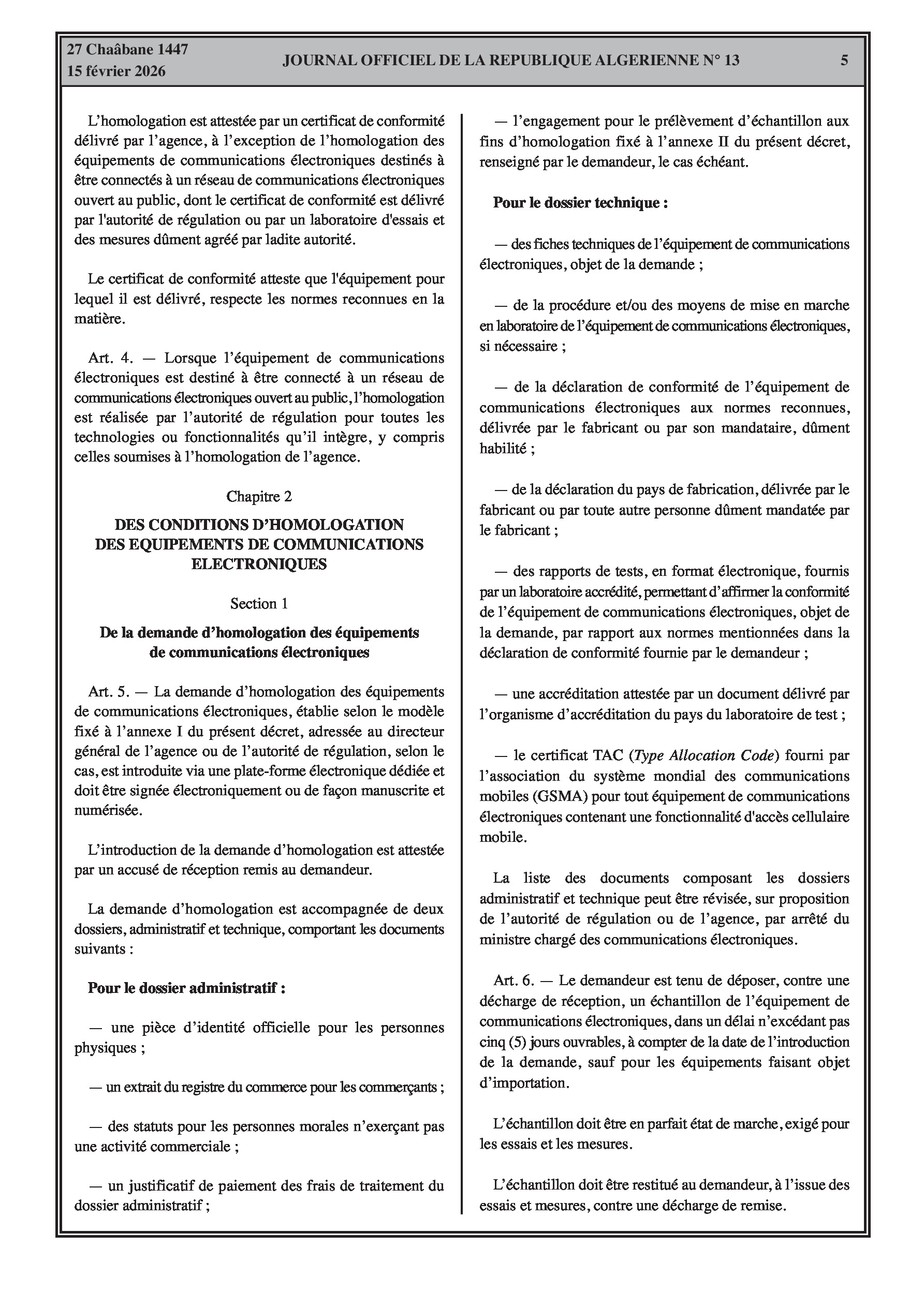 Fixation des conditions et modalités d'homologation des équipements de communications avant leur importation ou vente.