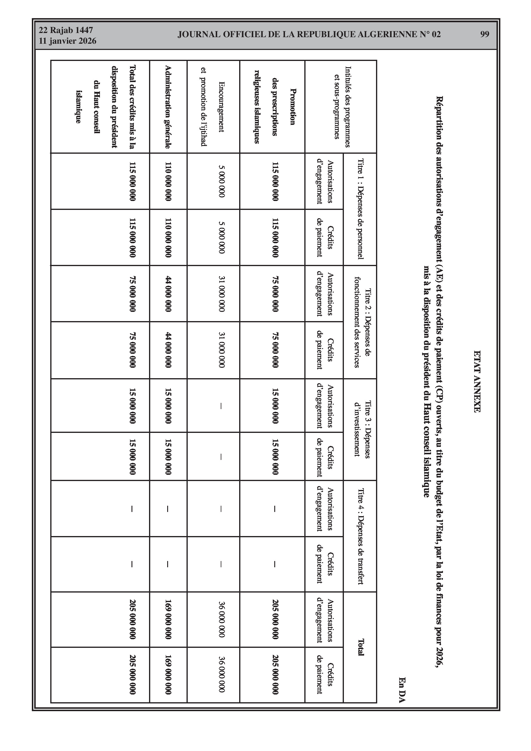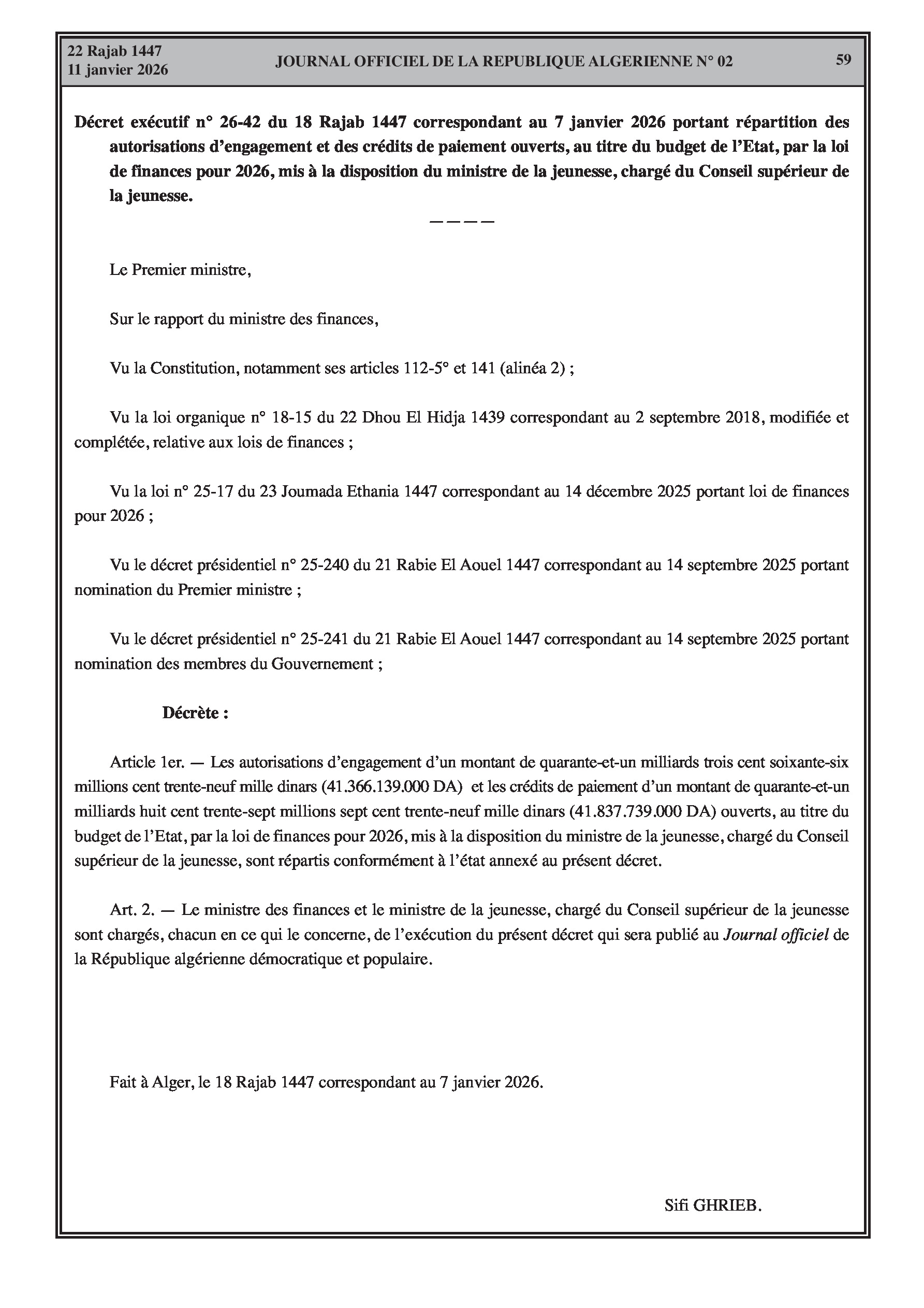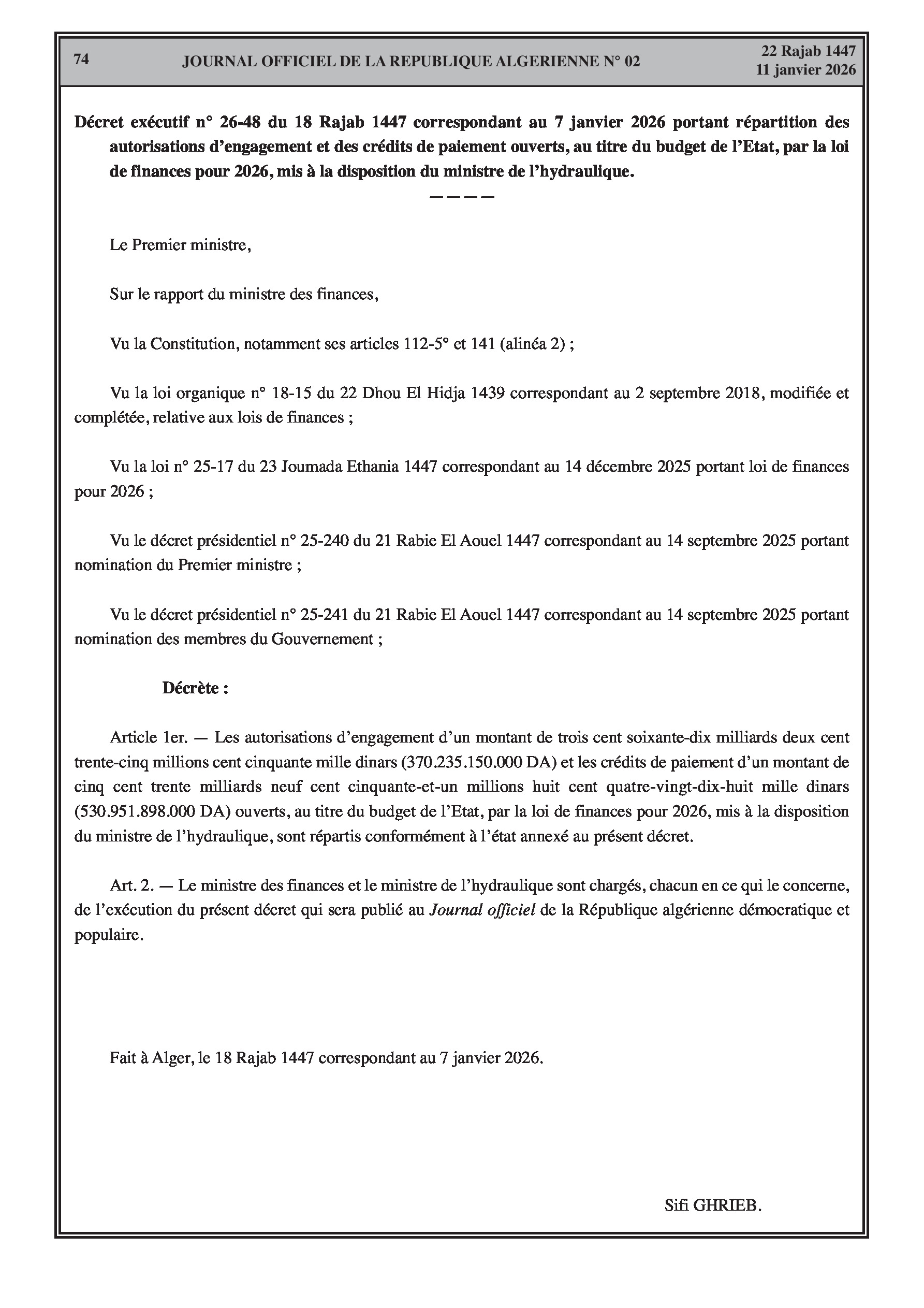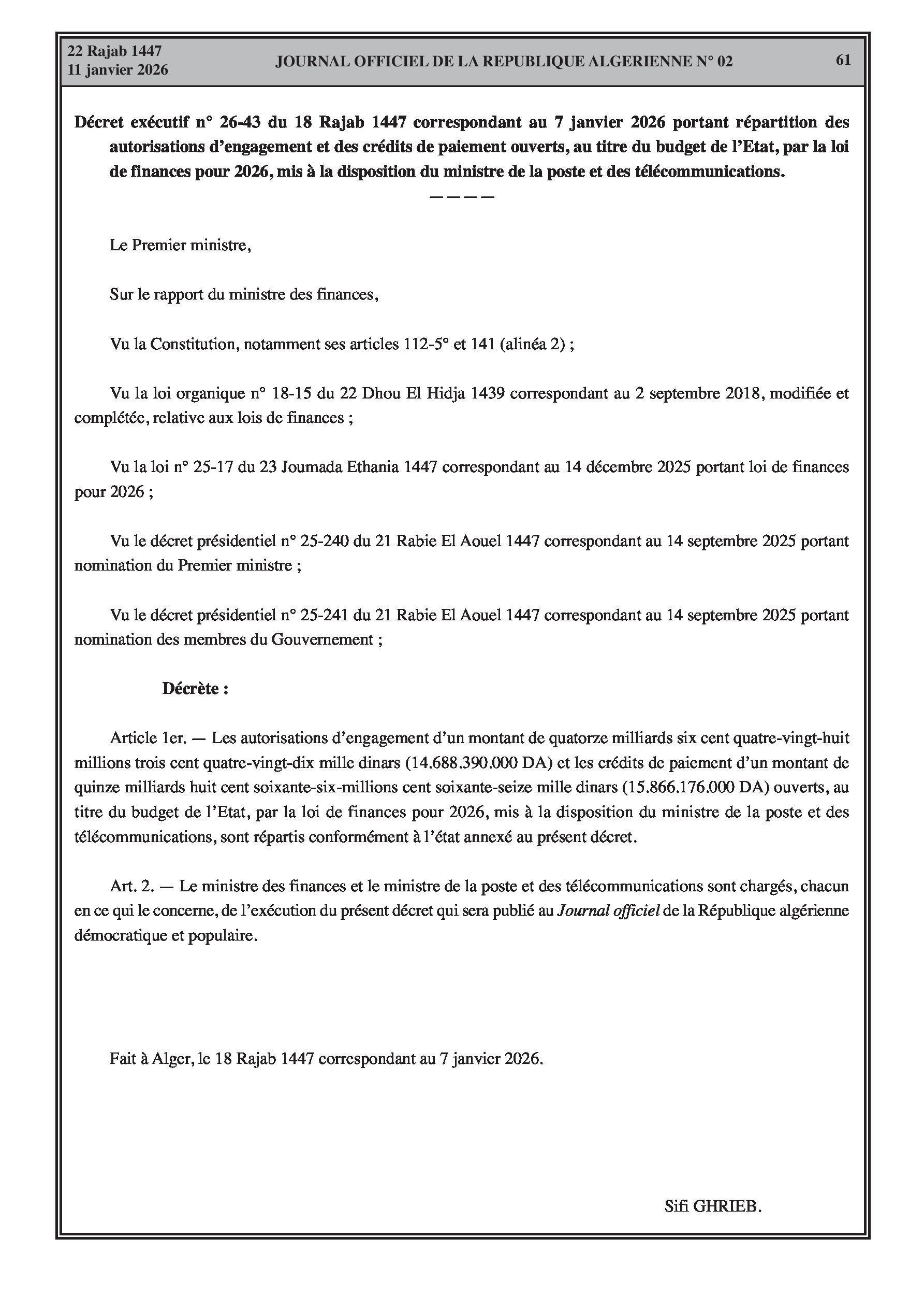 Budgets alloués aux Moudjahidine, à l'Industrie, l'Agriculture, l'Énergie et au Commerce.