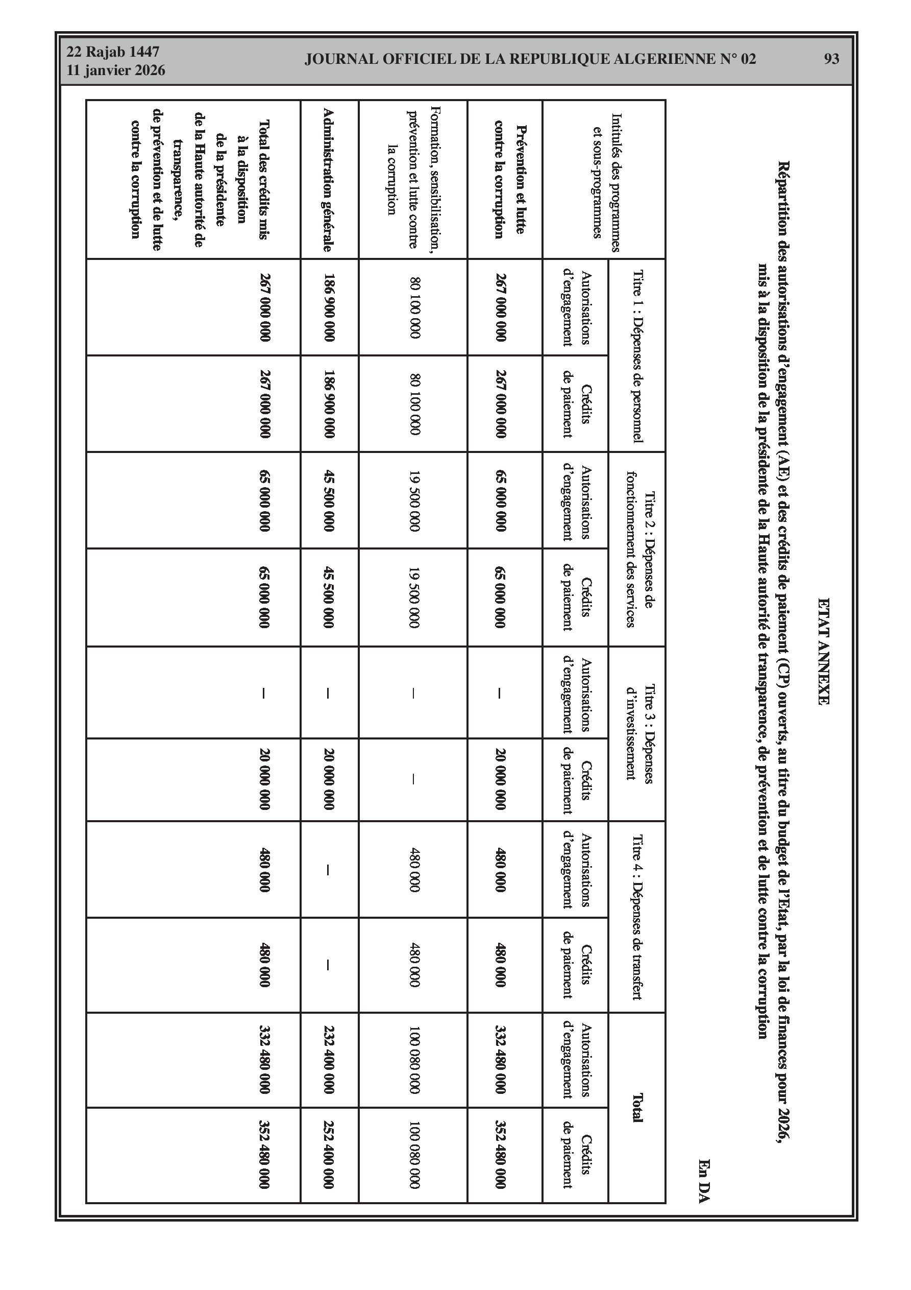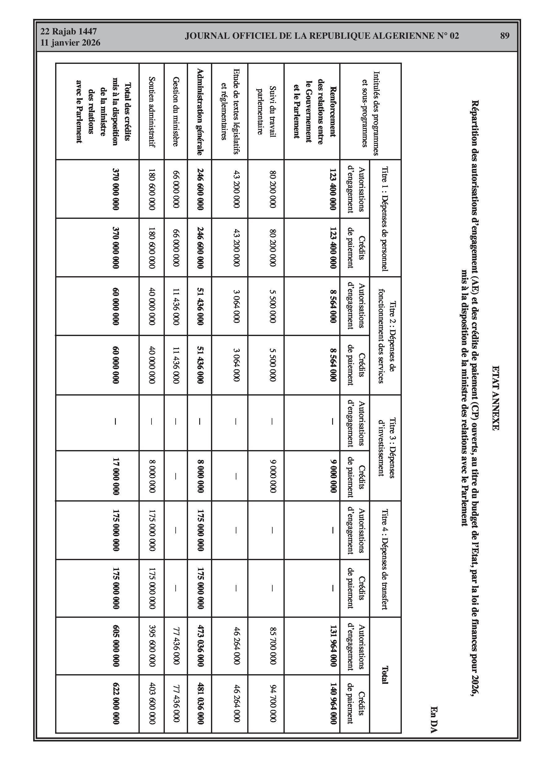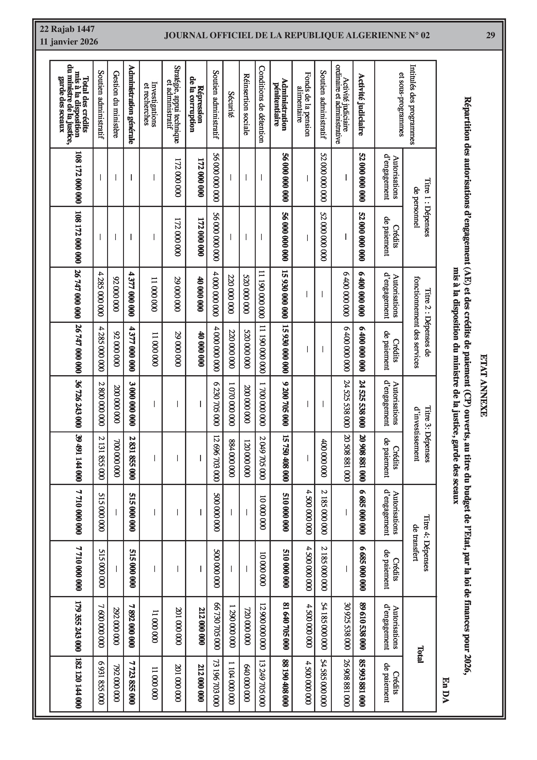 Répartition des crédits pour la Présidence, le Parlement, les juridictions, le Ministère de l'Intérieur et le Ministère de la Justice.