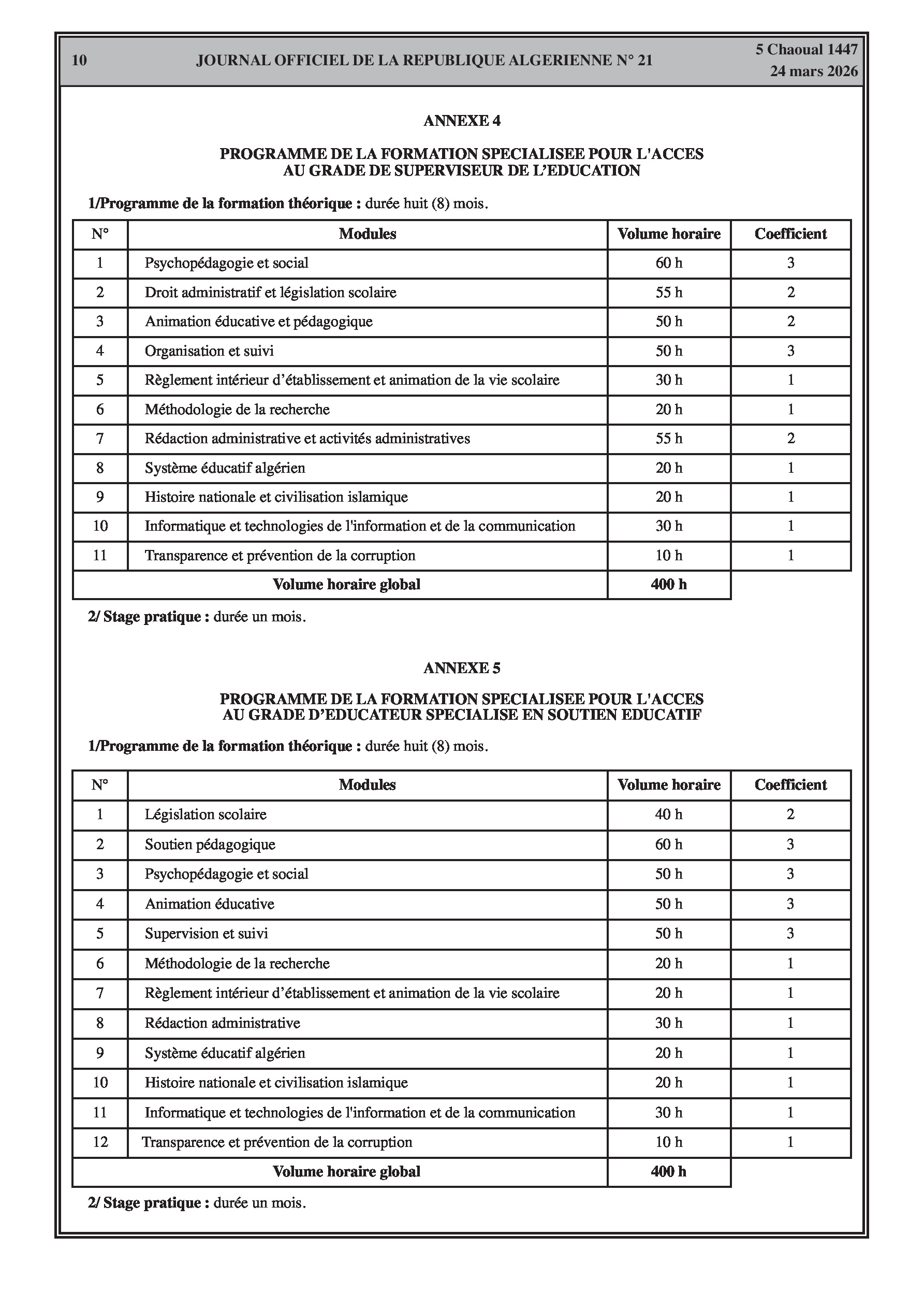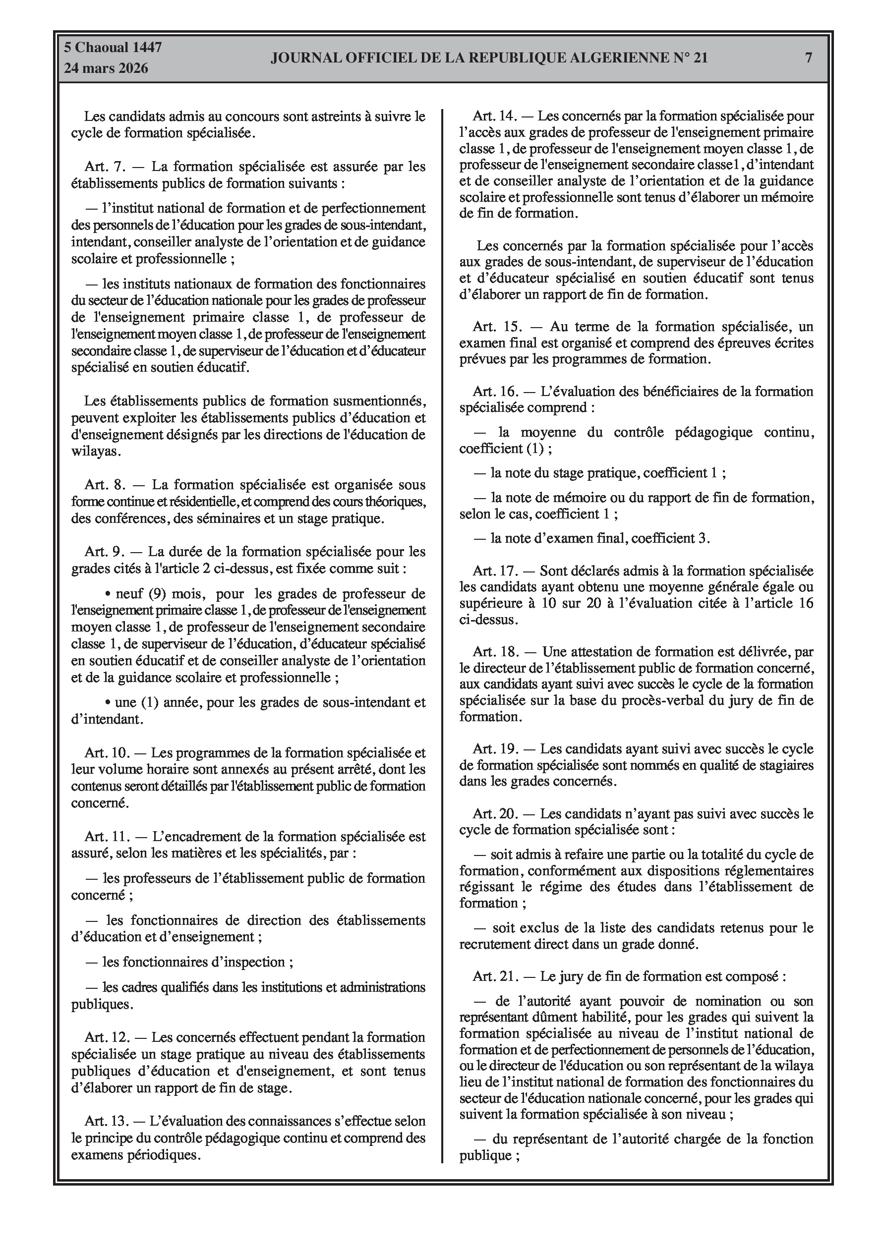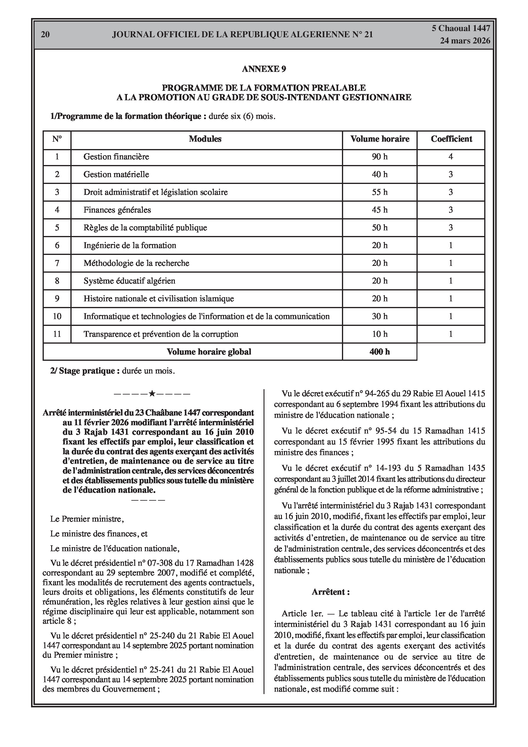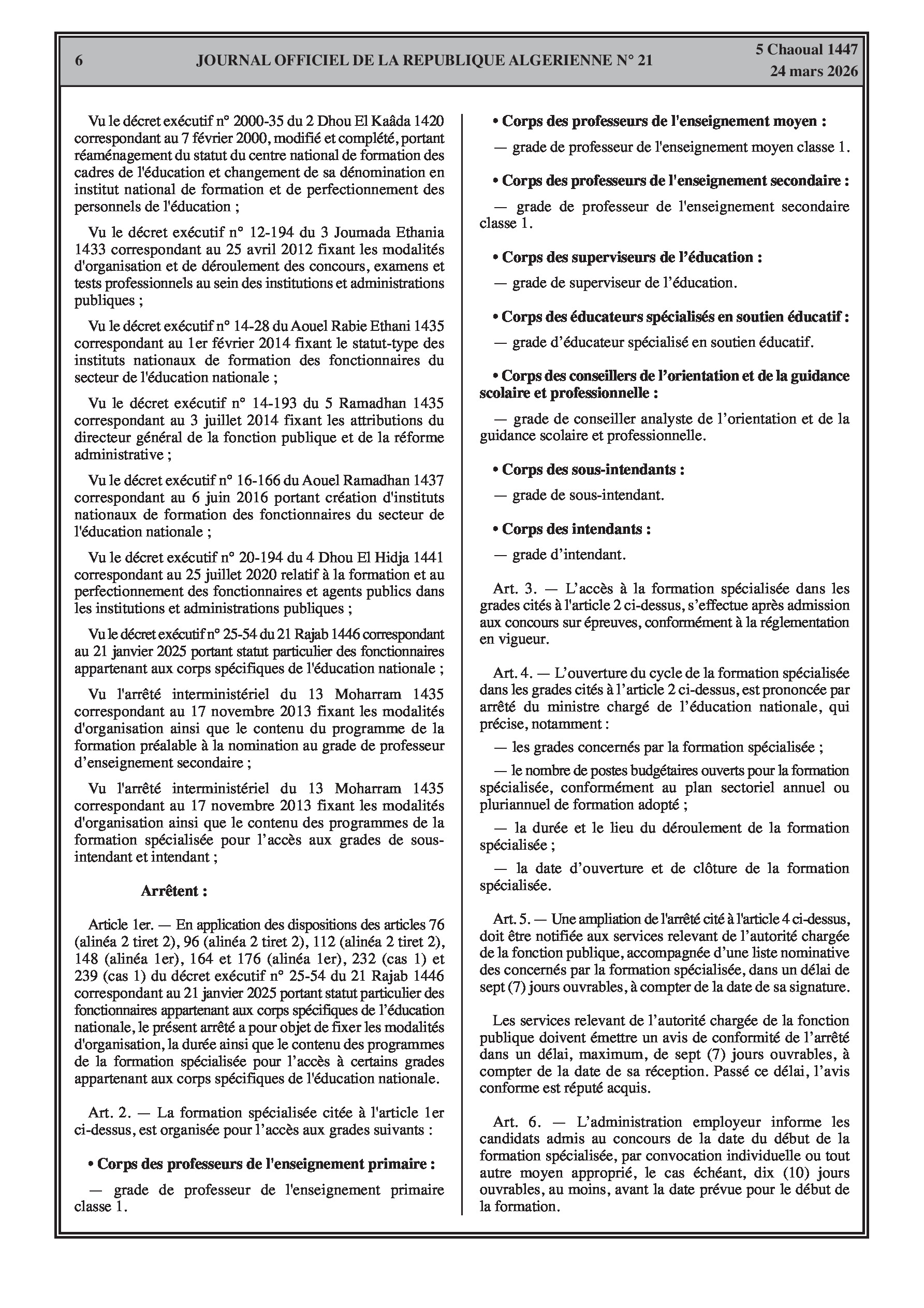 Fixation de l'organisation, de la durée et du contenu des formations spécialisées pour l'accès et la promotion aux grades de l'éducation (enseignants, superviseurs, intendants, laborantins). Modification des effectifs et contrats des agents d'entretien.