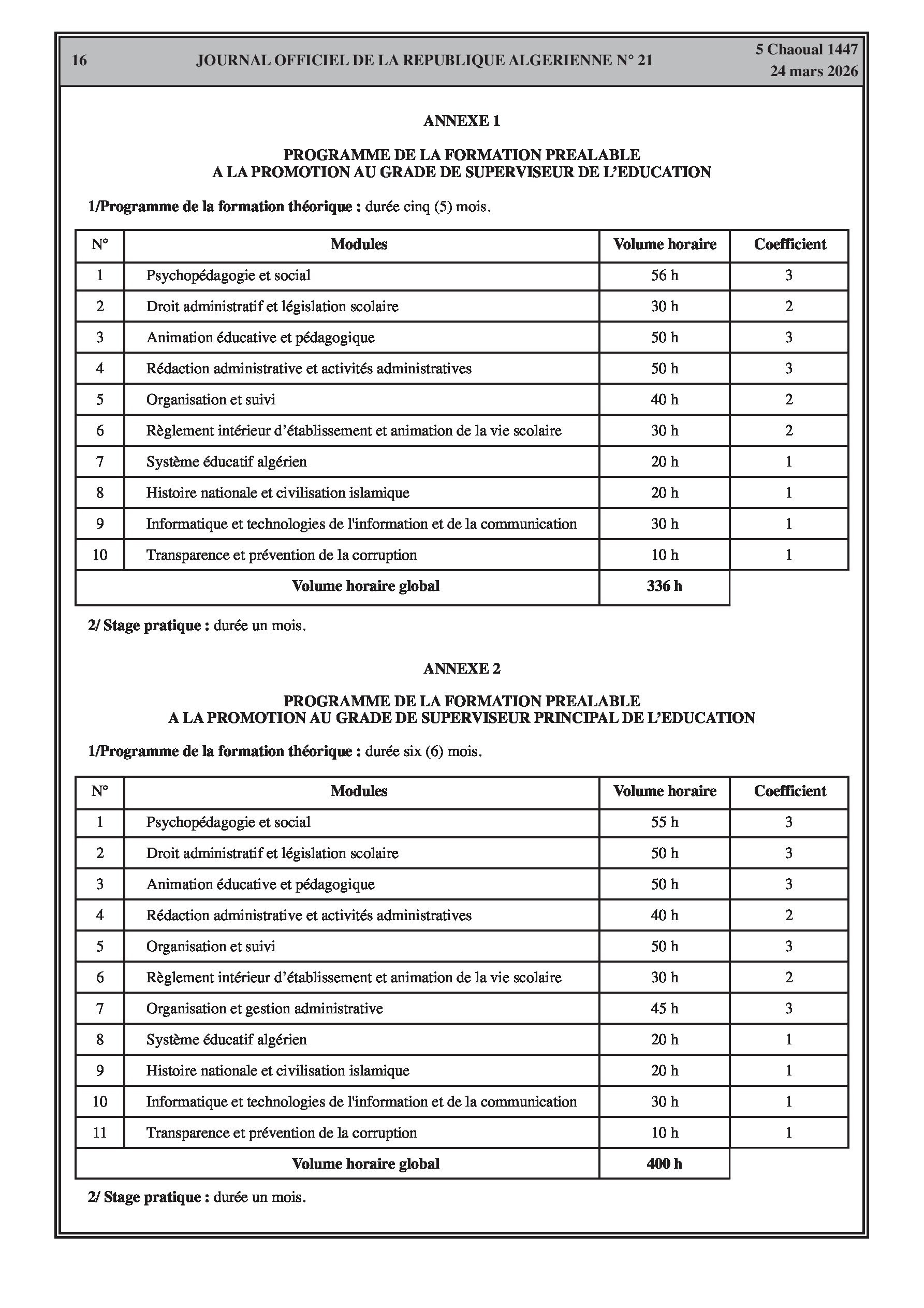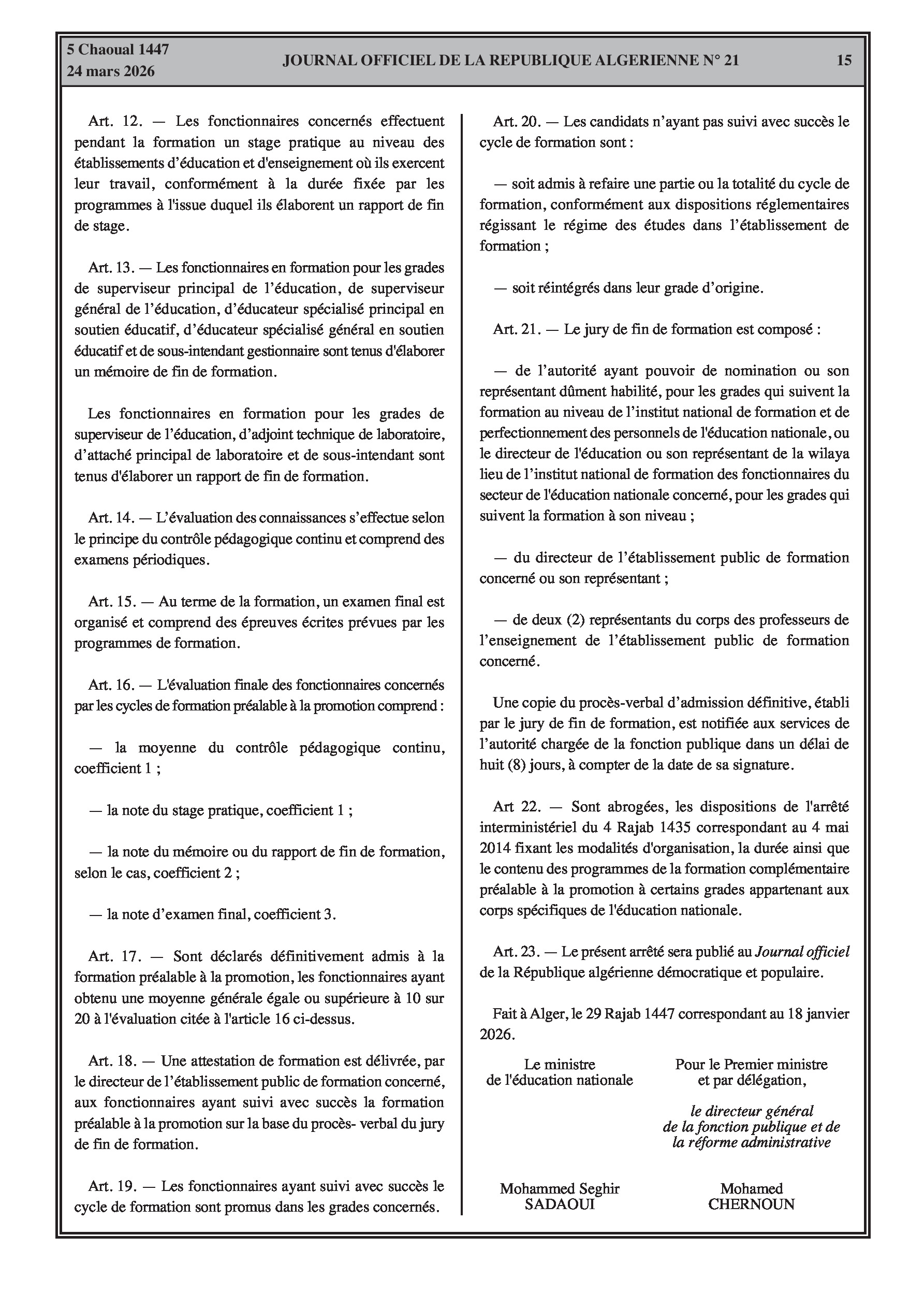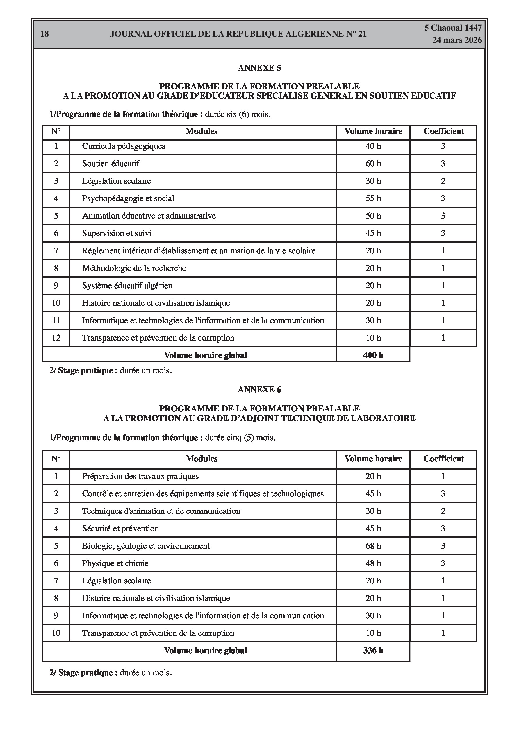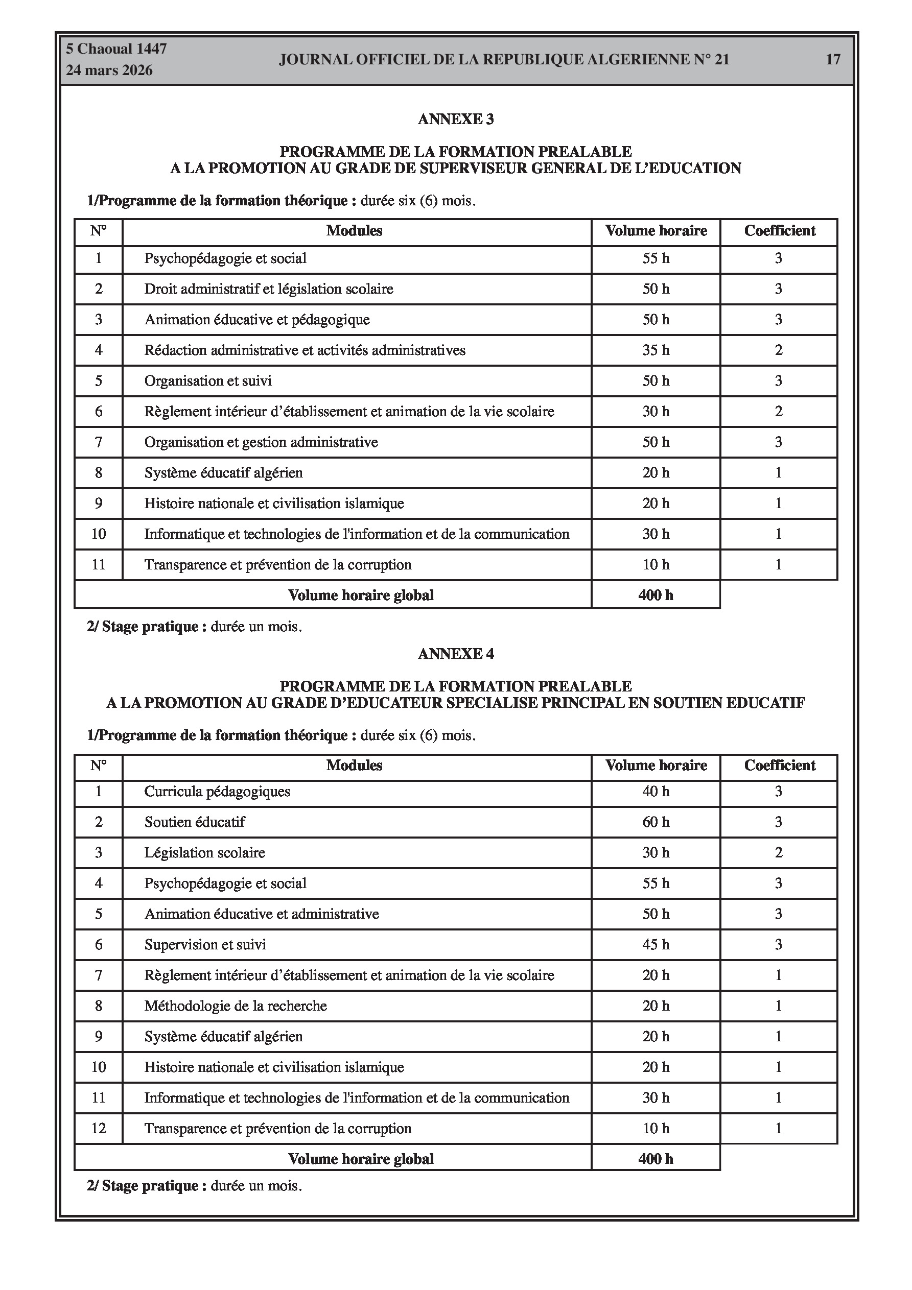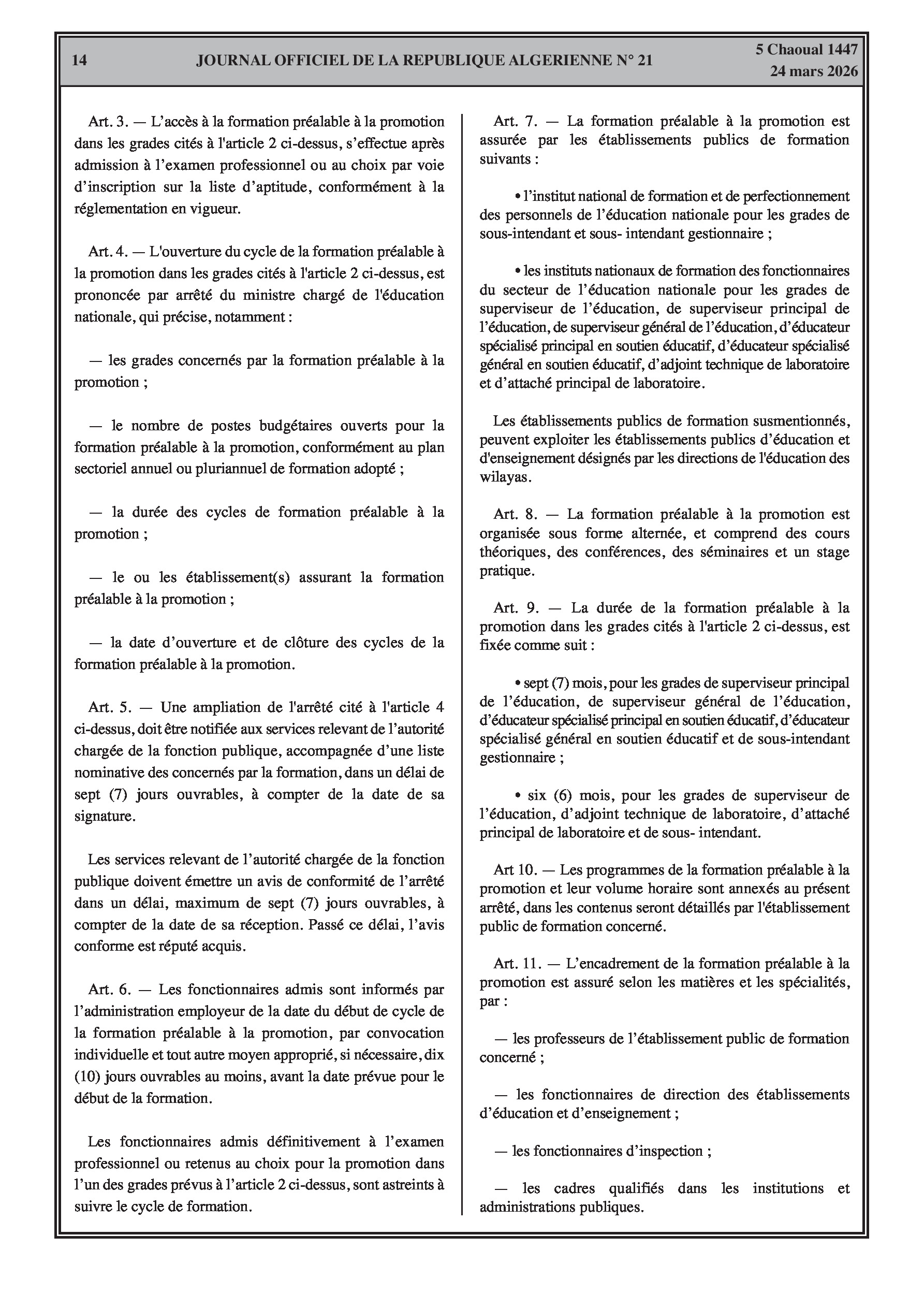 Fixation de l'organisation, de la durée et du contenu des formations spécialisées pour l'accès et la promotion aux grades de l'éducation (enseignants, superviseurs, intendants, laborantins). Modification des effectifs et contrats des agents d'entretien.