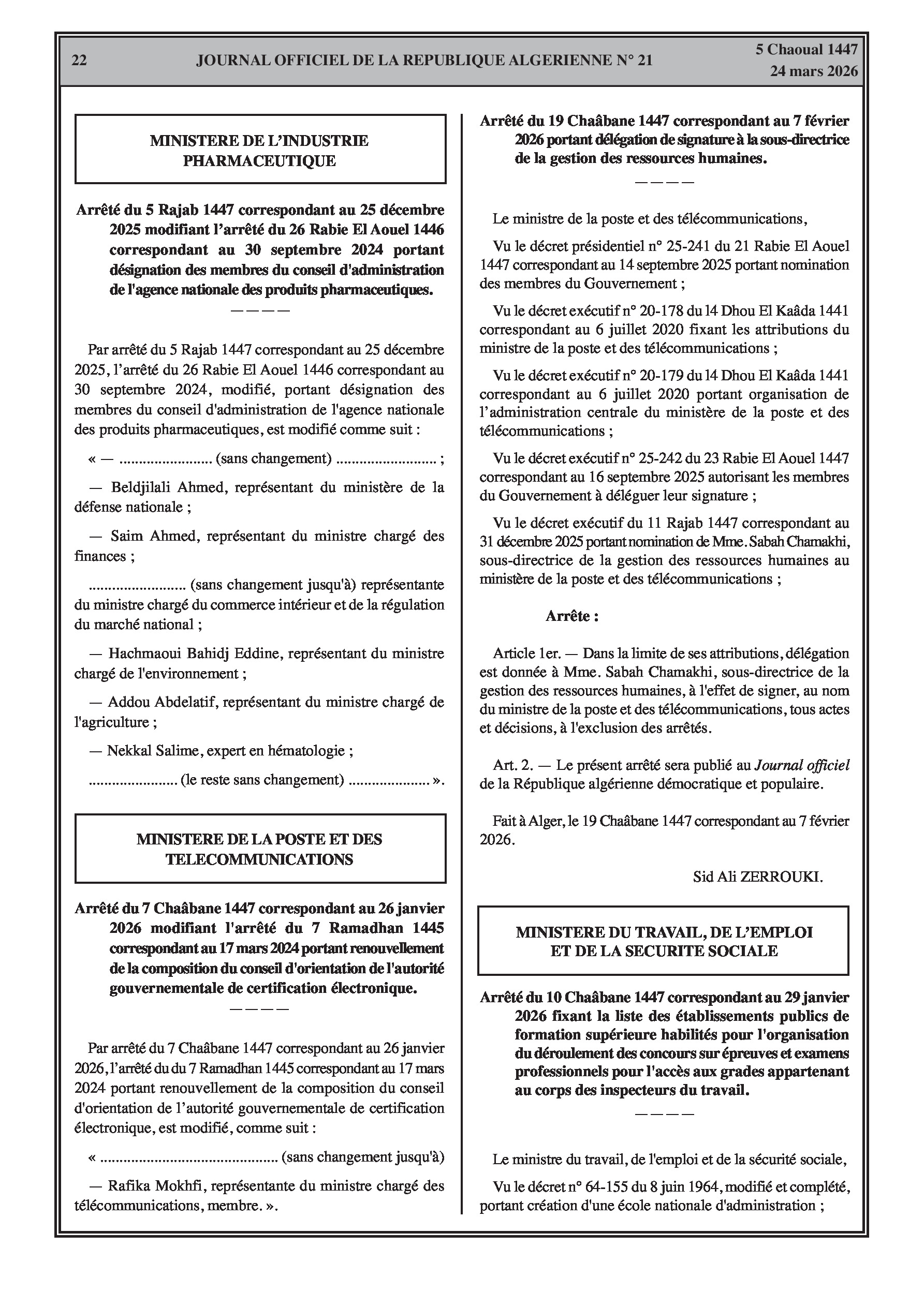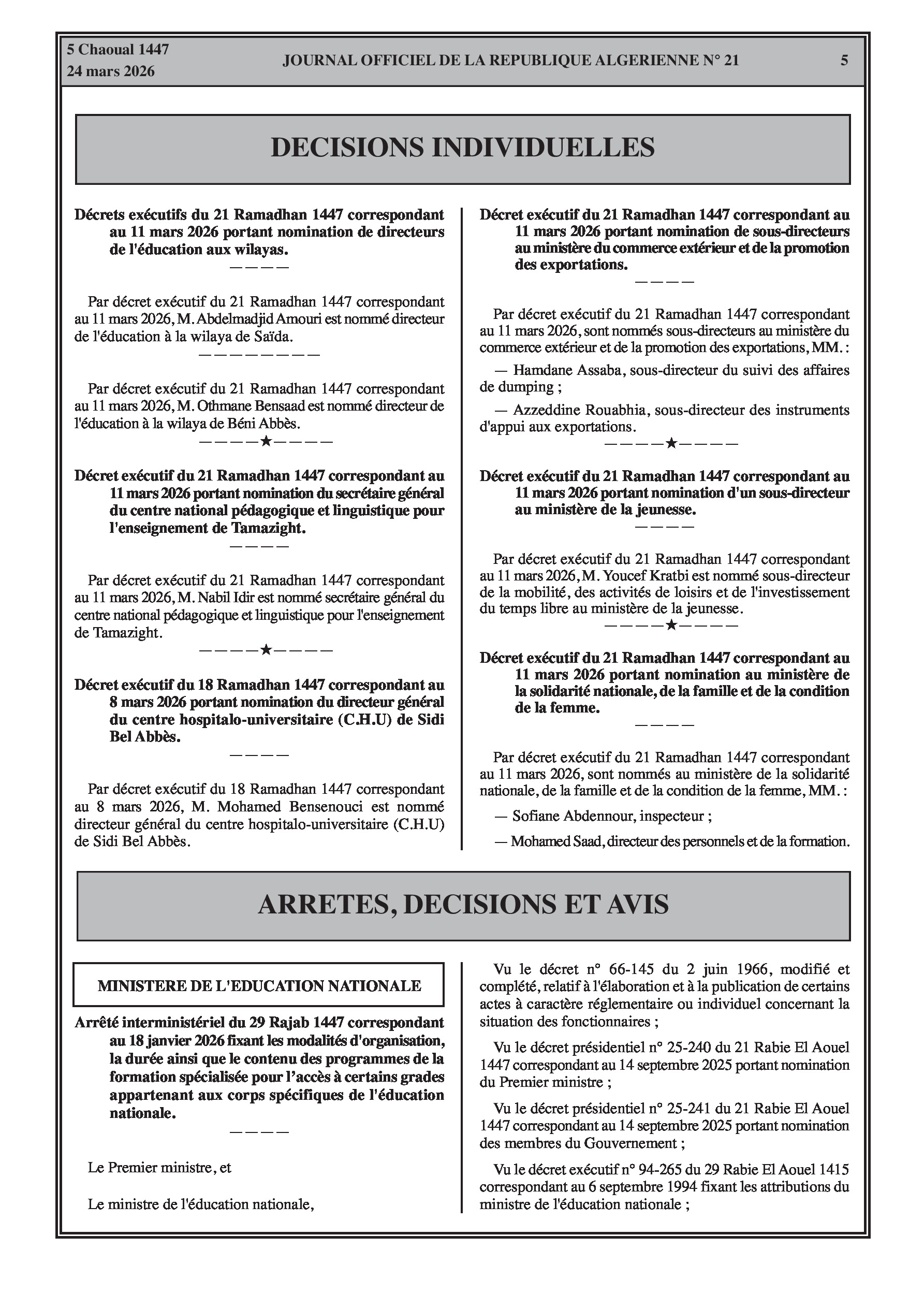Nominations de directeurs (Éducation, Jeunesse, Solidarité, Commerce, CHU Sidi Bel Abbès). Prolongation des indemnités pour le personnel d'organisation des Jeux d'Oran 2022 jusqu'à fin 2024.
