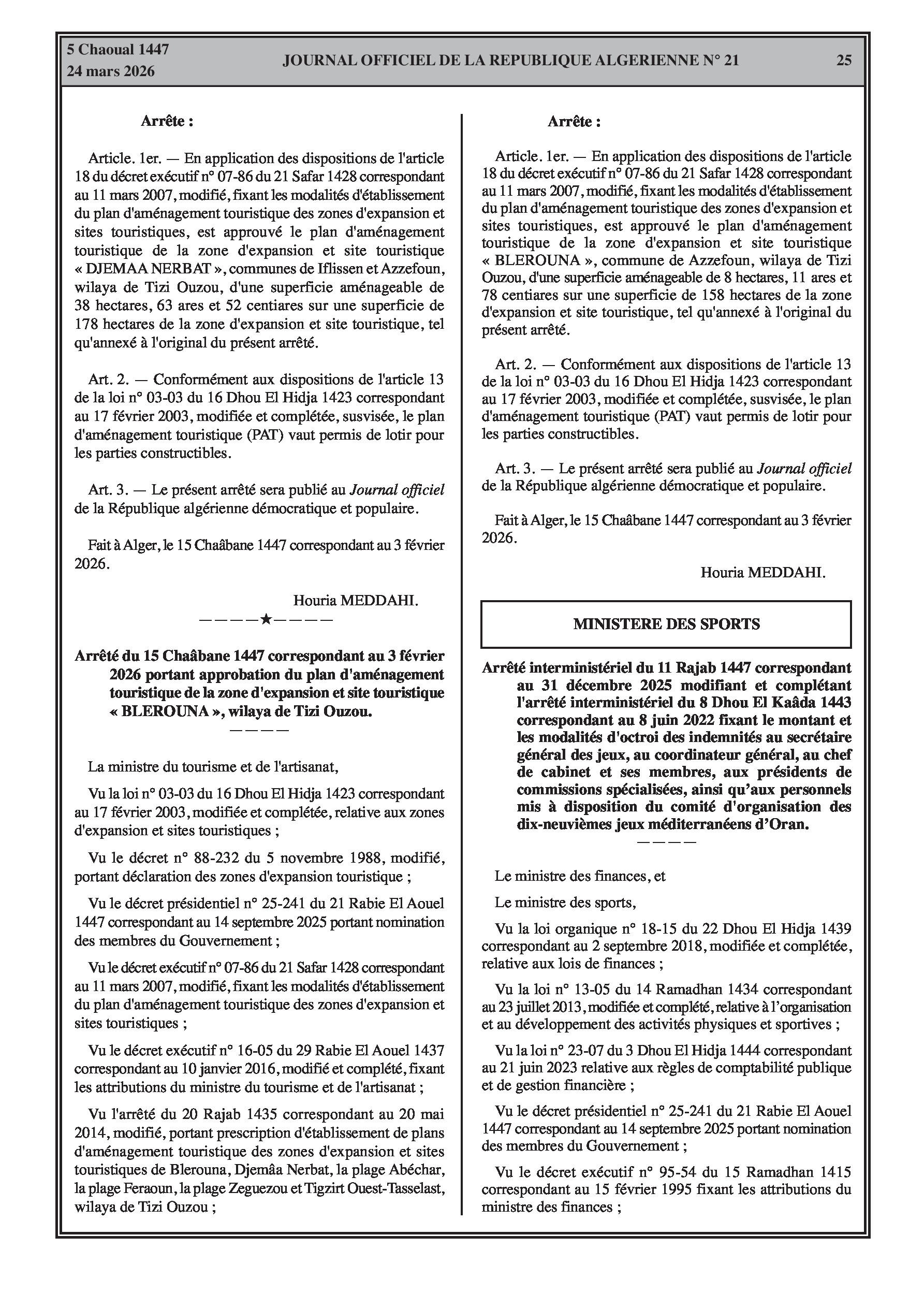Approbation des plans d'aménagement touristique des zones d'expansion DJEMAA NERBAT et BLEROUNA offrant des superficies aménageables.